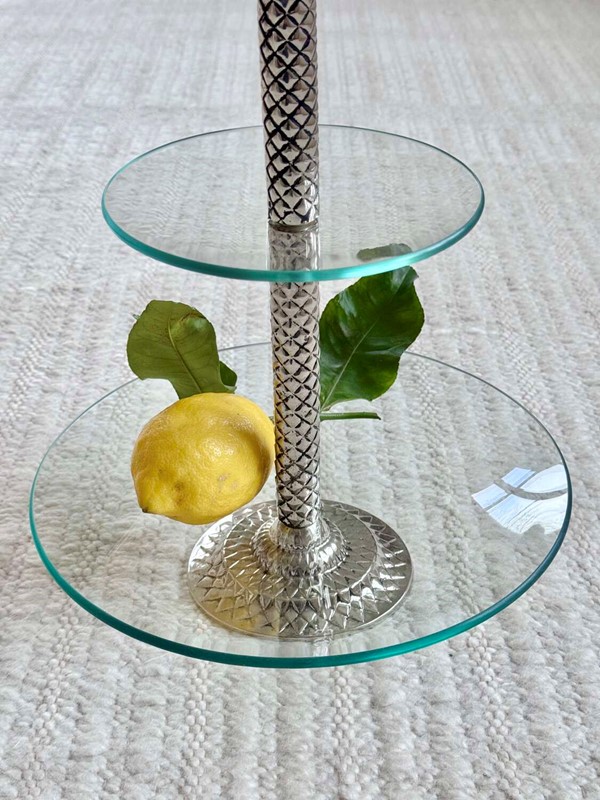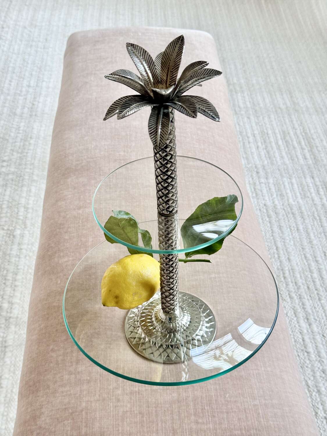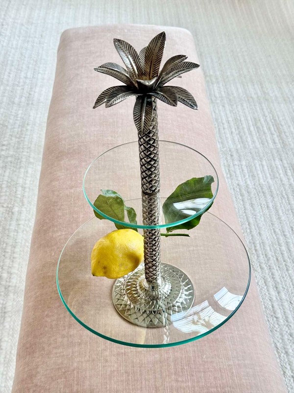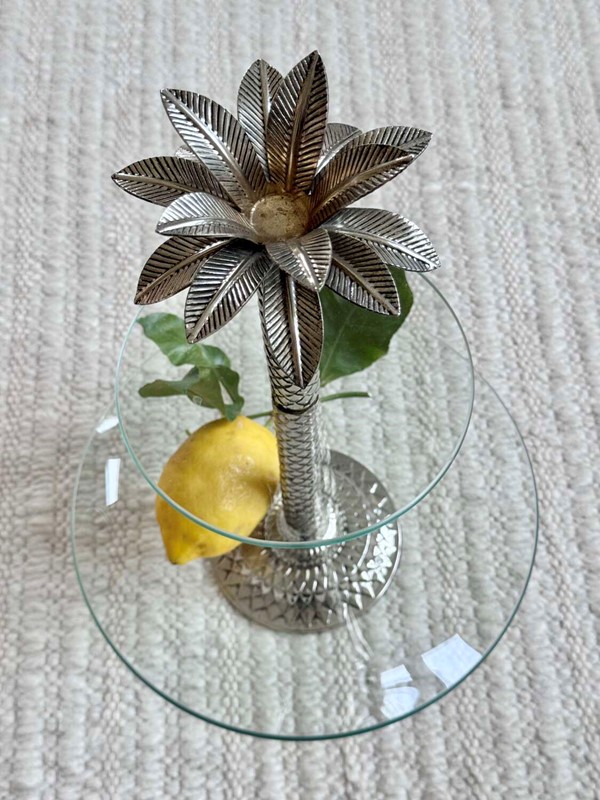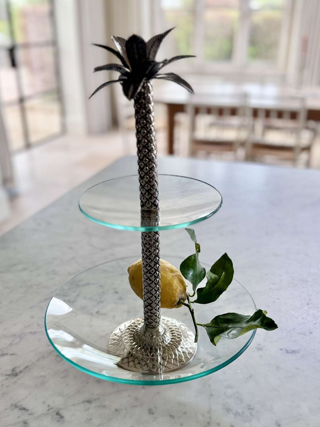 A dramatic tall vintage Italian glass and silver plated palm street cake or fruit centrepiece stand, circa 1970/80. This versatile centrepiece comprises two glass plates balancing on a palm tree stem, with flaring palm leaves finial top, which can also be used as a candlestick. Pure Hollywood Regency glamour and fun.