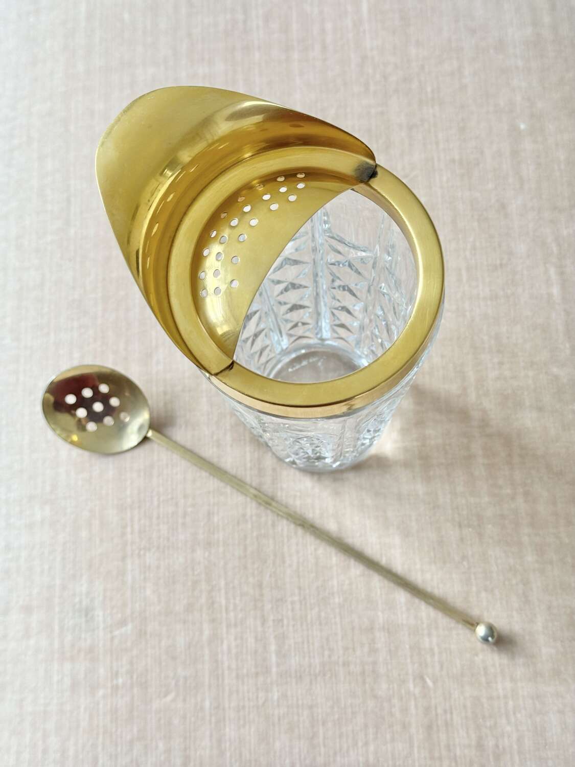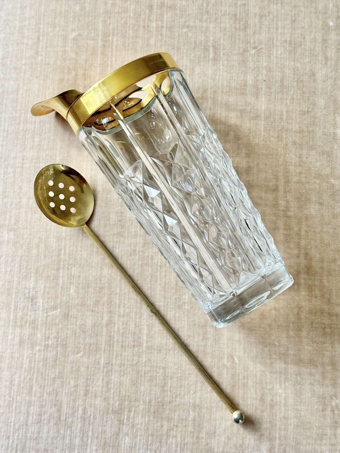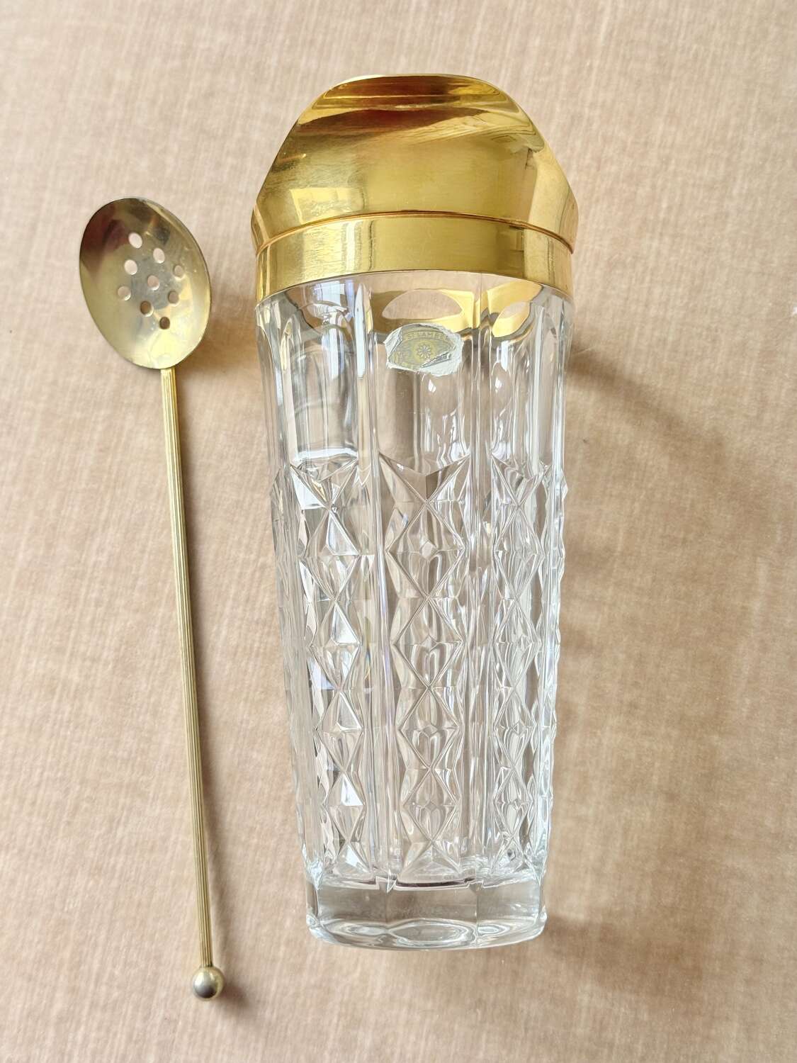 Beautiful Mid 20th Century gold plated crystal martini cocktail mixing jug by Val Saint Lambert, Circa 1960, with gold plated cocktail stirring spoon. The jug still retains fragments of the original branded VSL sticker. 21cmhigh 12cm widest 9cm diameter