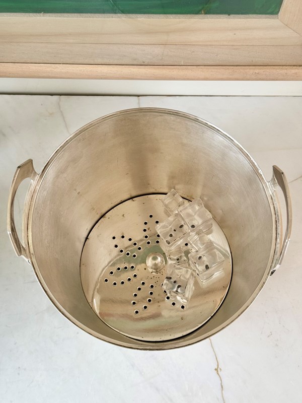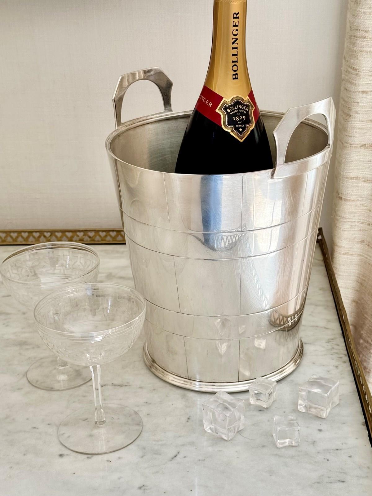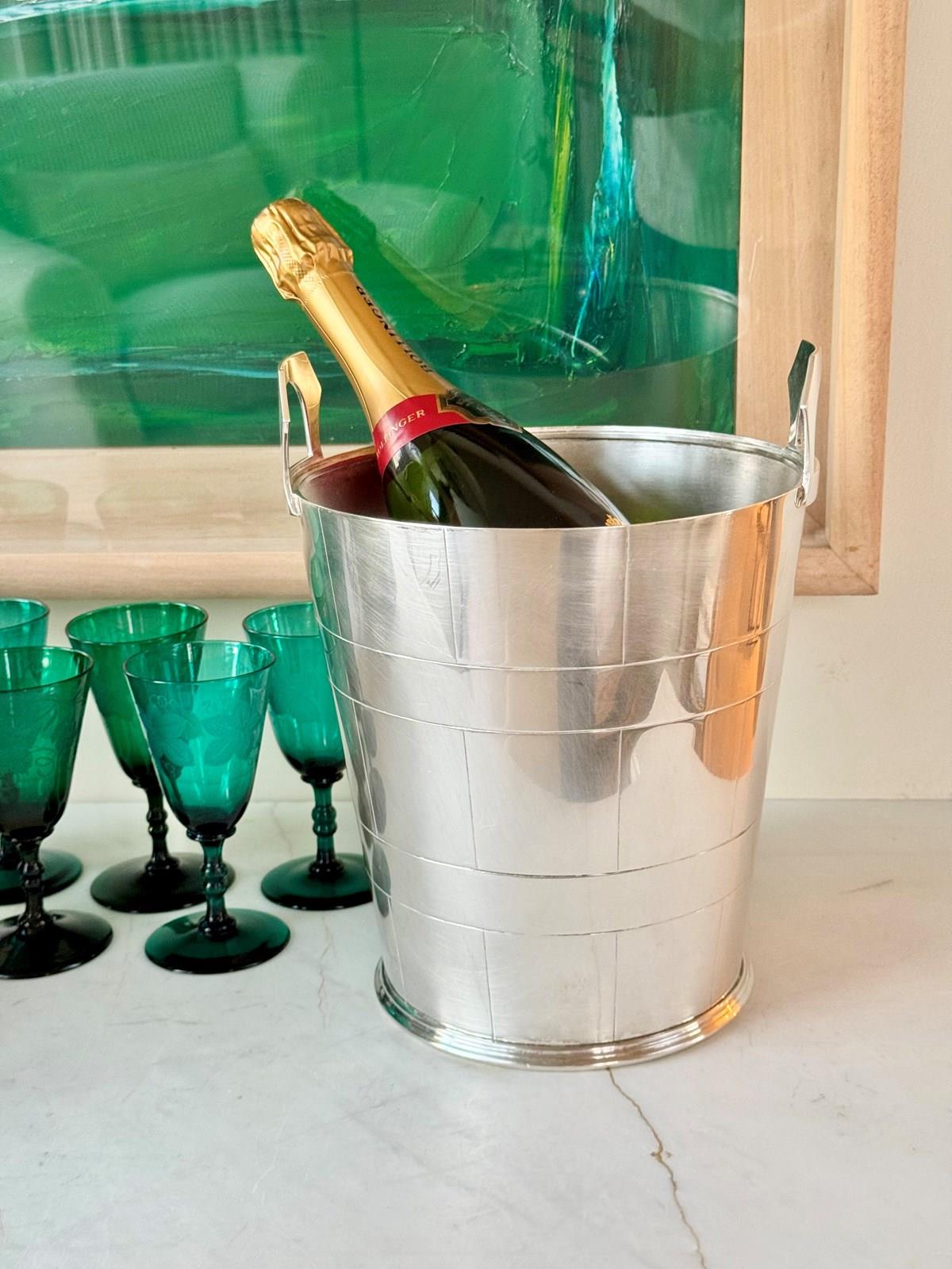 A stunning Edwardian English silver plated champagne or wine cooler, crafted to resemble a coopered bucket, Circa 1910, with makers mark to the base for Daniel & Arter Silversmiths, who were active between 1882-1930. This large ice bucket has a removable drop-in pierced disk to allow melted ice to drain away whilst still keeping the ice and bottle dry but chilled.