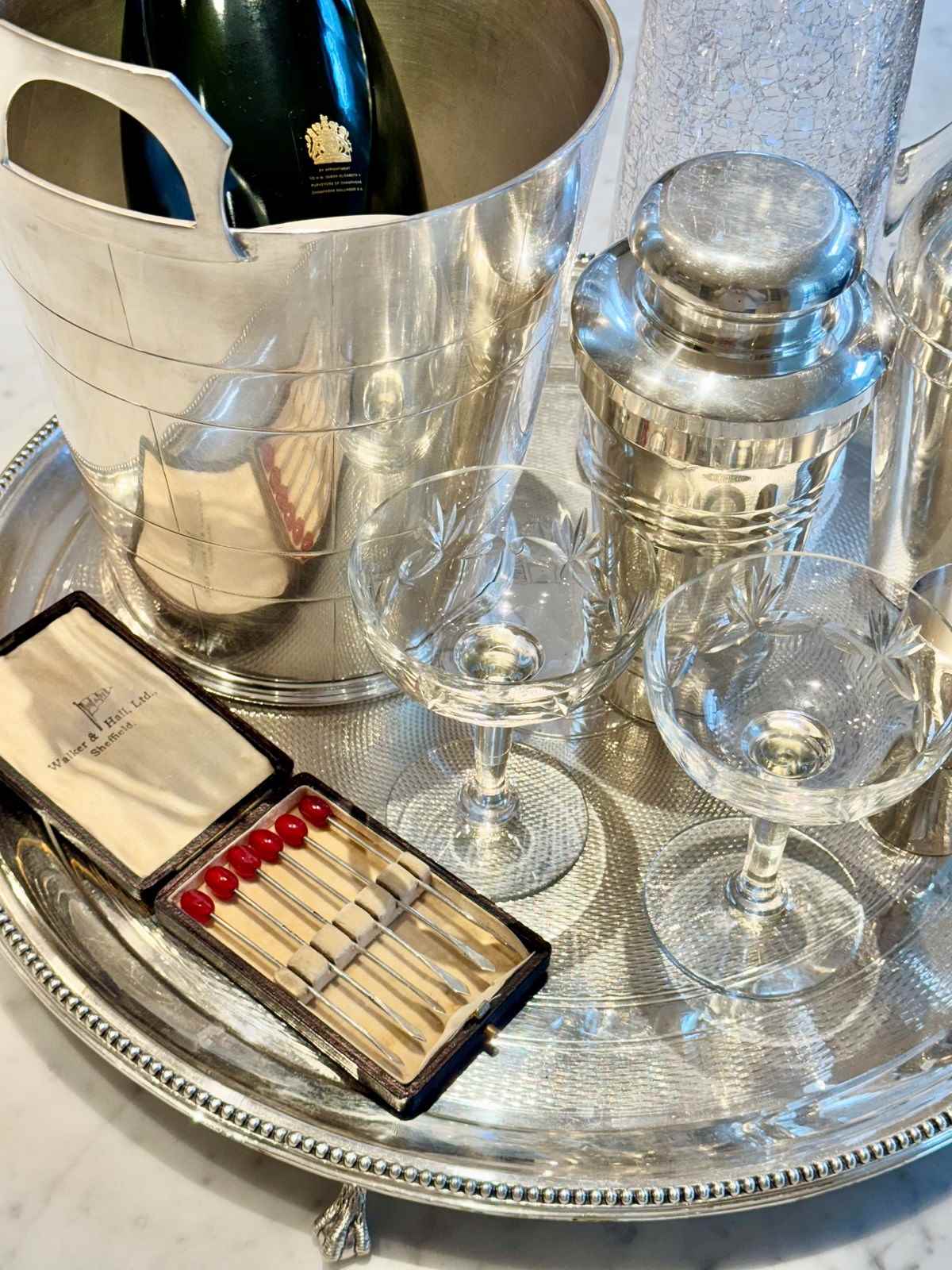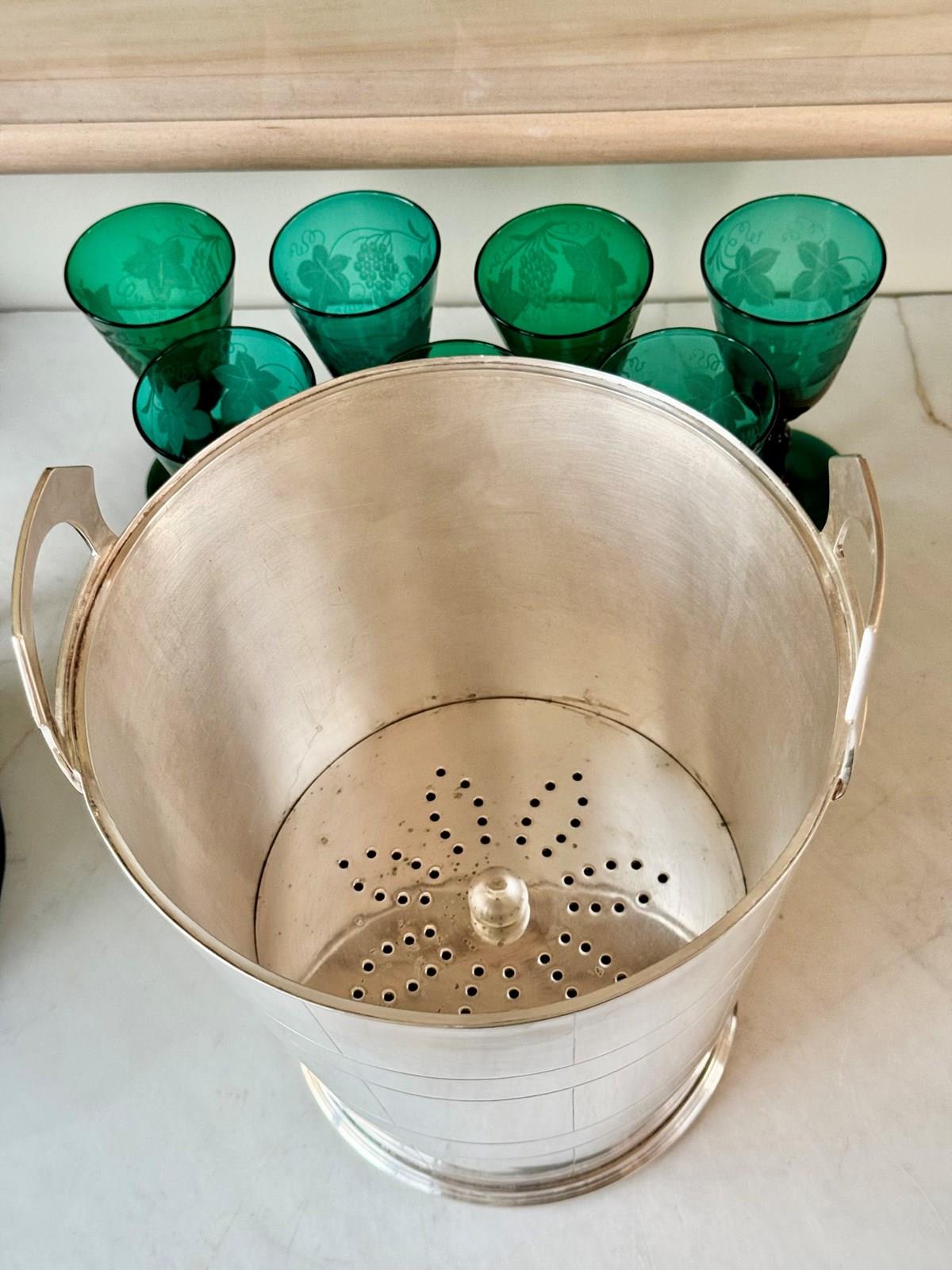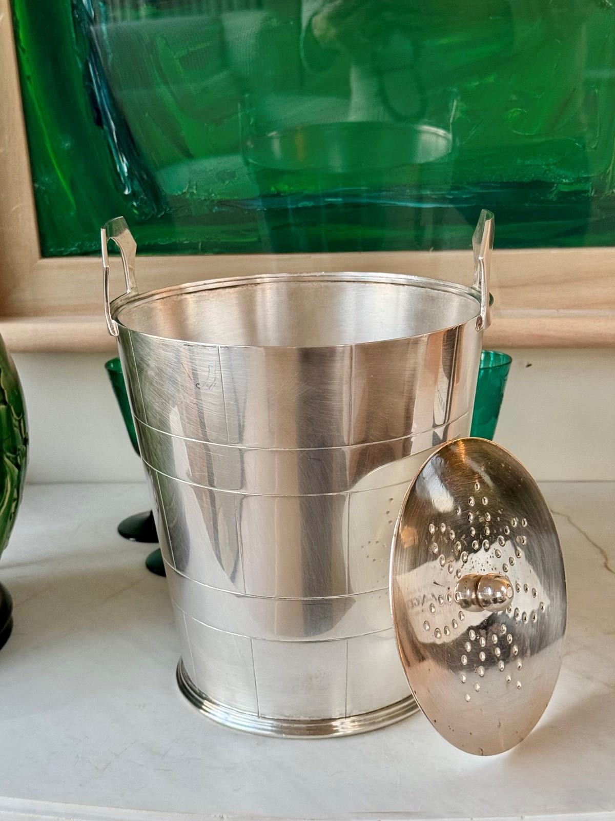 A stunning Edwardian English silver plated champagne or wine cooler, crafted to resemble a coopered bucket, Circa 1910, with makers mark to the base for Daniel & Arter Silversmiths, who were active between 1882-1930. This large ice bucket has a removable drop-in pierced disk to allow melted ice to drain away whilst still keeping the ice and bottle dry but chilled.