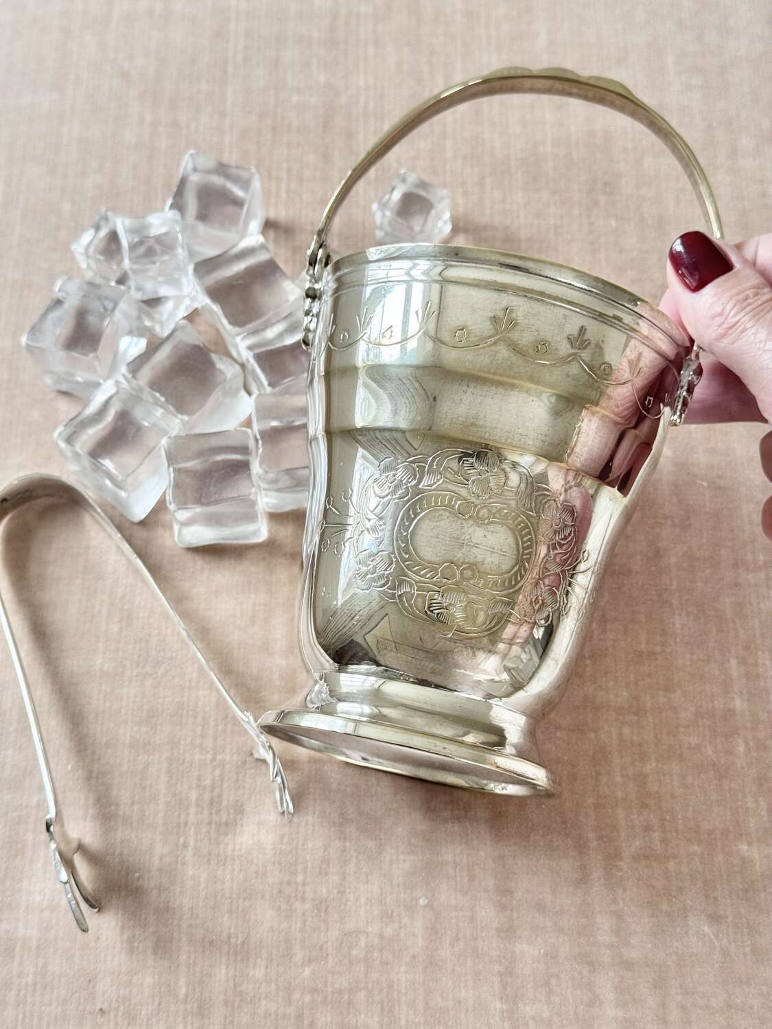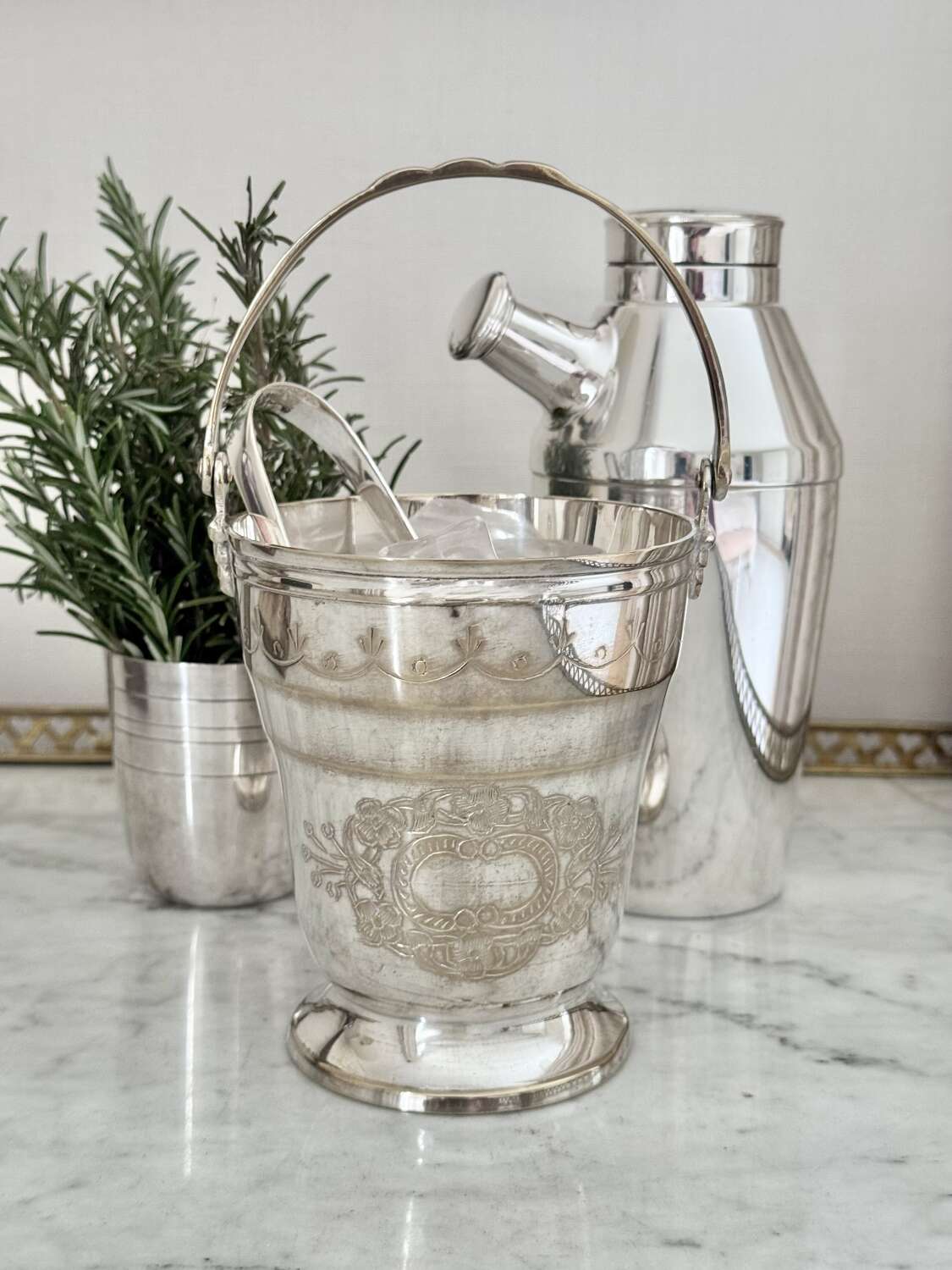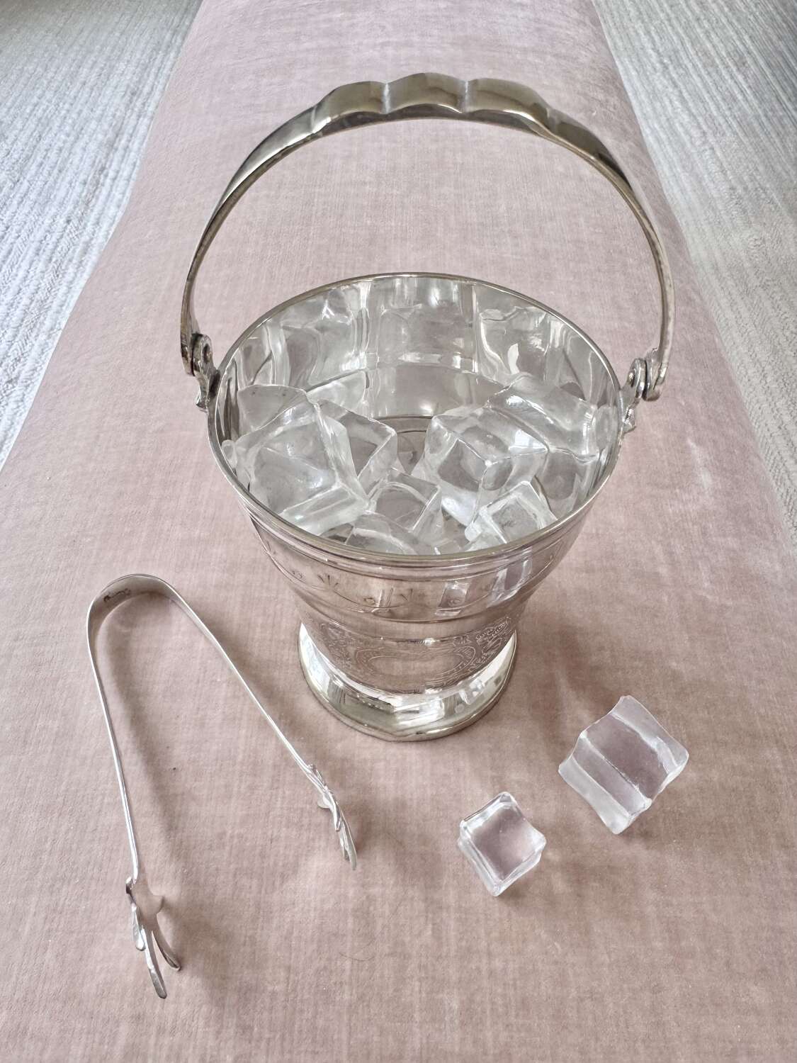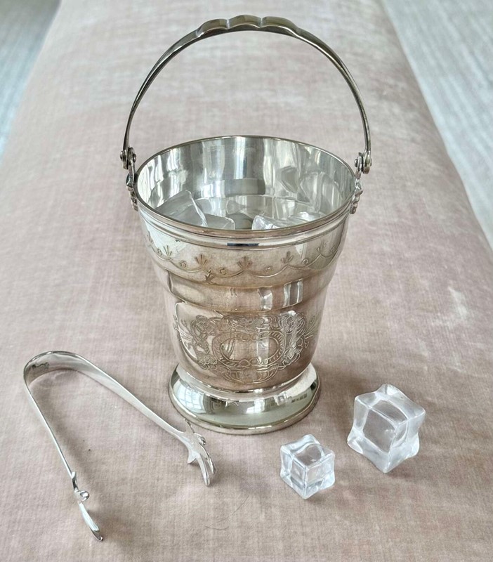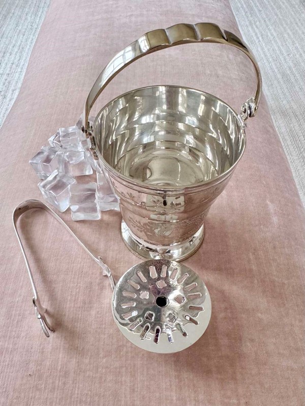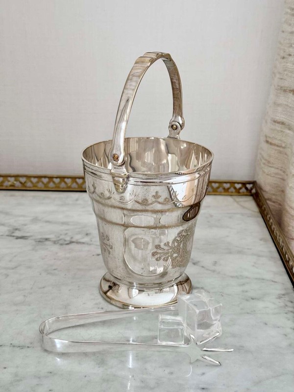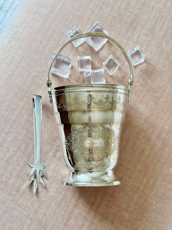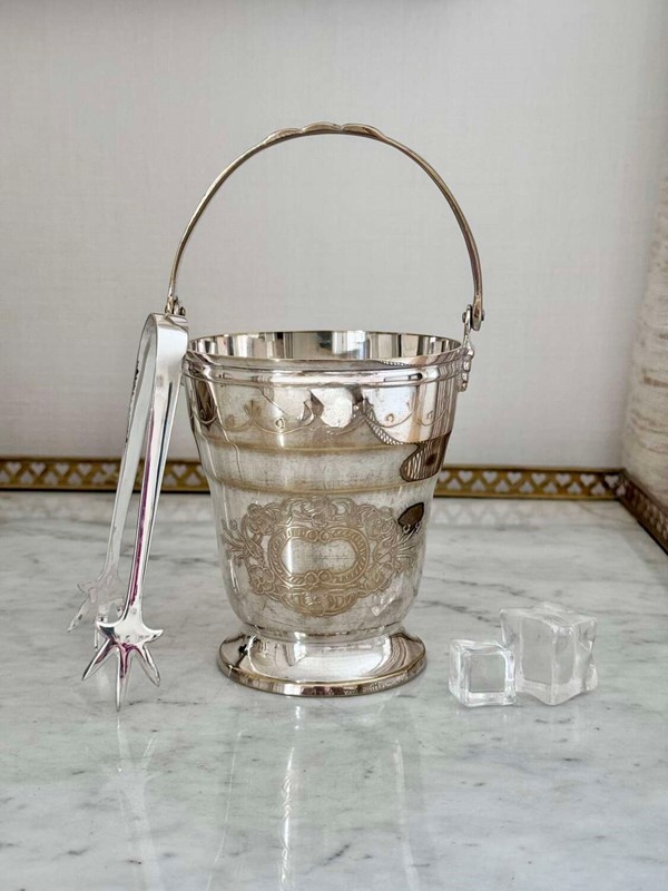 Mid 20C silver plated swing handled ice bucket & tongs set