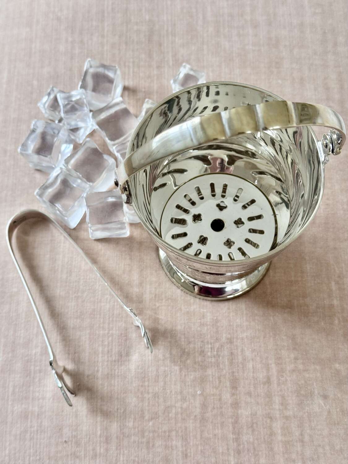 A splendid Mid 20th Century Continental silver plated on brass swing-handled ice bucket with original pierced and removable ice melt tray and a pair of silver plated 'Claw' ice tongs. A great little addition to a home bar set up.