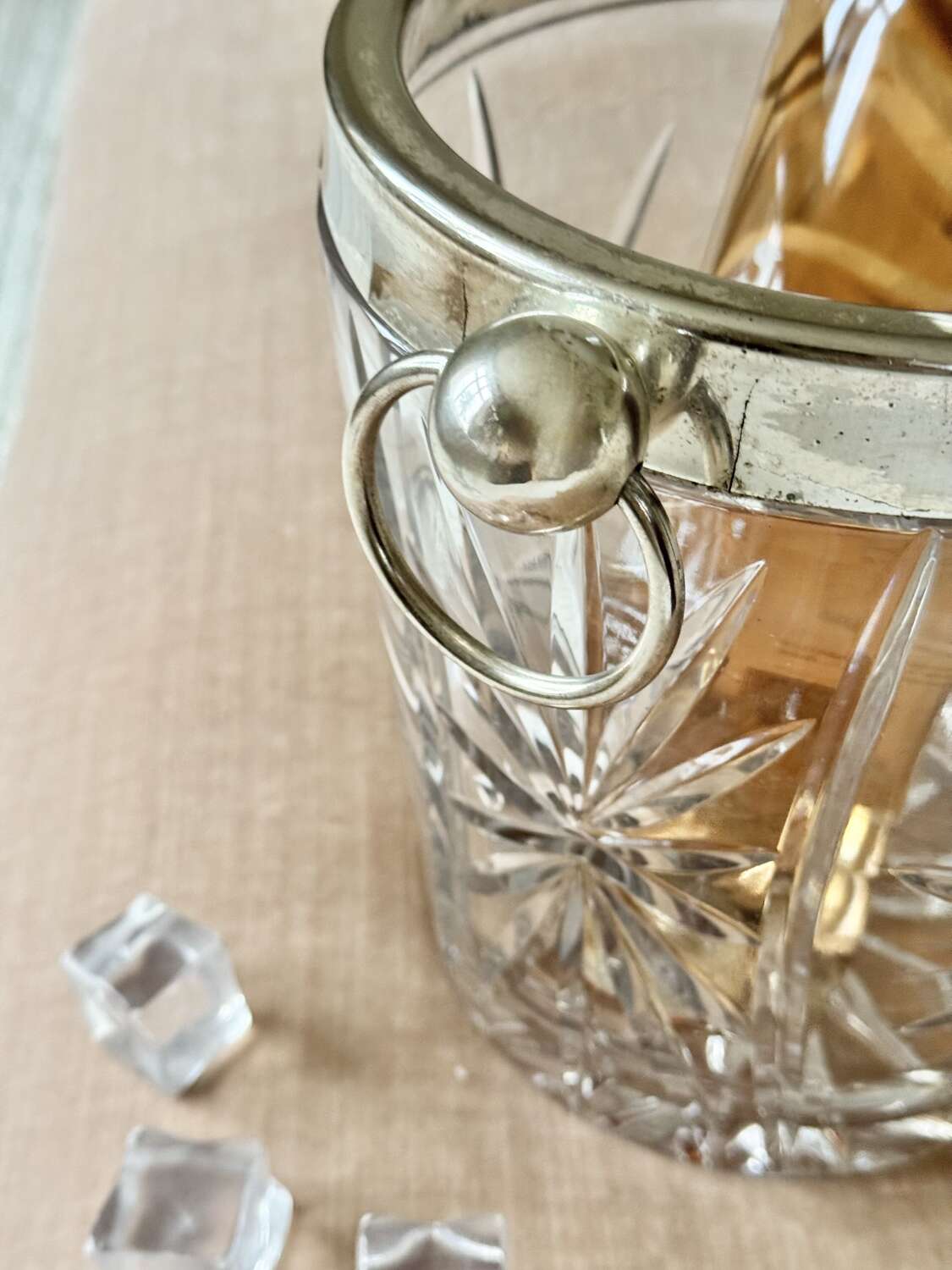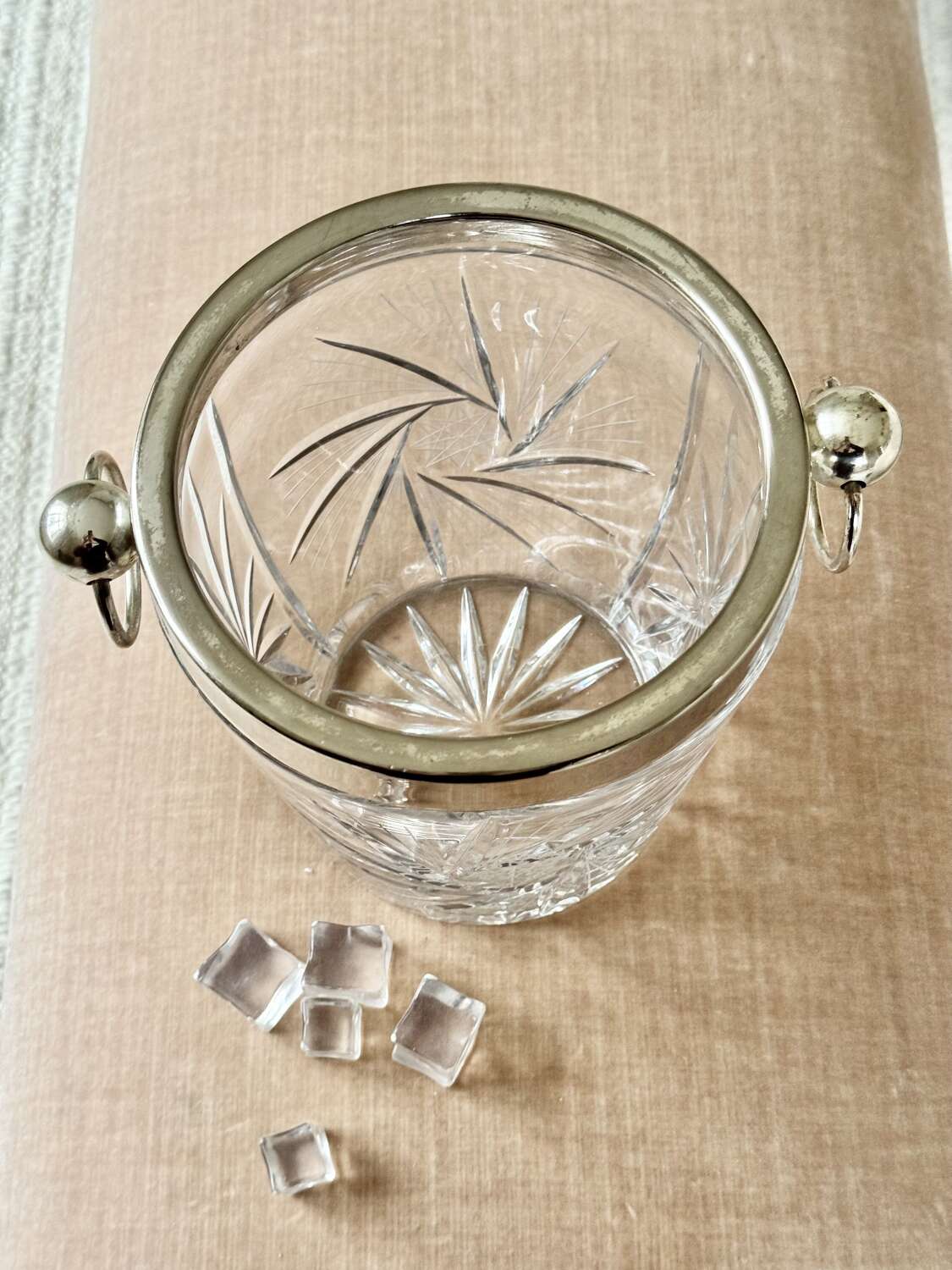 A fabulous, Mid 20th Century French, large scale, star cut glass champagne wine bucket or cooler, with spiralling stars and chrome rim wtih twin ring handles. This splendid piece of vintage barware is bonkers heavy (3.9kg) and would look sparkling in a home bar setting.