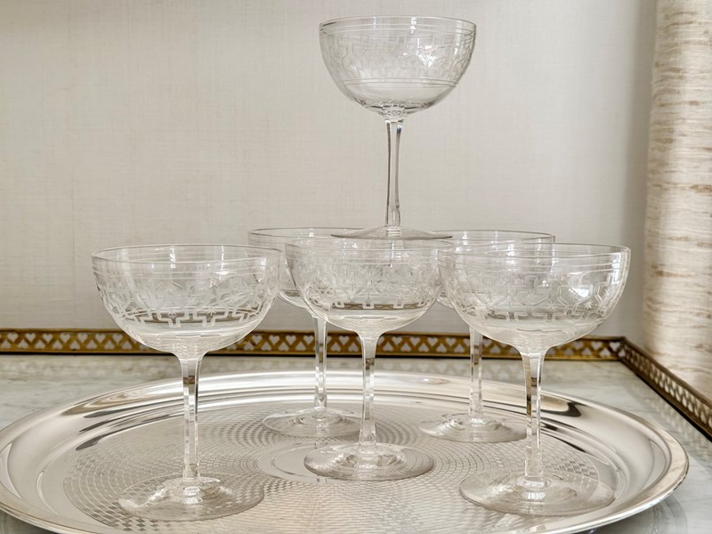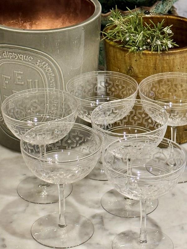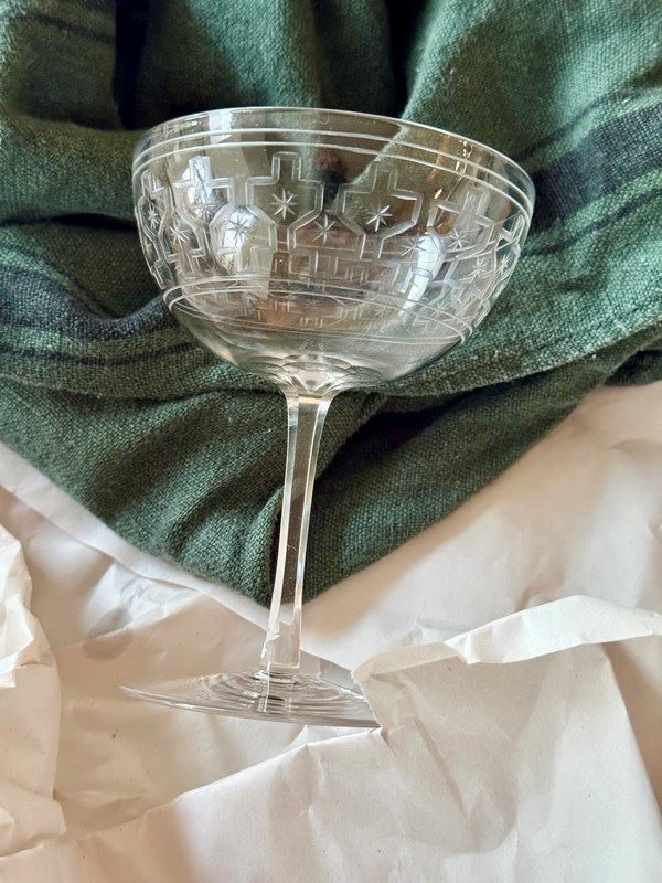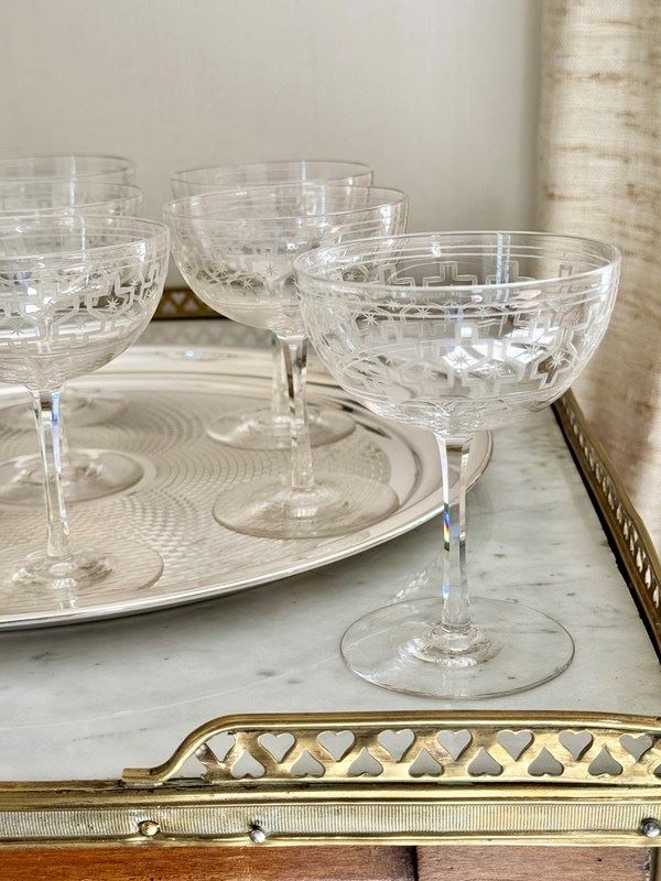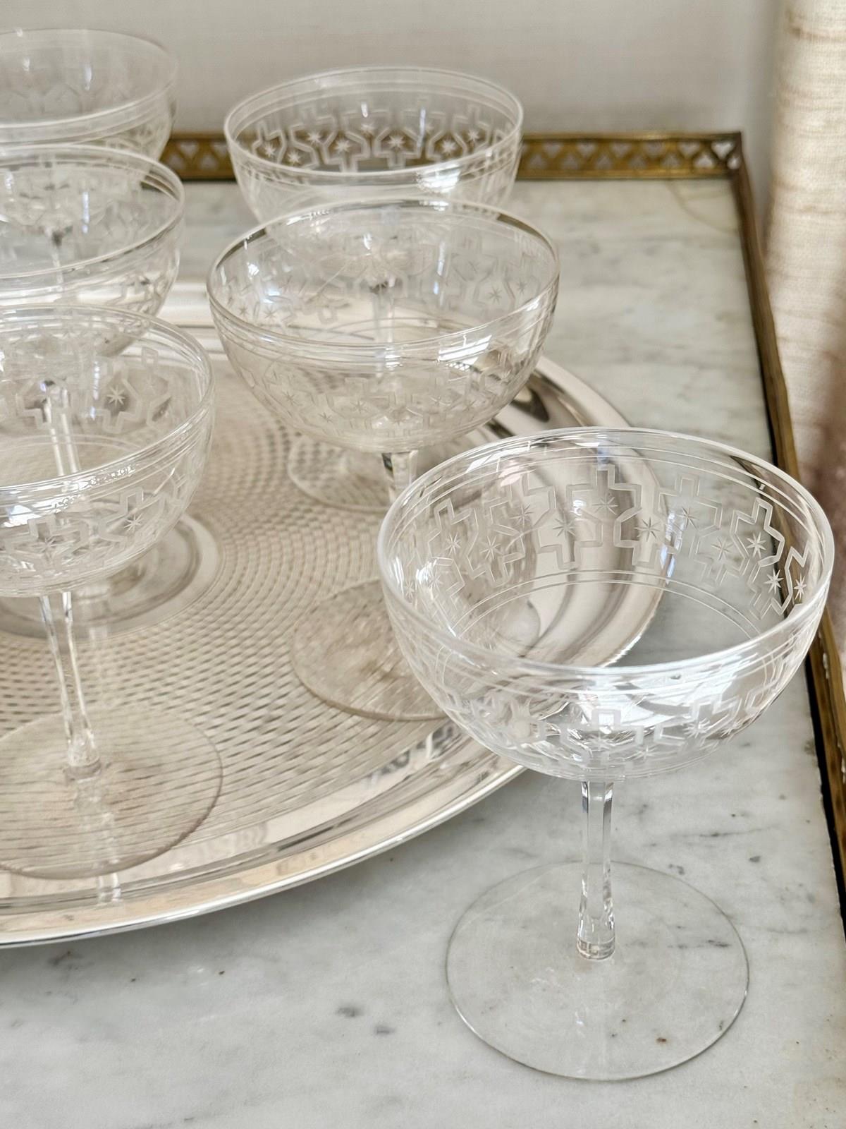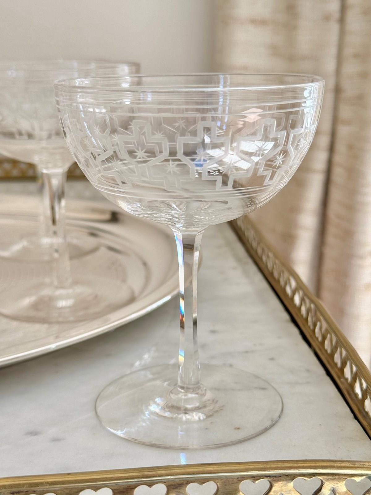 Rare Art Deco Star Etched Crystal Champagne Coupes C1920