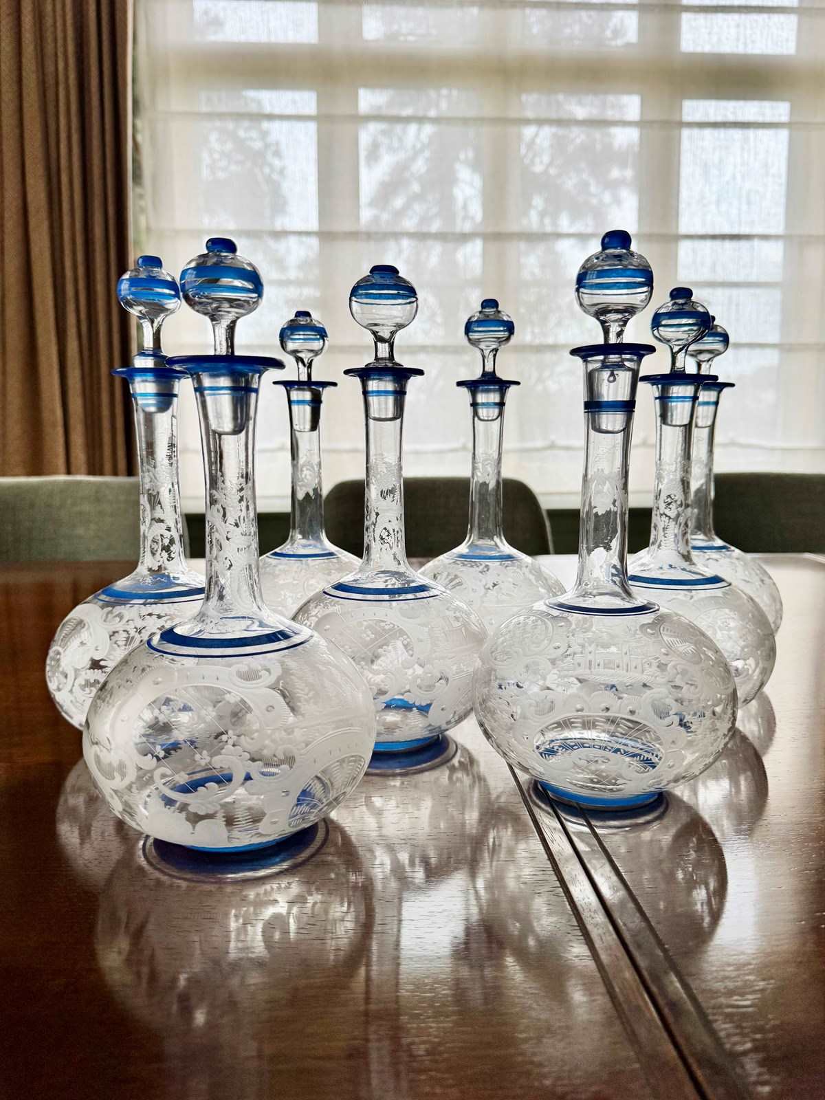 An outstanding set ofDeco Bohemian wheel etched claret wine decantershand applied blue enamel rings, Circa 1920s. Each superb decanterand matching stopper has been hand crafted, each slightly different, with individually engraved scrolled patterns and charming forest scenes including dogs, rabbits, foxes, castles, Pagodas and birds. These decanters each hold over one bottle of wine,up to a maximum of 950ml.All in all, a astonishinglyrare set which would work well for red or white wine. There are eight decanters available, sold in two sets of four.