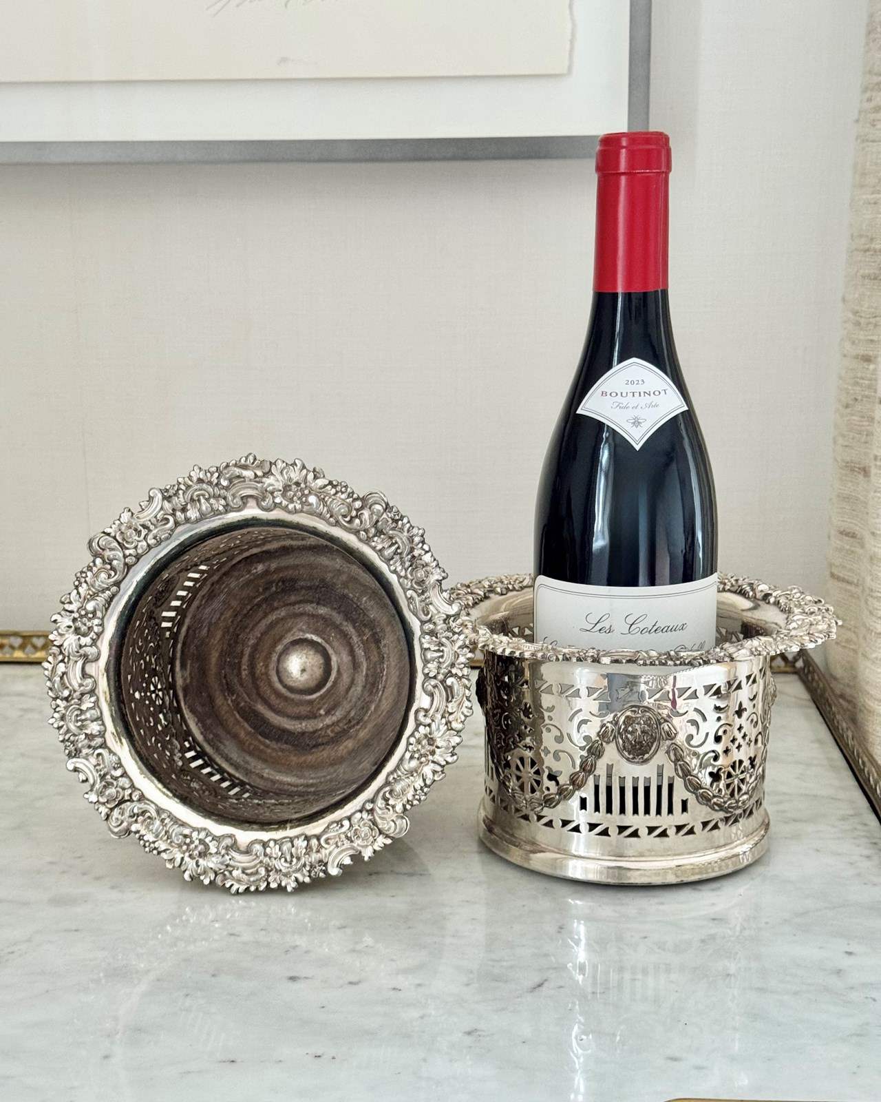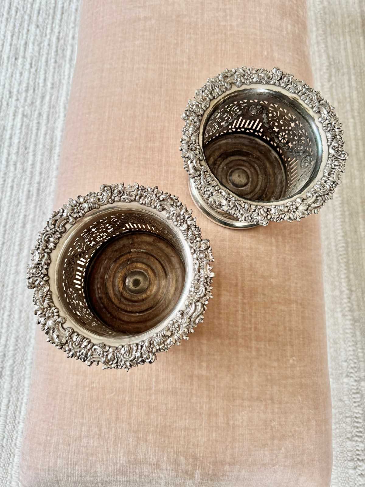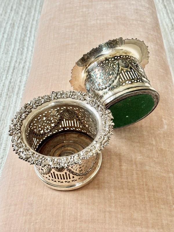 A beautifully decorative pair of 19th Century Victorian pierced silver plated large magnum wine bottle or decanter coasters with turned wooden bases and lion's mask detail with pretty swagged garlands, Circa 1890s. Delightfully worn silver plating to bring through a warm patina and copper base. These coasters are large enough to take either a magnum or traditional sized bottle (see images).