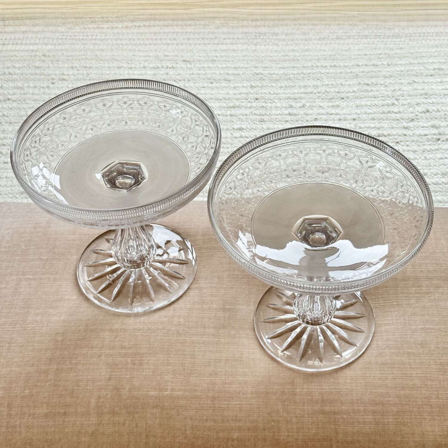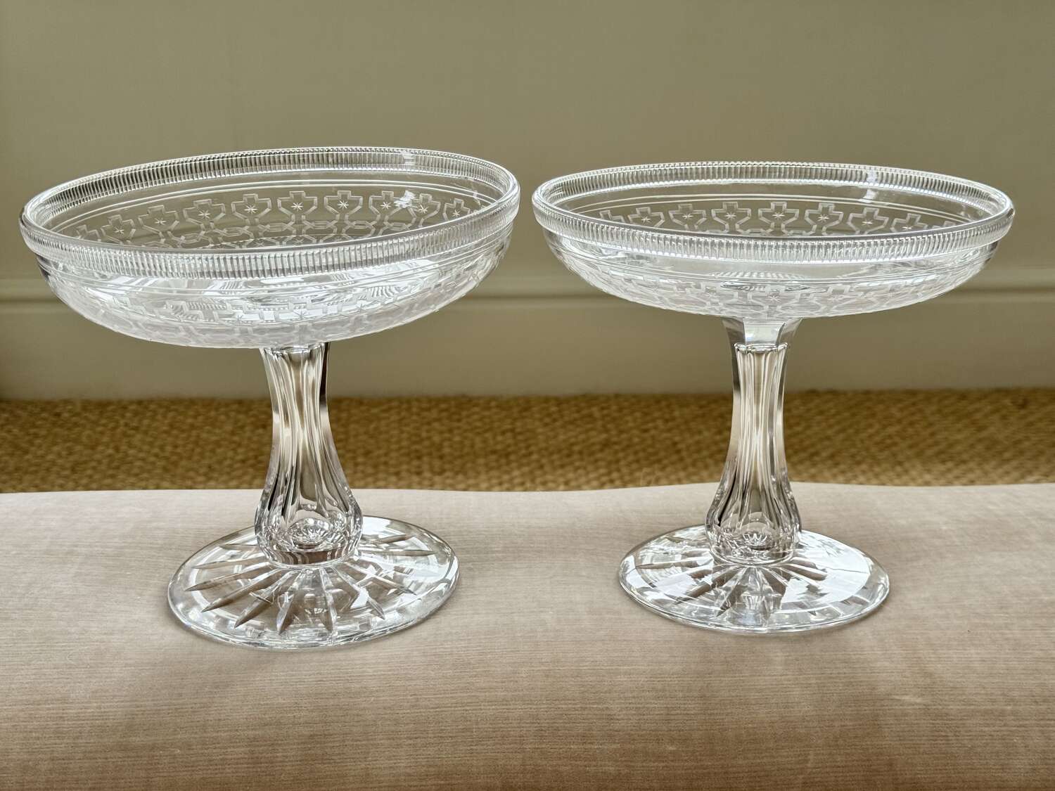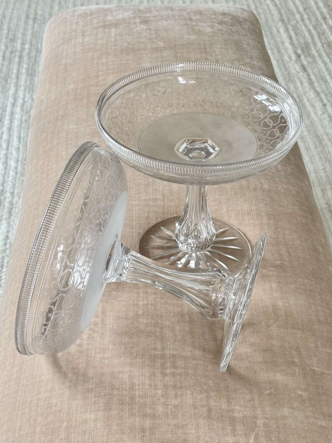 Pair Victorian Etched Crystal Glass Tazza Comport Dishes