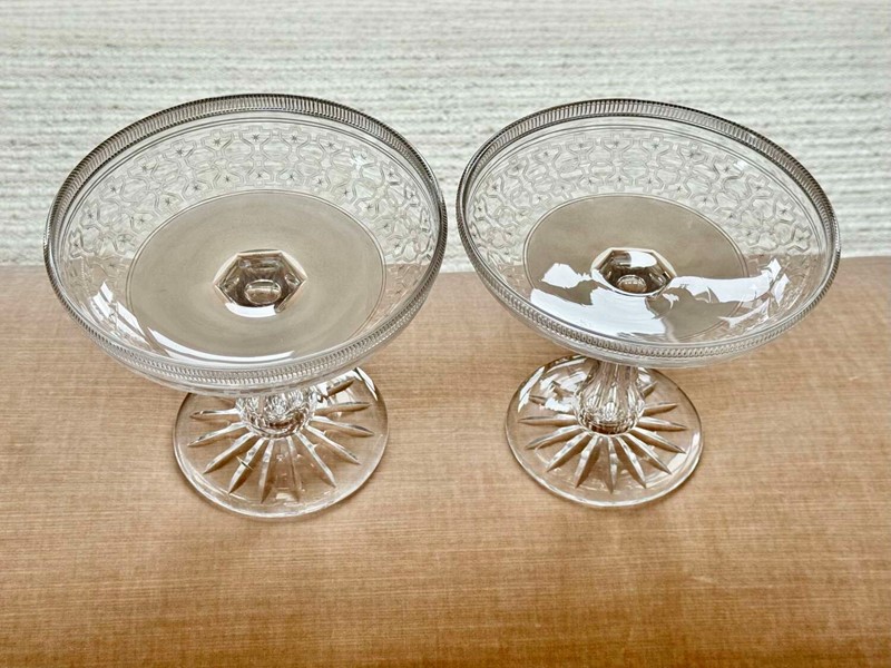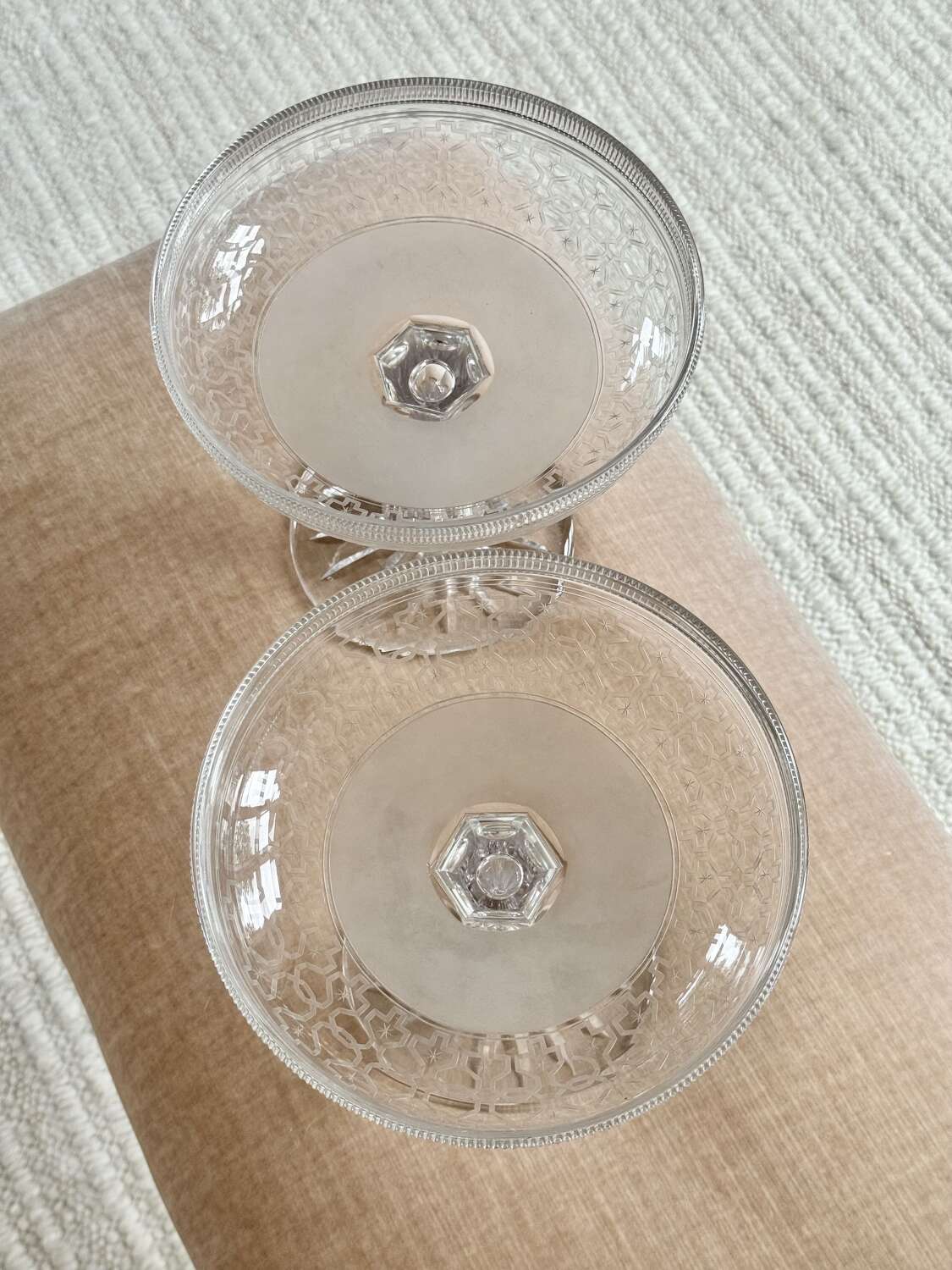 A beautiful pair of Victorian 19th Century hand etchedglass comport serving Tazzas, with circular bowls geometrically etchedon faceted air blown stems, with folded and mitred rim and star cut bases, possibly by Mollineaux Webb, England.Perfect for displaying fruits, chocolates or flowers on a dining table. Pure glamour!