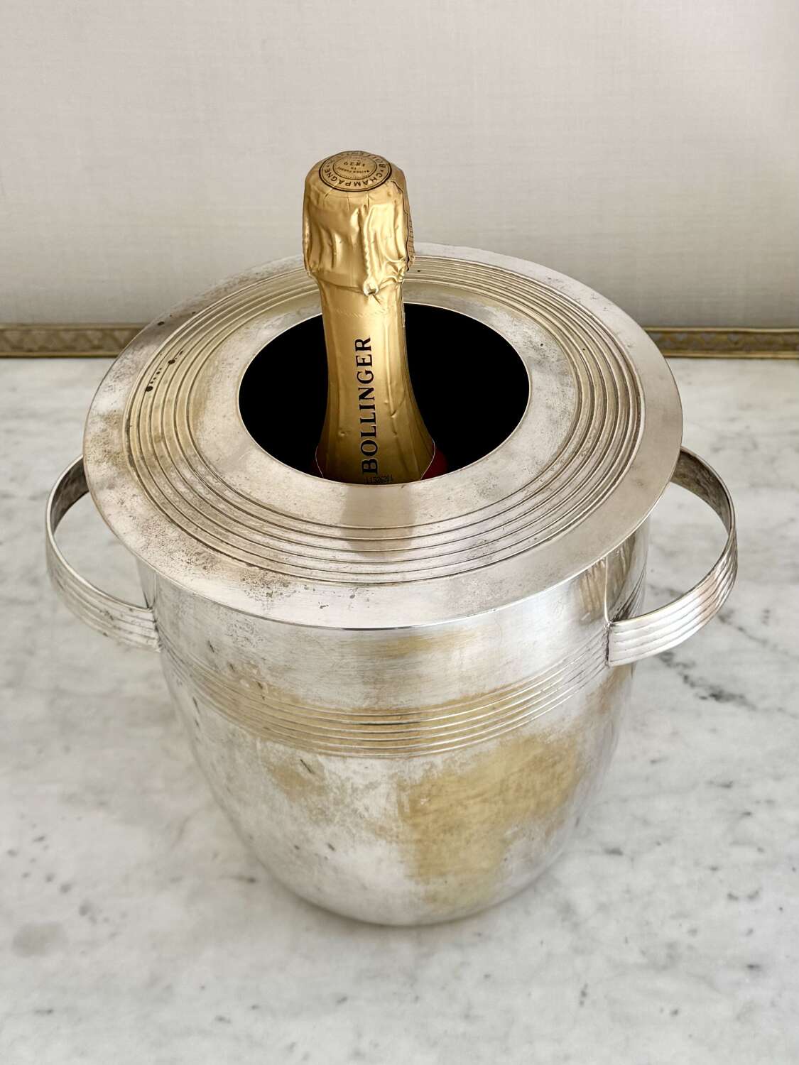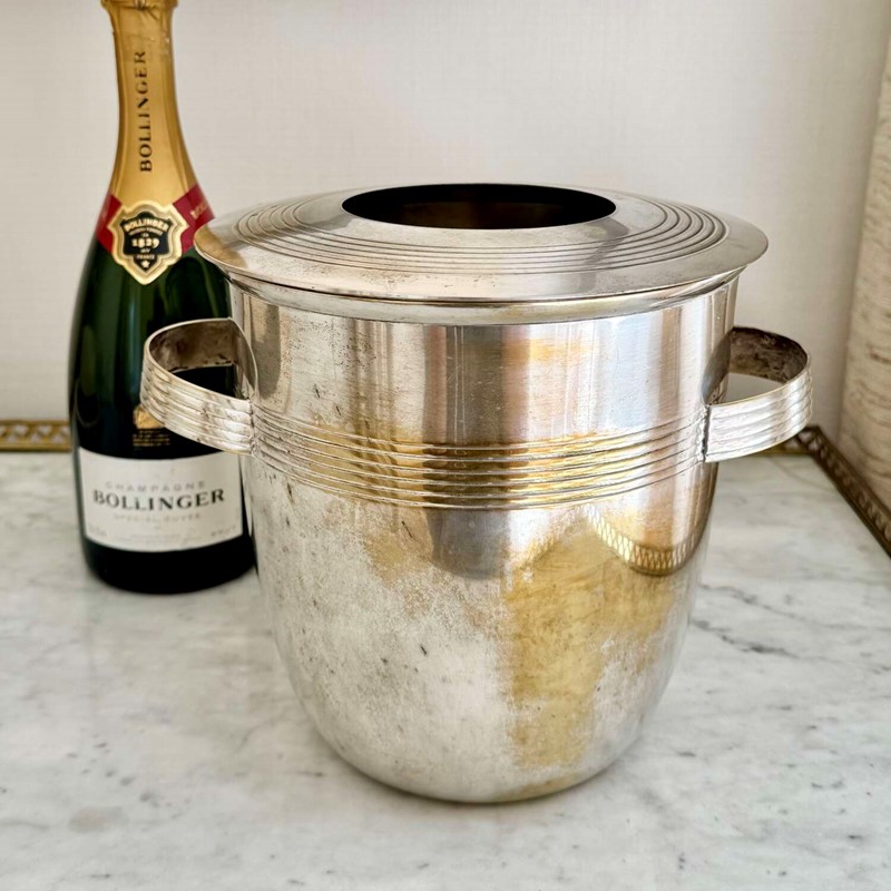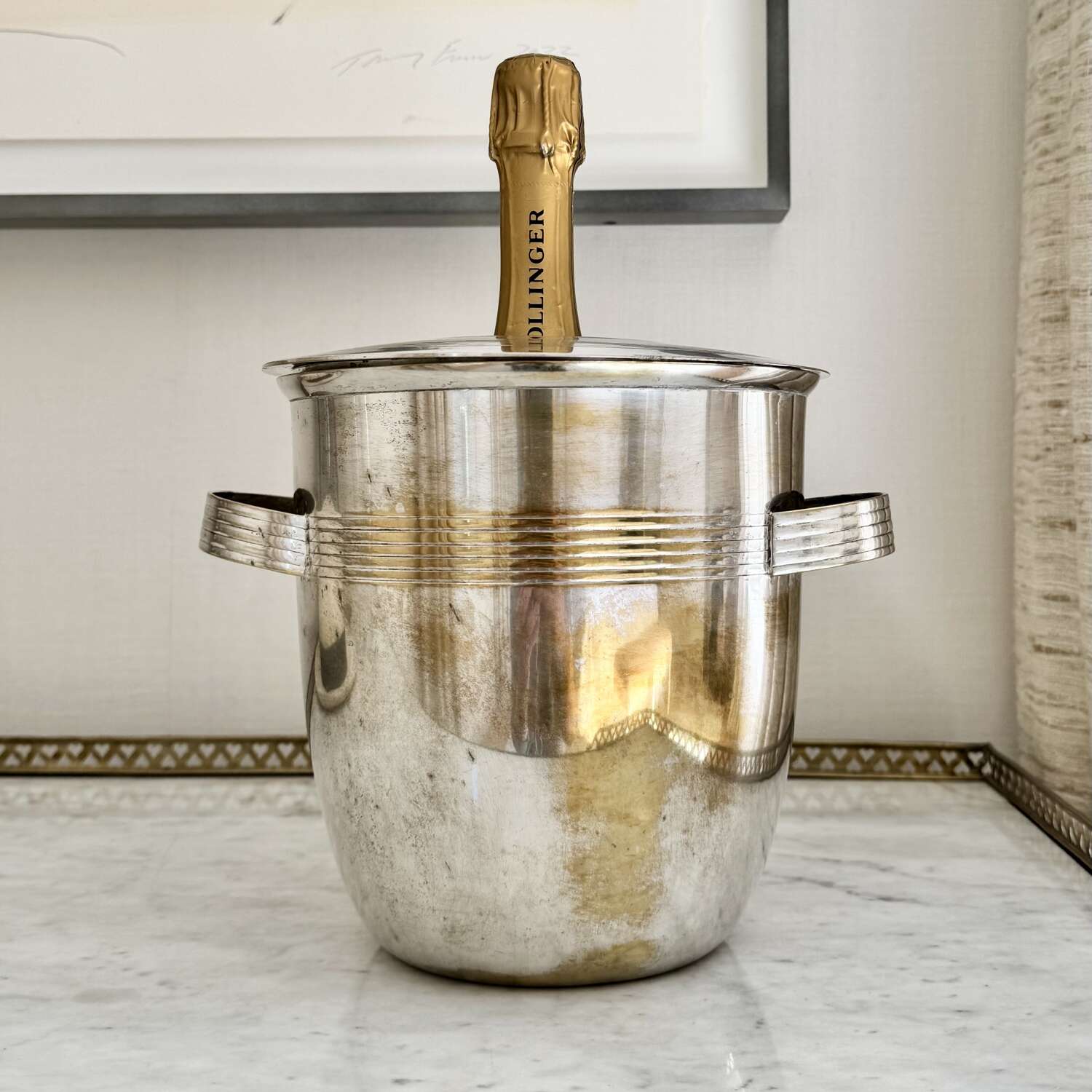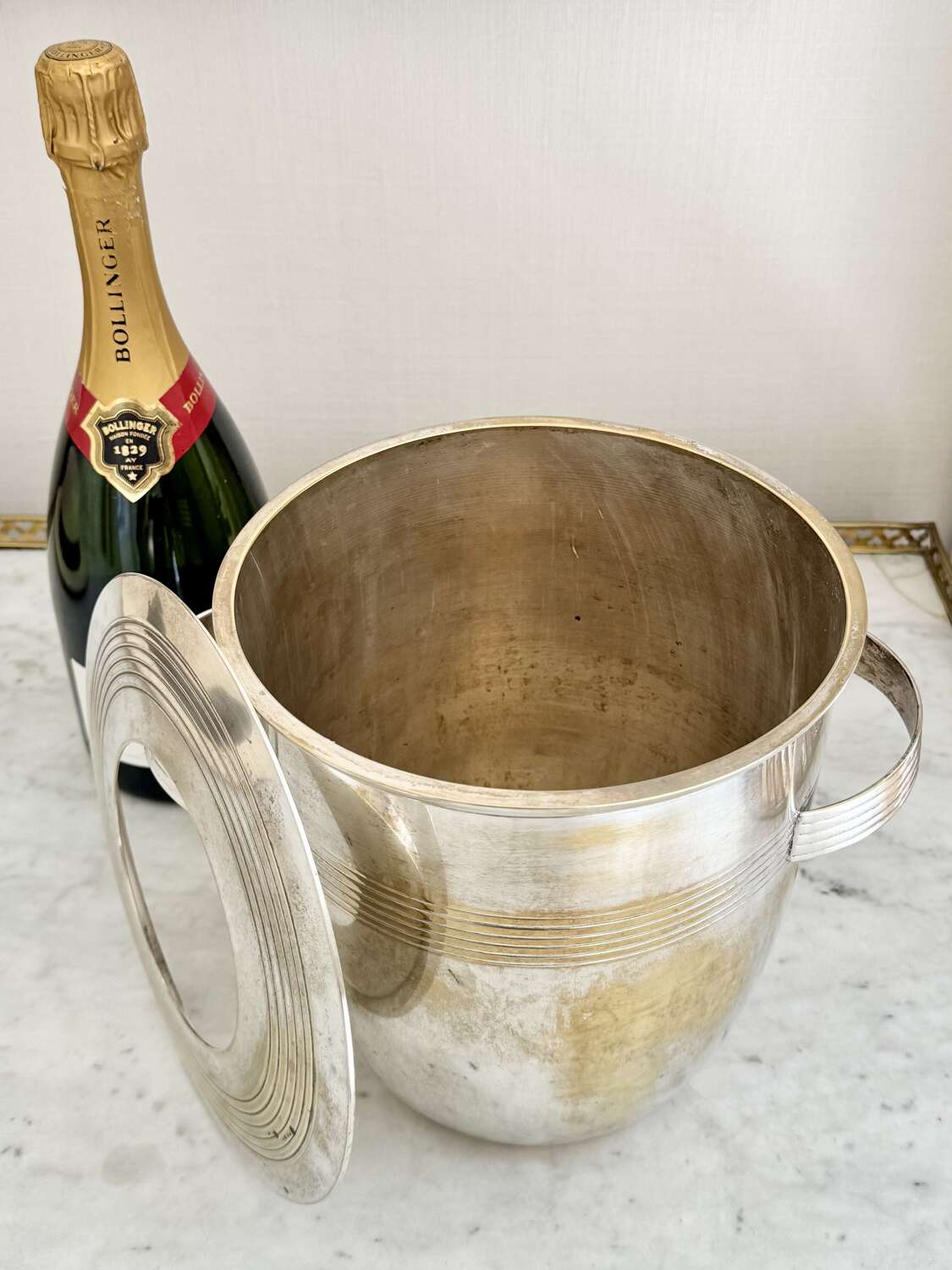 An Art Deco style large silver plated champagne bucket or cooler with removable lid, Circa 1980. This smart wine bucket can hold two bottles without the lid. Maximum patina has created wonderful warmth where the original brass is glowing through. This is a good, solid wine cooler which would work well indoors and outside...