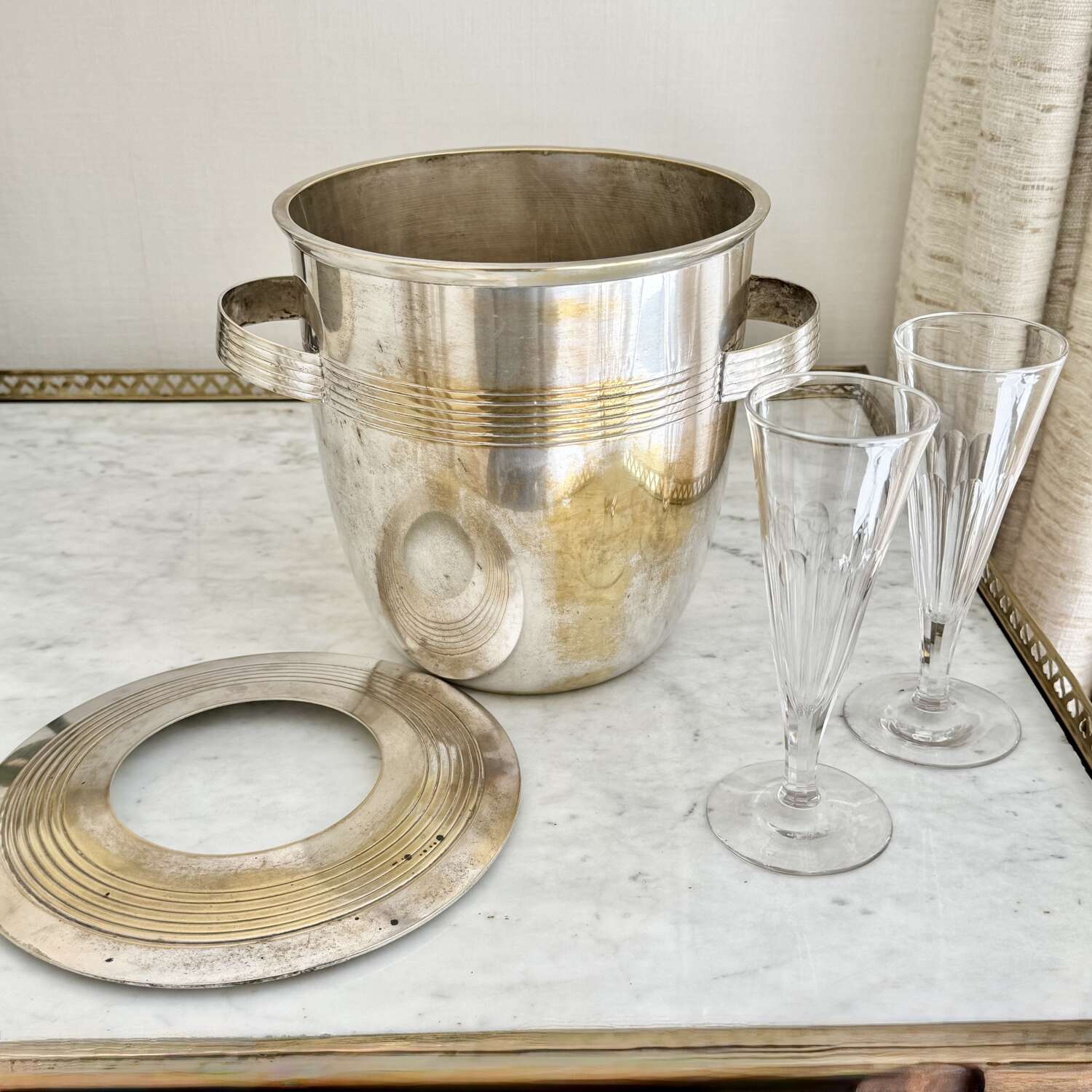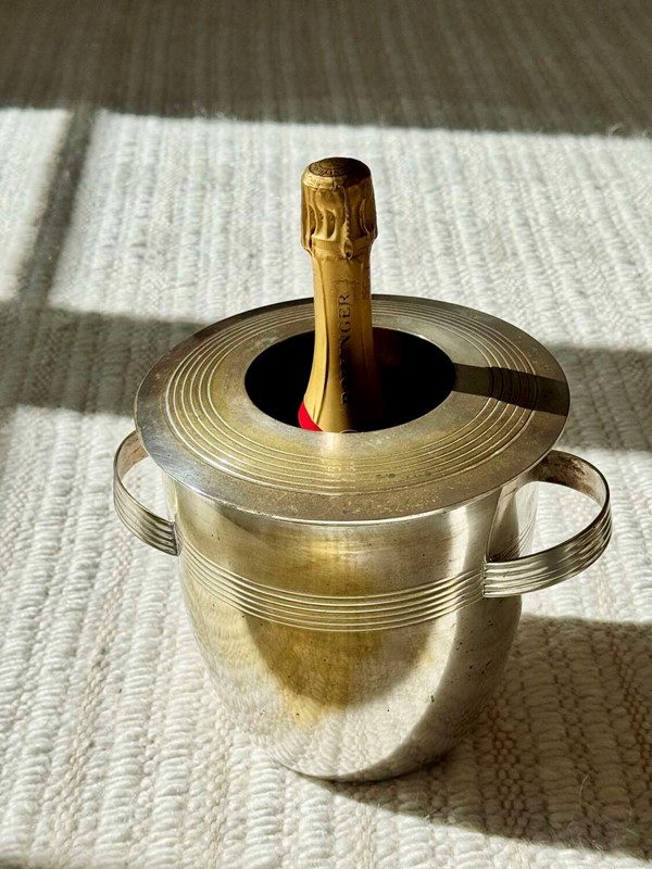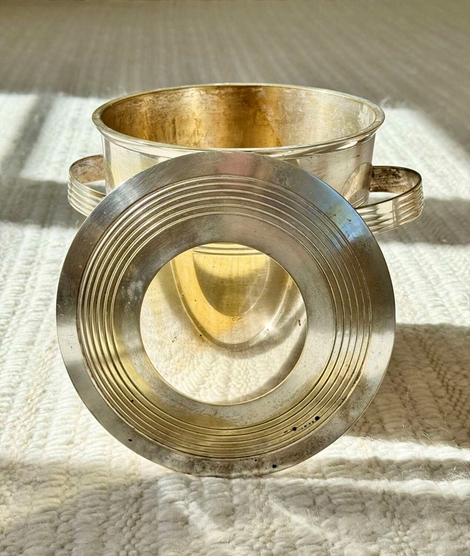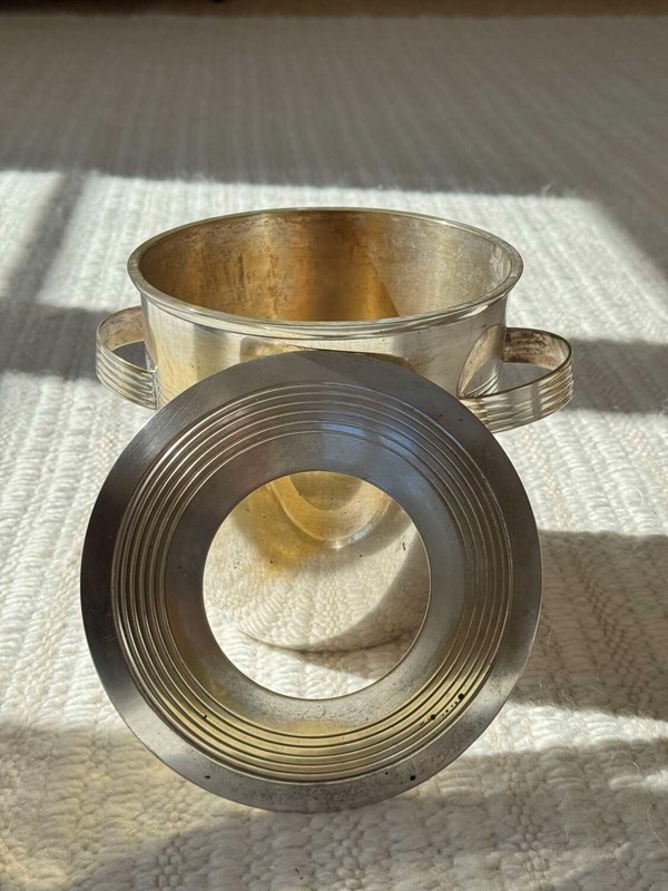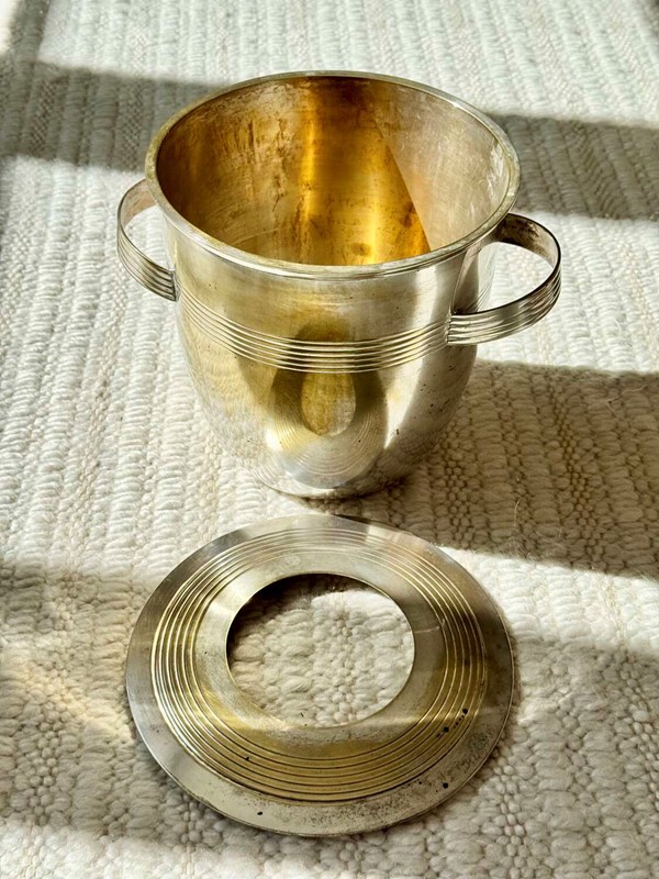 An Art Deco style large silver plated champagne bucket or cooler with removable lid, Circa 1980. This smart wine bucket can hold two bottles without the lid. Maximum patina has created wonderful warmth where the original brass is glowing through. This is a good, solid wine cooler which would work well indoors and outside...