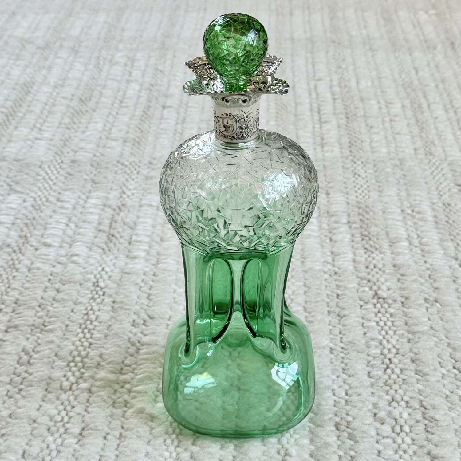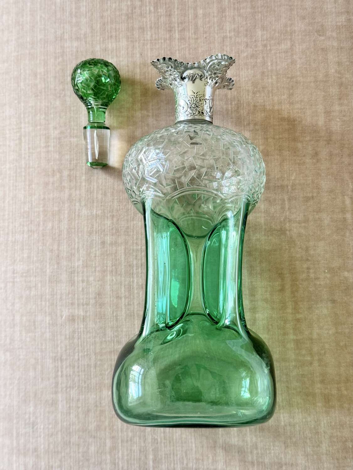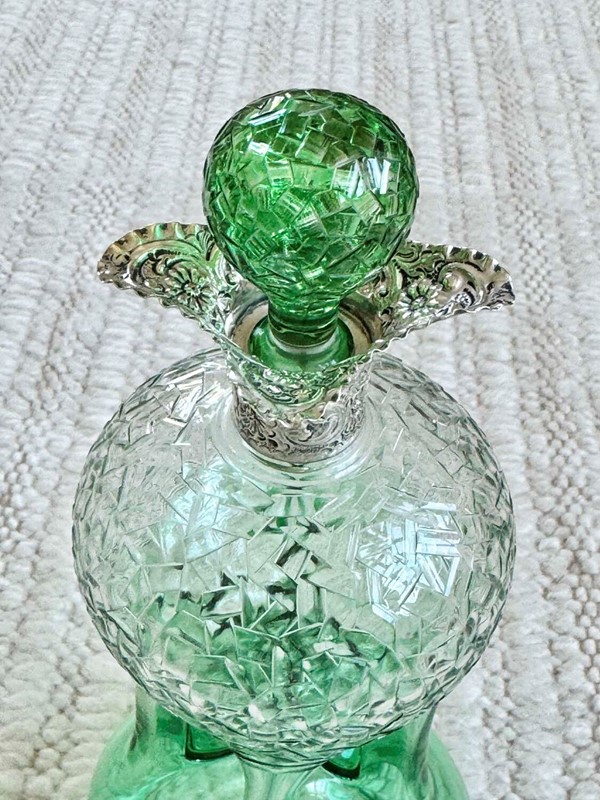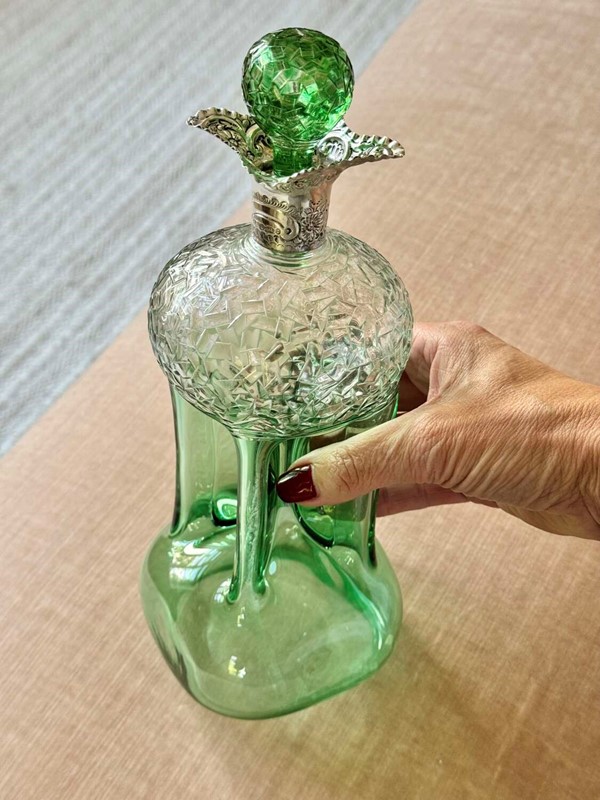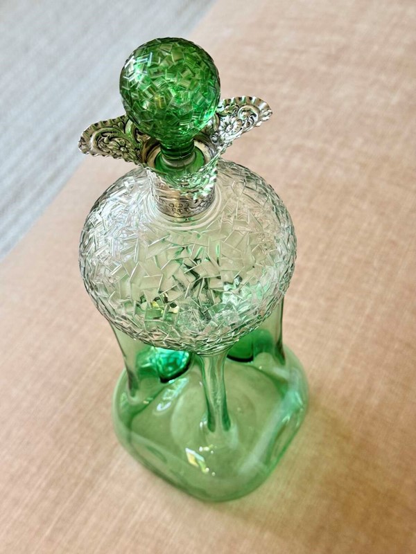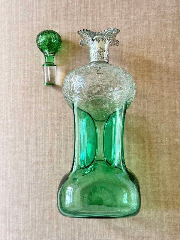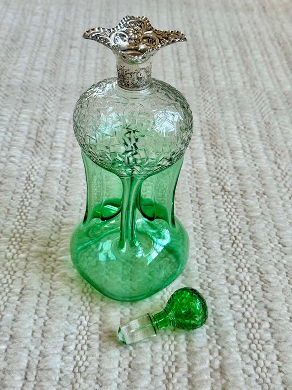 An outstanding and rare Englishgreen flashed and hand cut to clear, pinched glass Glug decanterwith chased silver collar and matching pair blown and hand cut stopper, hallmark dateSheffield 1909, attributedto Stevens and Williams of Stourbridge, In superb condition with a polished pontil base, there is only a little bloom internally to the decanter.