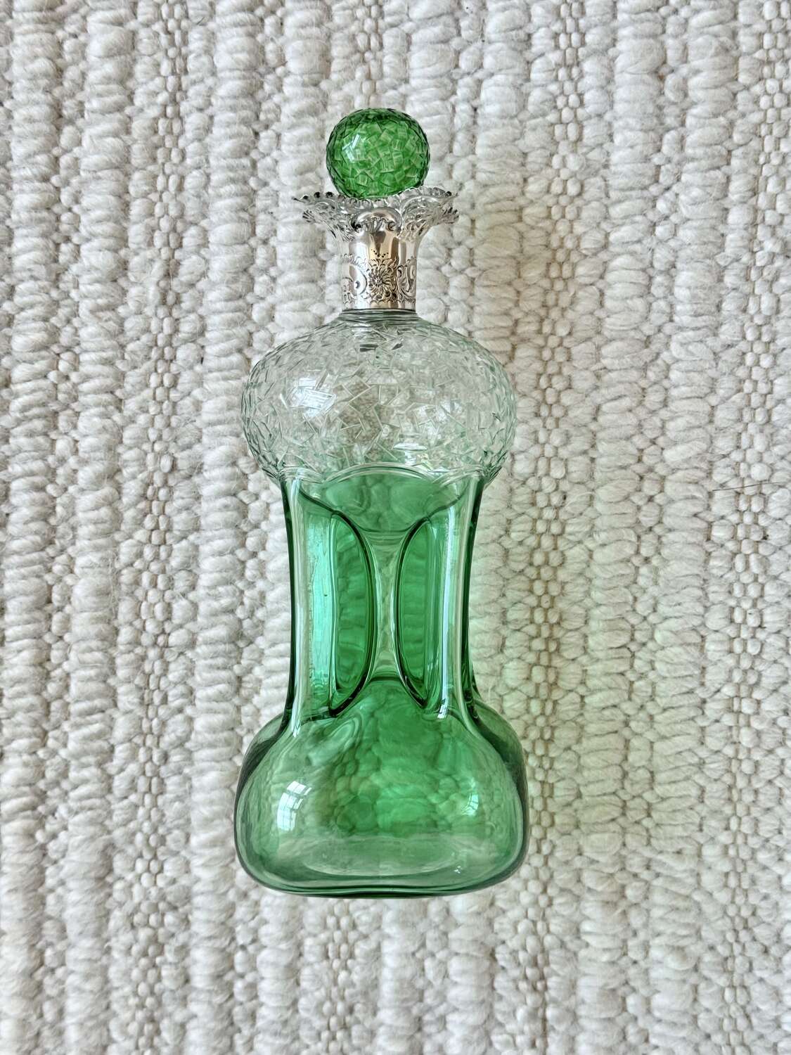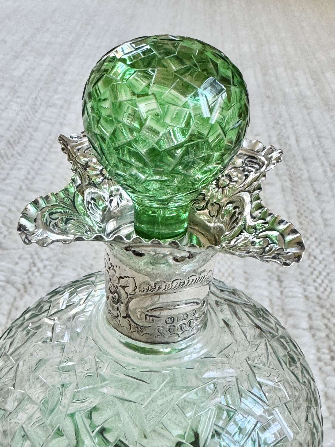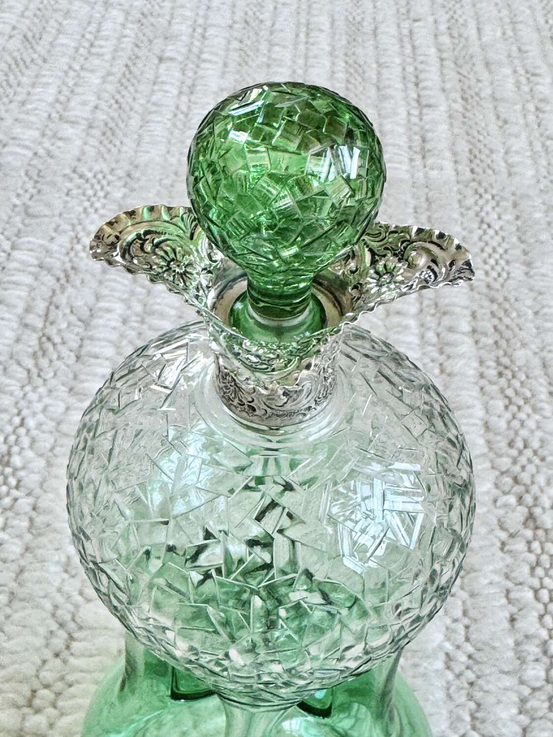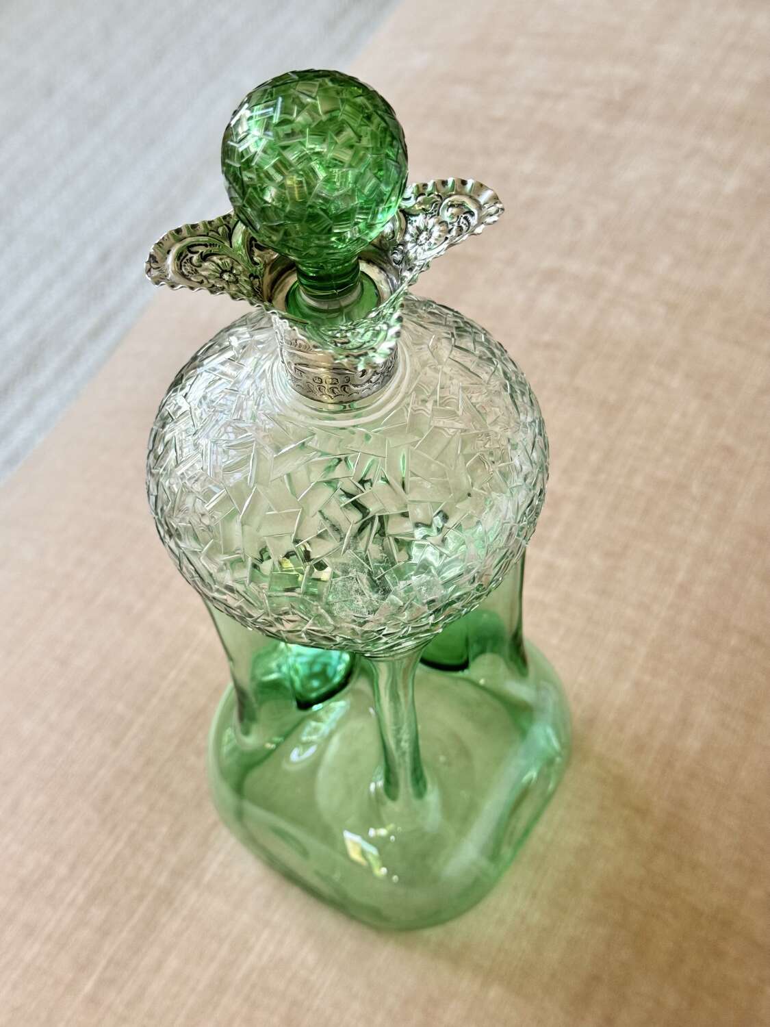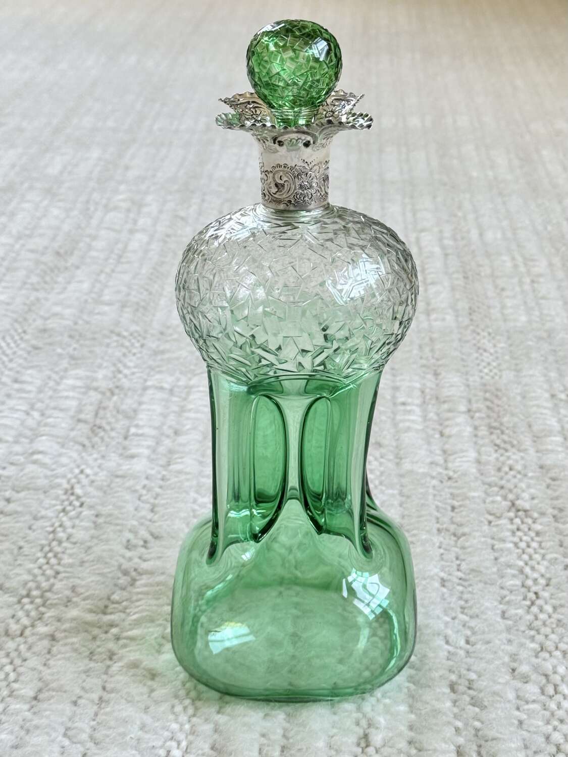 An outstanding and rare Englishgreen flashed and hand cut to clear, pinched glass Glug decanterwith chased silver collar and matching pair blown and hand cut stopper, hallmark dateSheffield 1909, attributedto Stevens and Williams of Stourbridge, In superb condition with a polished pontil base, there is only a little bloom internally to the decanter.