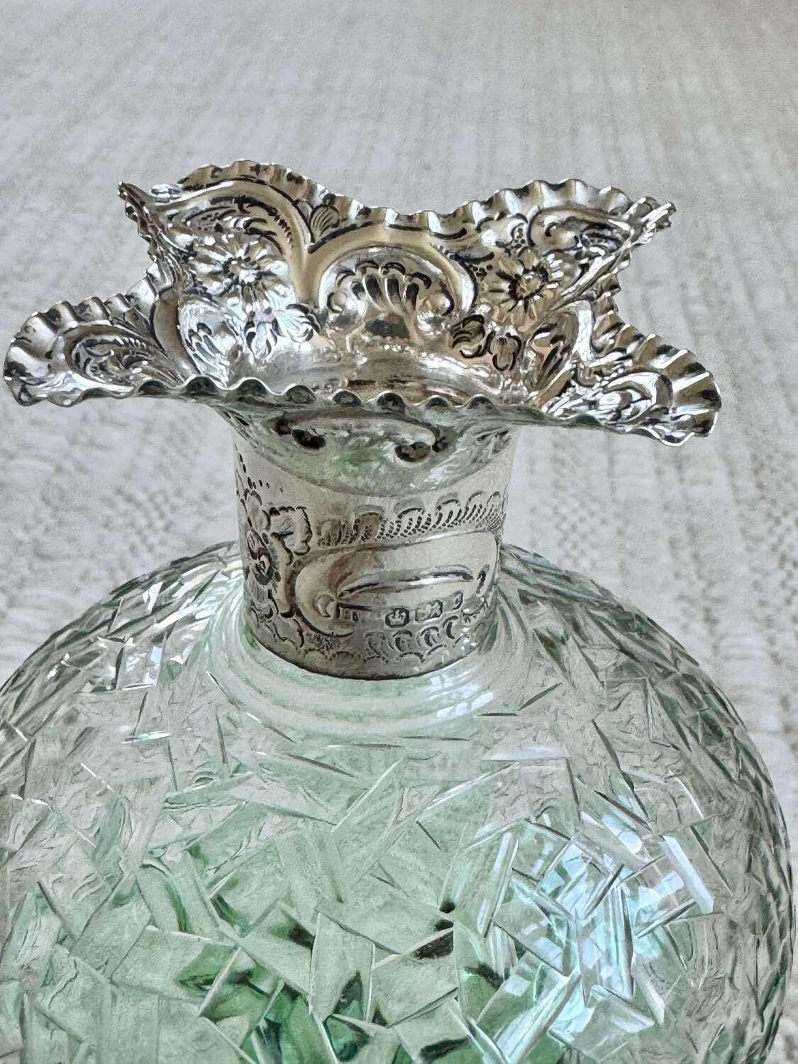 Rare Stevens & Williams Silver Collar & Cut Glass Pinched Glug Decanter 1909