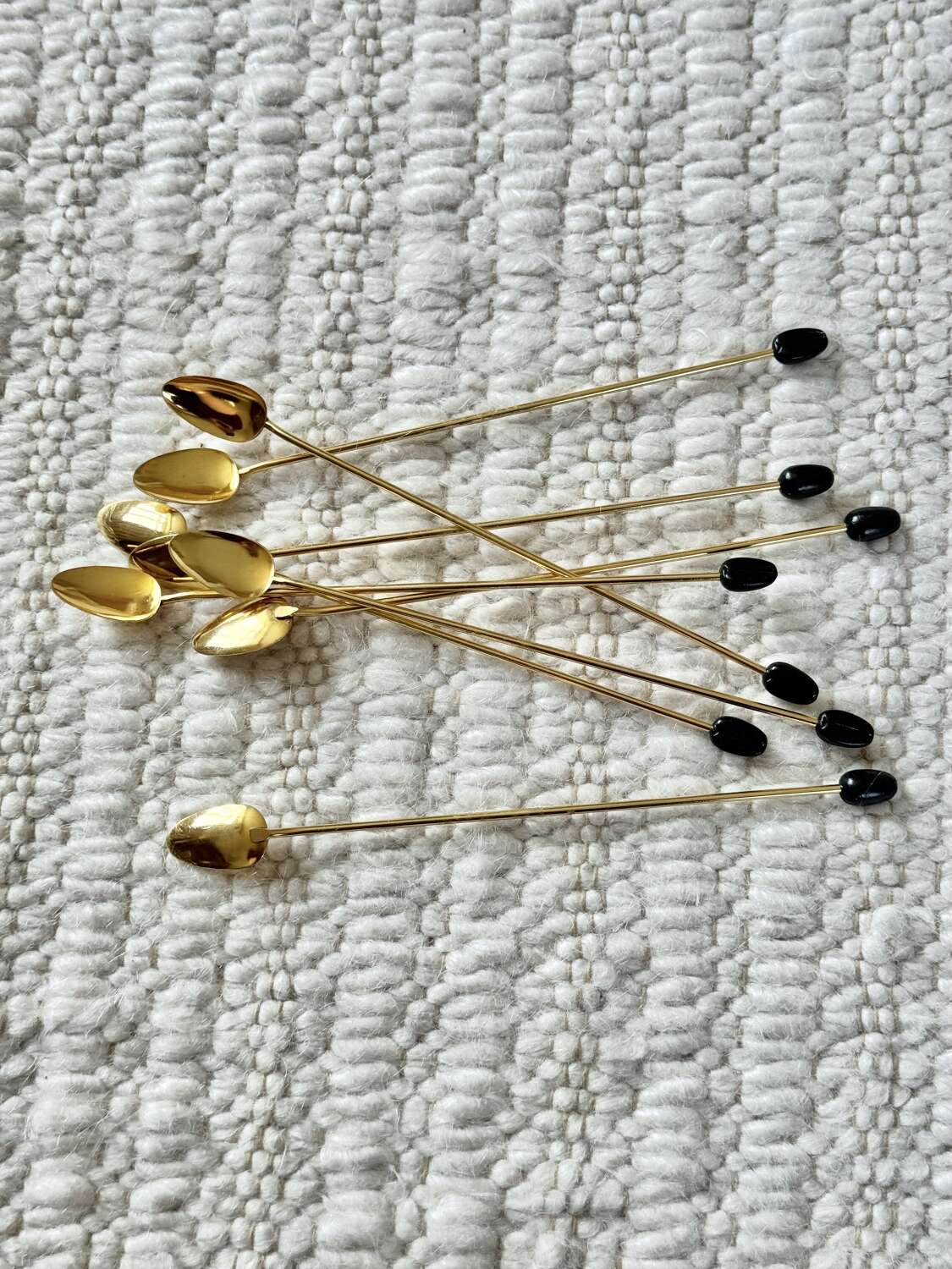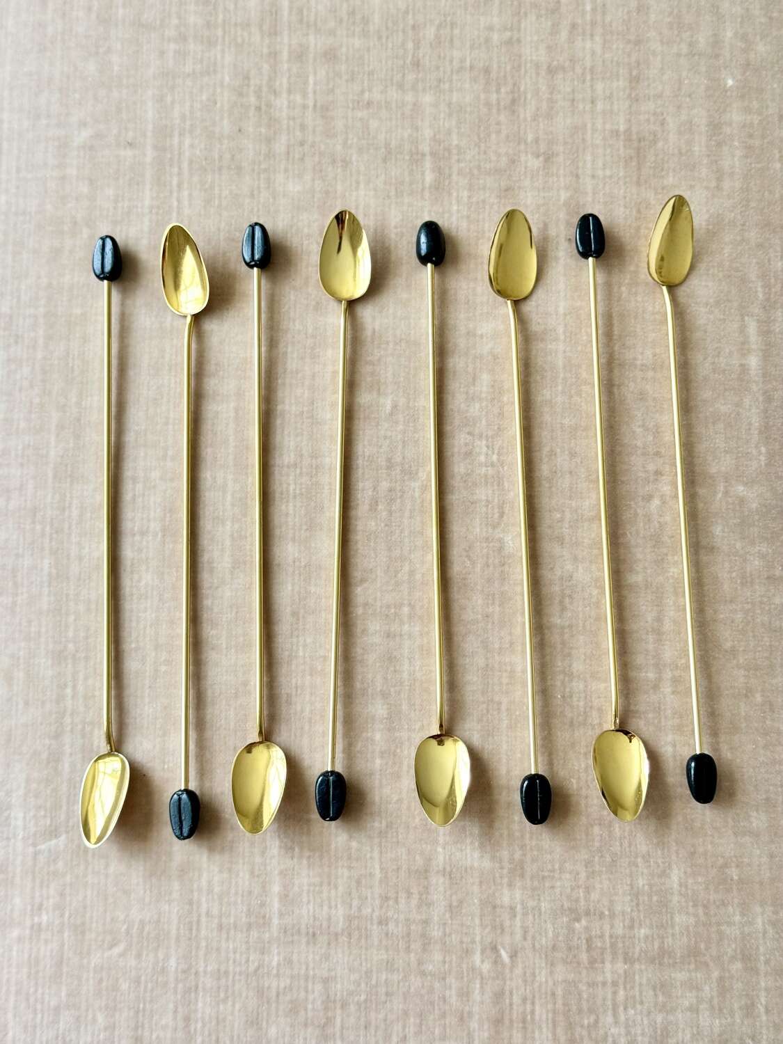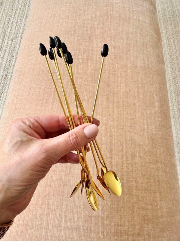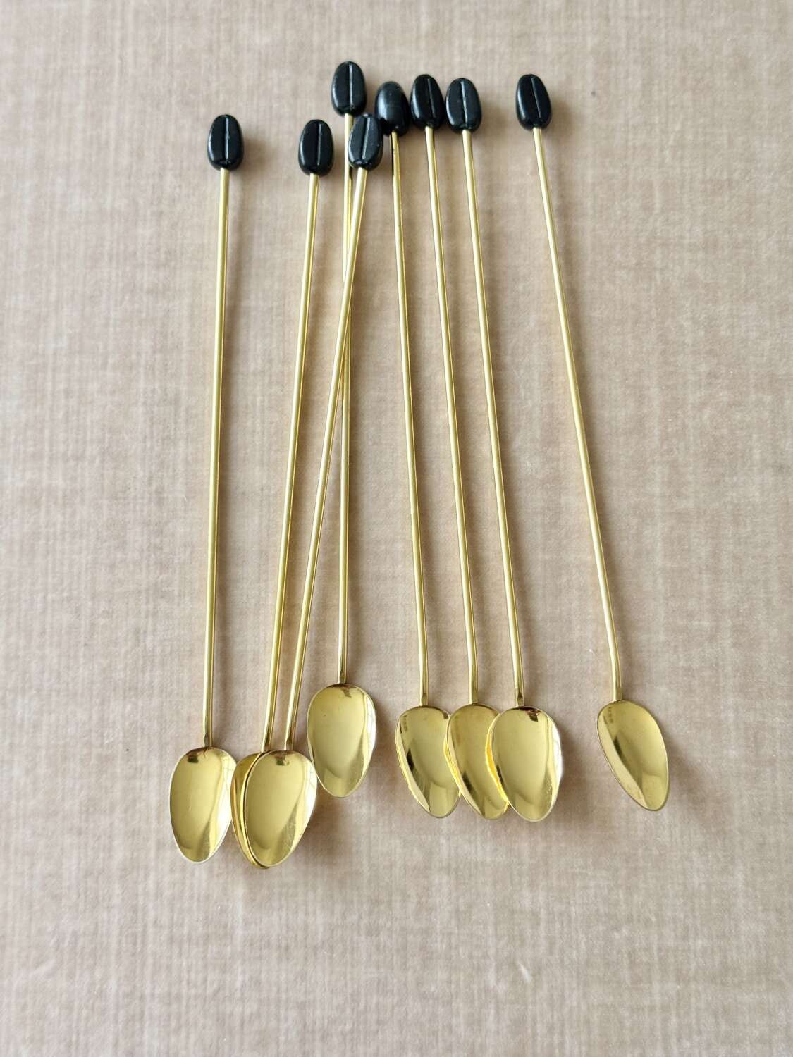 A fantastic quality set of eight Italian 1970s gold plated long cocktail bar spoons with coffee bean finial ends, perfect for mixing the drinks or using in a guest’s glass so they can stir it themselves… The set is in excellent ‘never been used’ condition.Each 19cm long