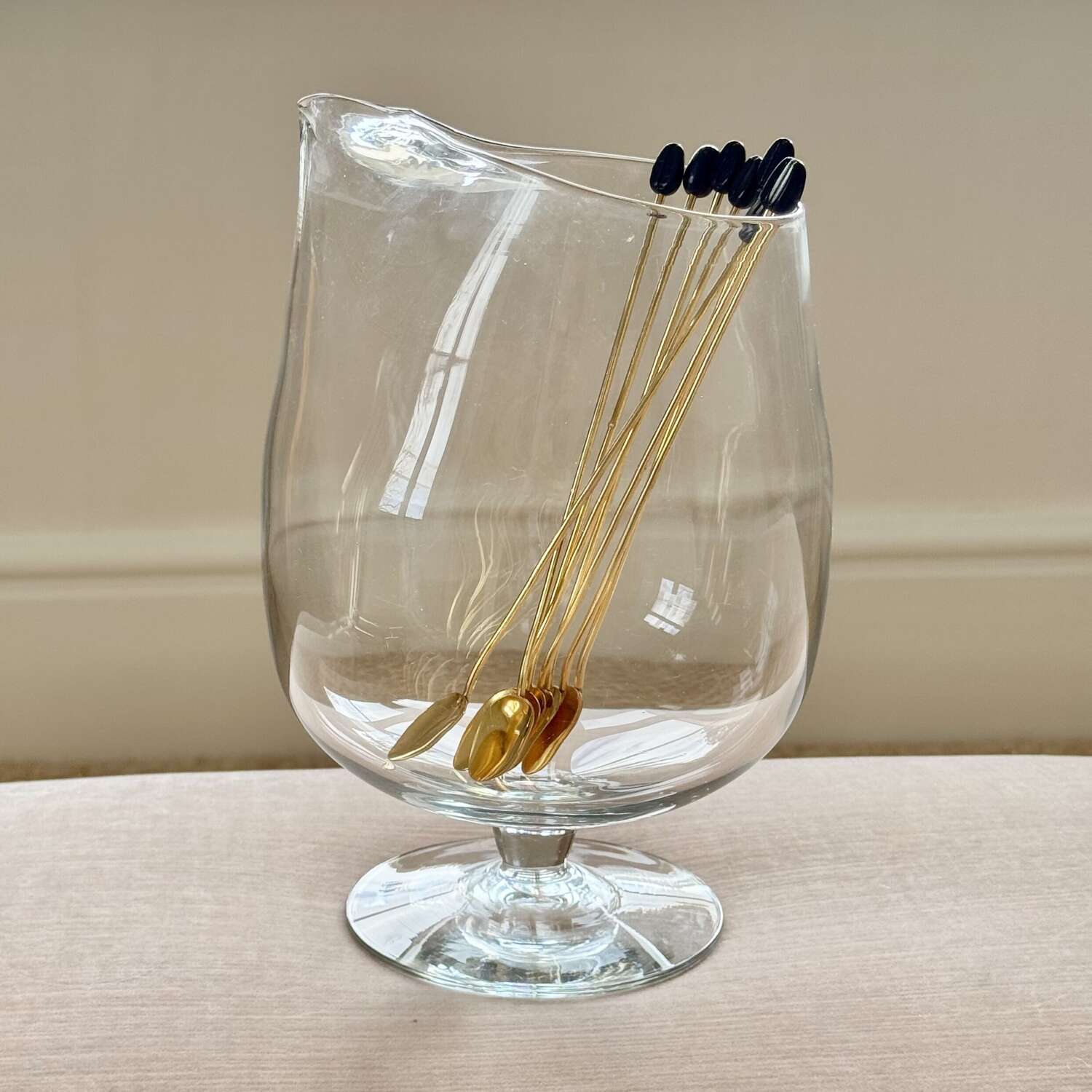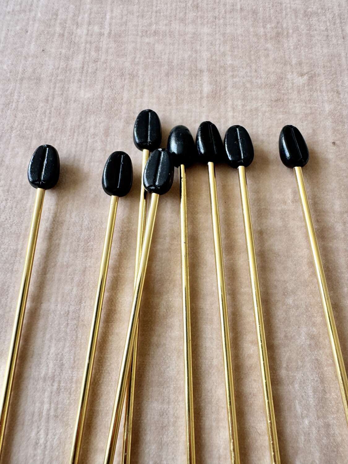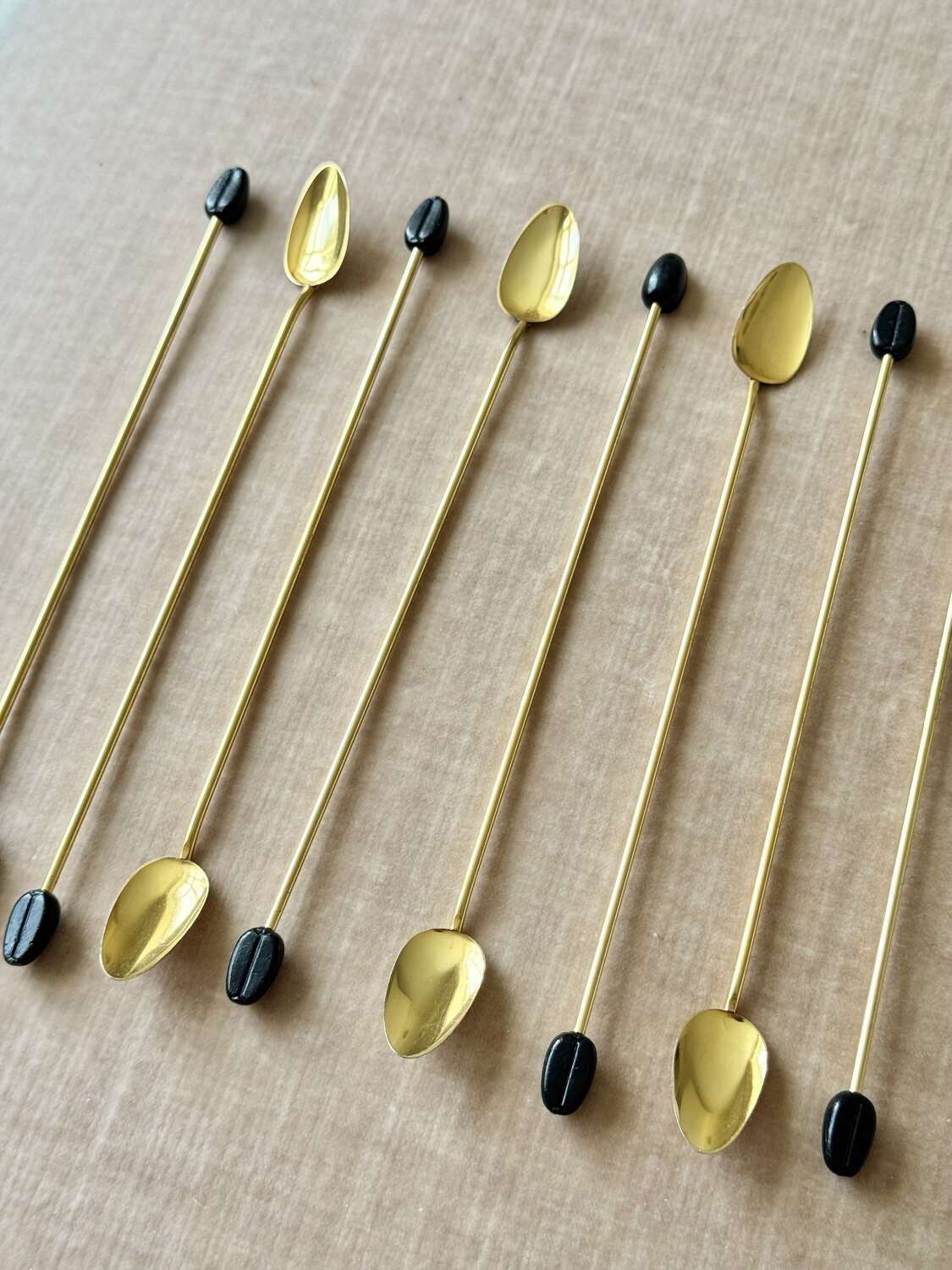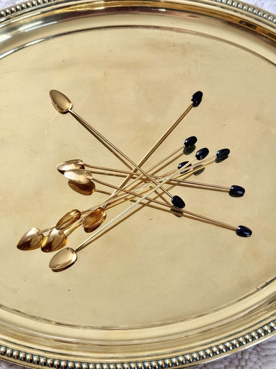 A fantastic quality set of eight Italian 1970s gold plated long cocktail bar spoons with coffee bean finial ends, perfect for mixing the drinks or using in a guest’s glass so they can stir it themselves… The set is in excellent ‘never been used’ condition.Each 19cm long