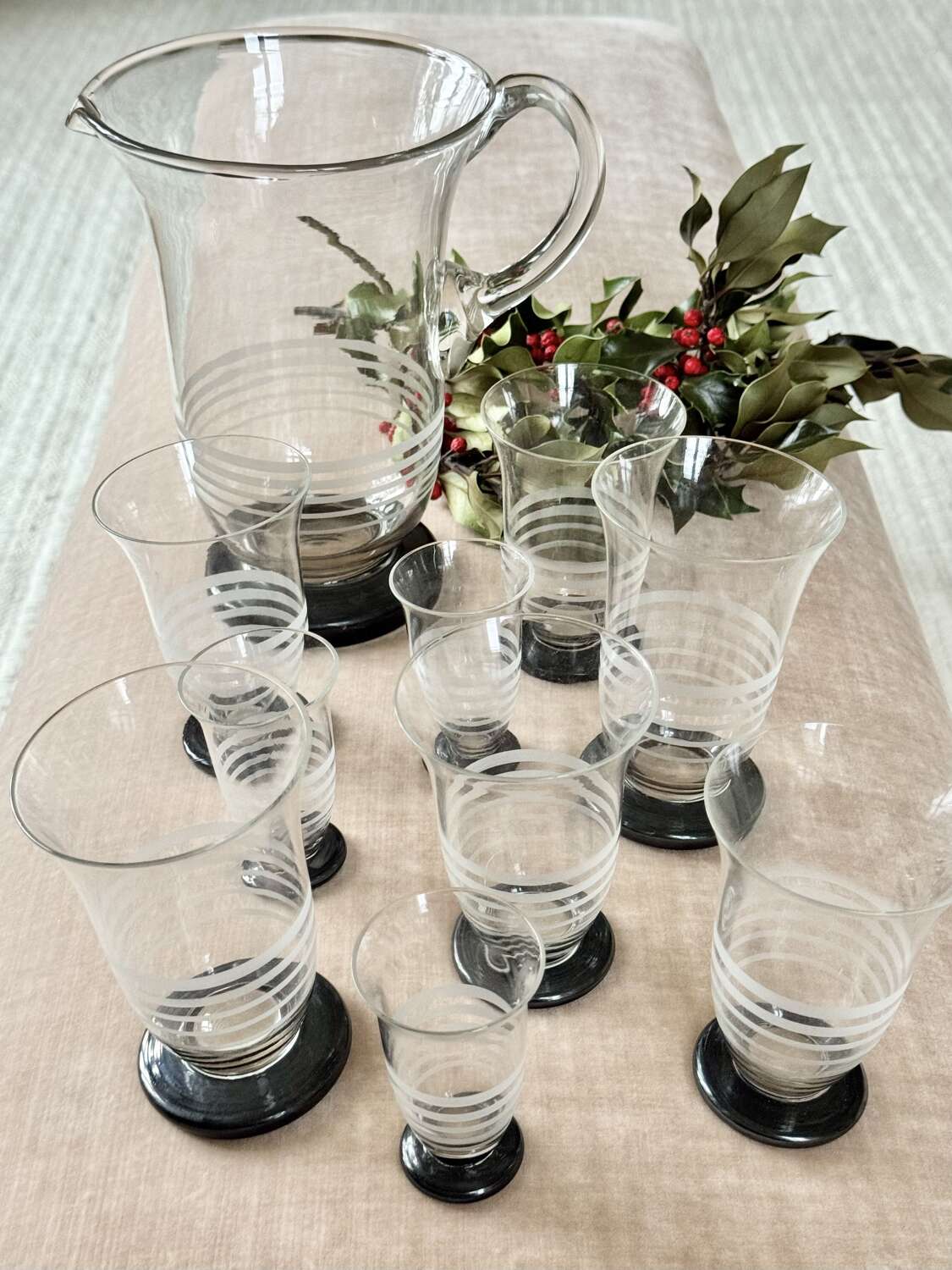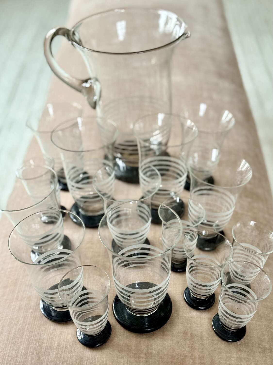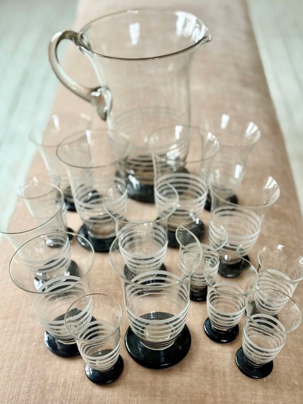 A wonderful Art Deco Czechoslovakian etched glass & black lemonade cocktail jug with 15 matching tumblers of various sizes, Circa 1940s. The set comprise a jug with applied handle, three large tumblers, six medium tumblers and six smaller tumblers. The various sizes make it perfect to use for cocktails, but the jug would work for everything from water, to juice to cocktails.