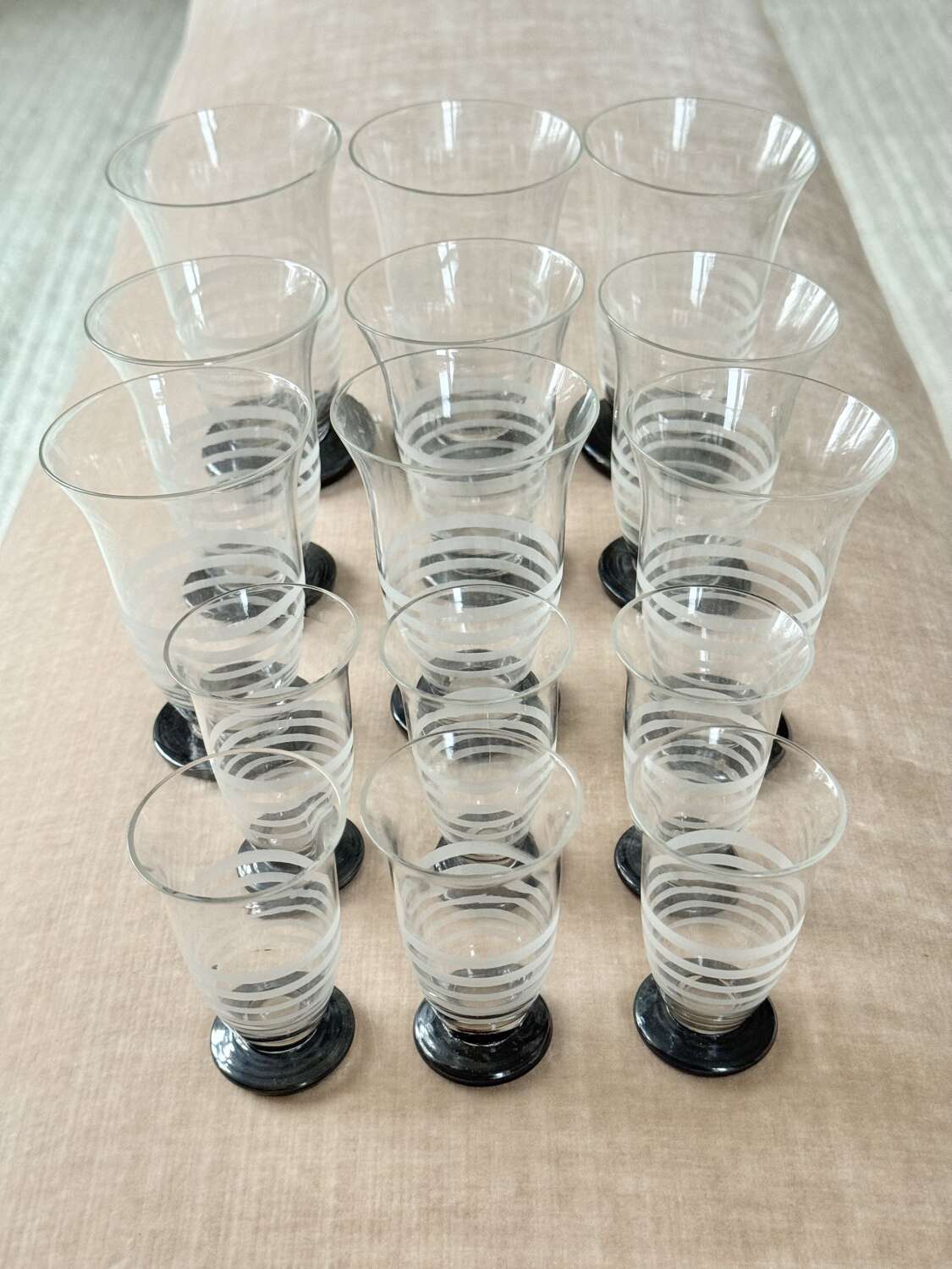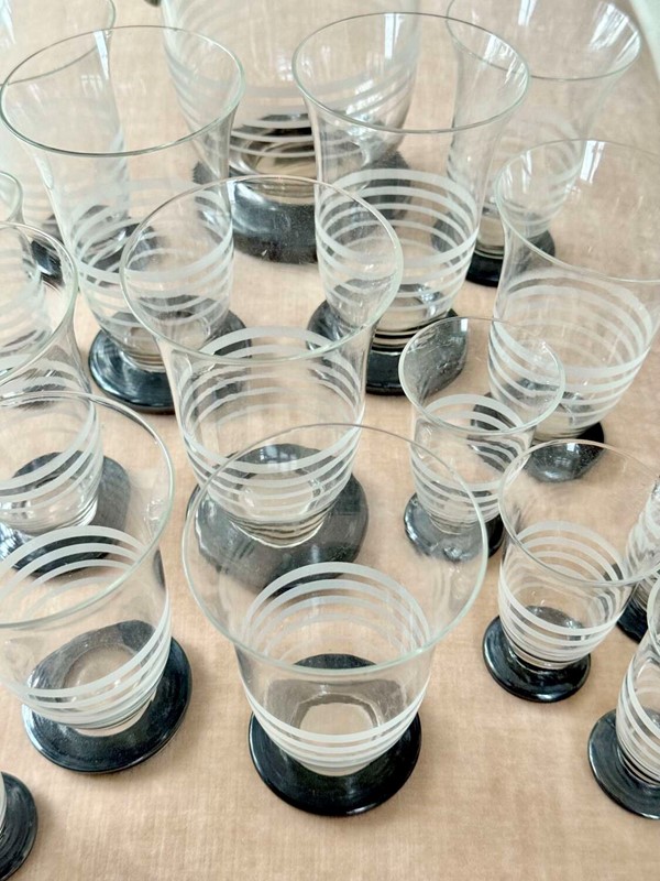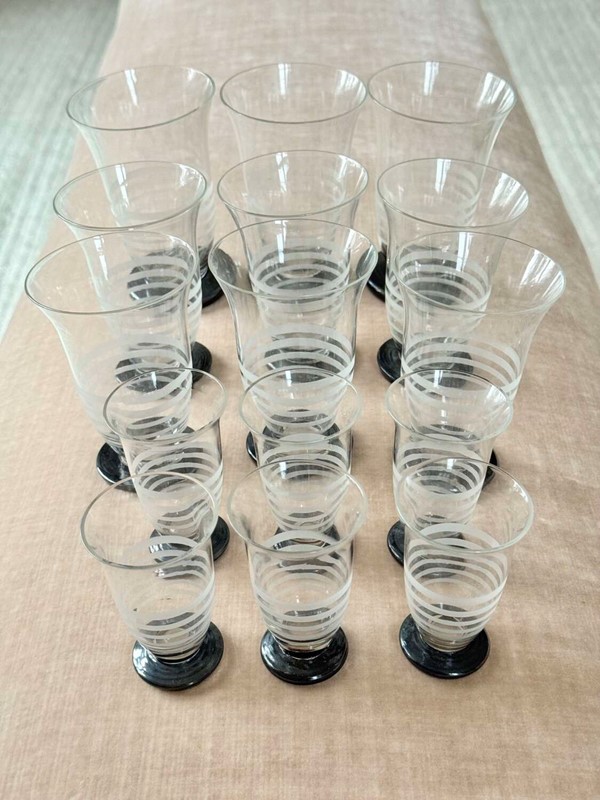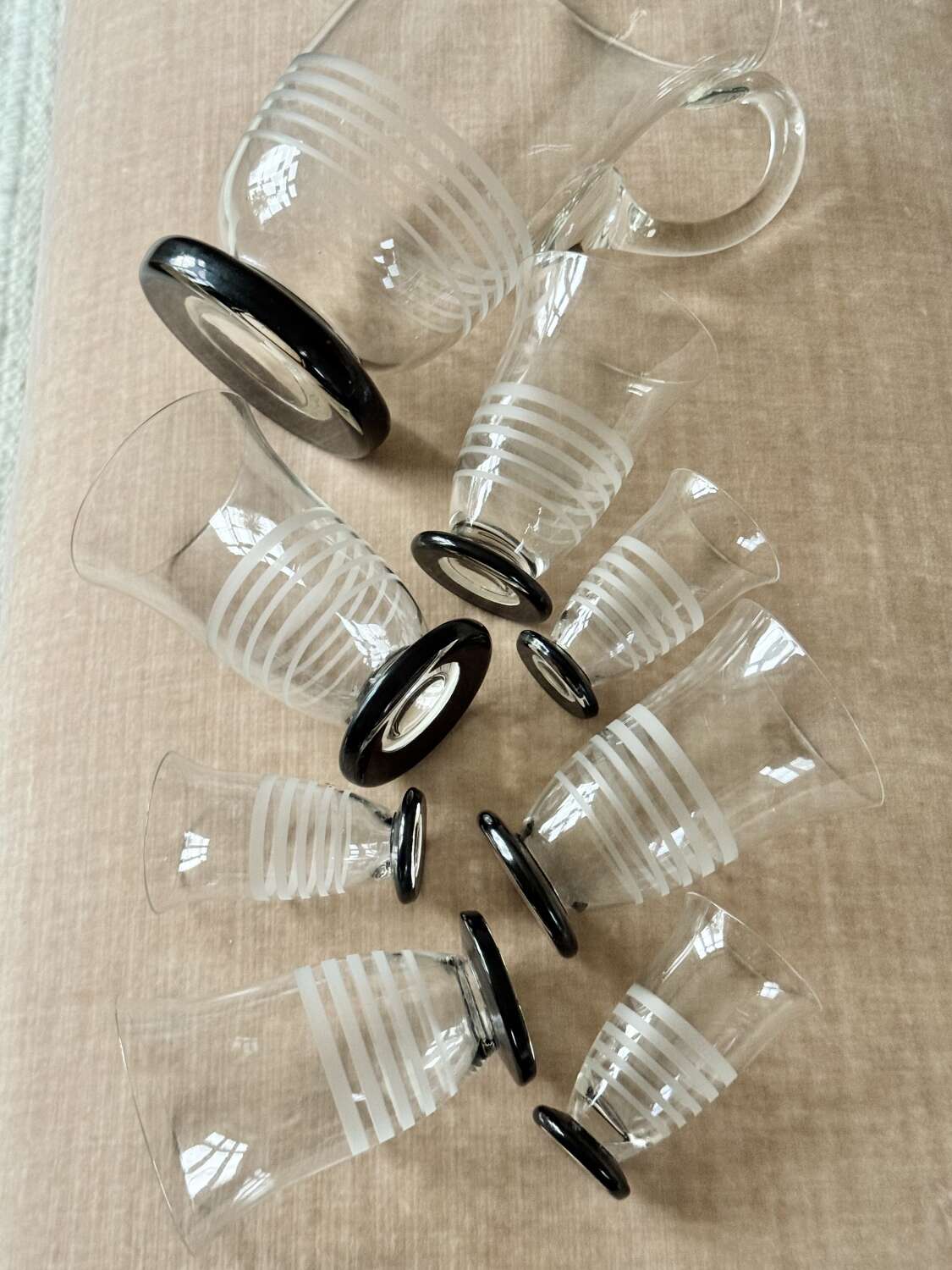 A wonderful Art Deco Czechoslovakian etched glass & black lemonade cocktail jug with 15 matching tumblers of various sizes, Circa 1940s. The set comprise a jug with applied handle, three large tumblers, six medium tumblers and six smaller tumblers. The various sizes make it perfect to use for cocktails, but the jug would work for everything from water, to juice to cocktails.
