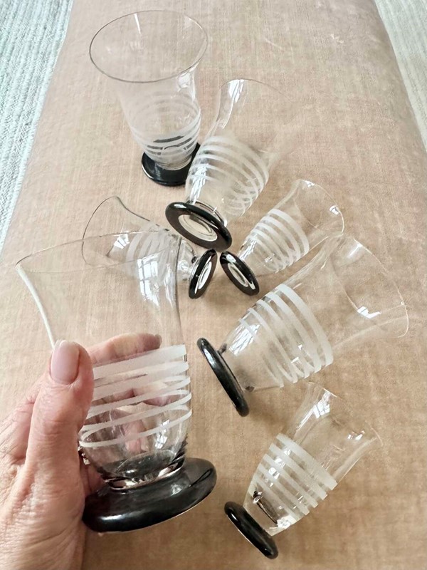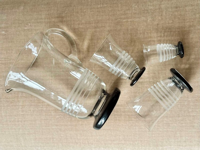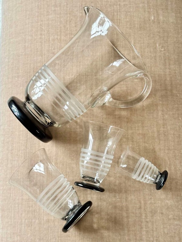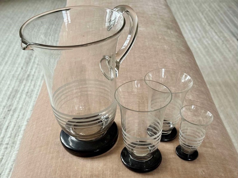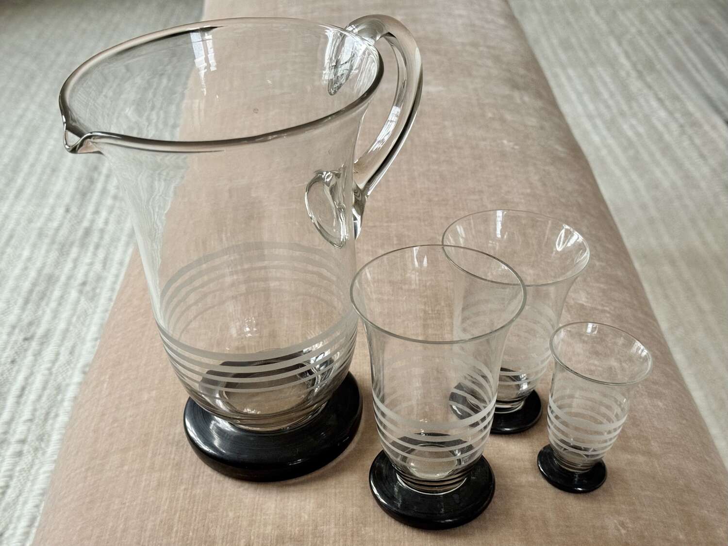 Set Art Deco Etched Lemonade Cocktail Jug & Tumblers With Black Bases