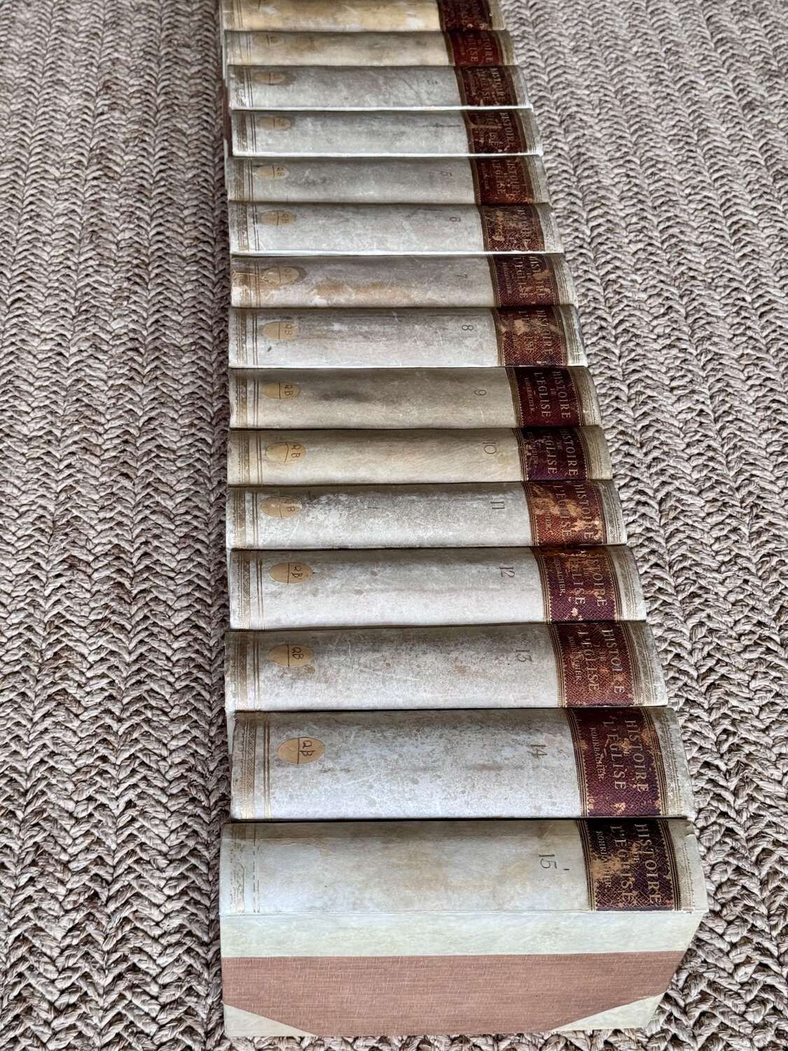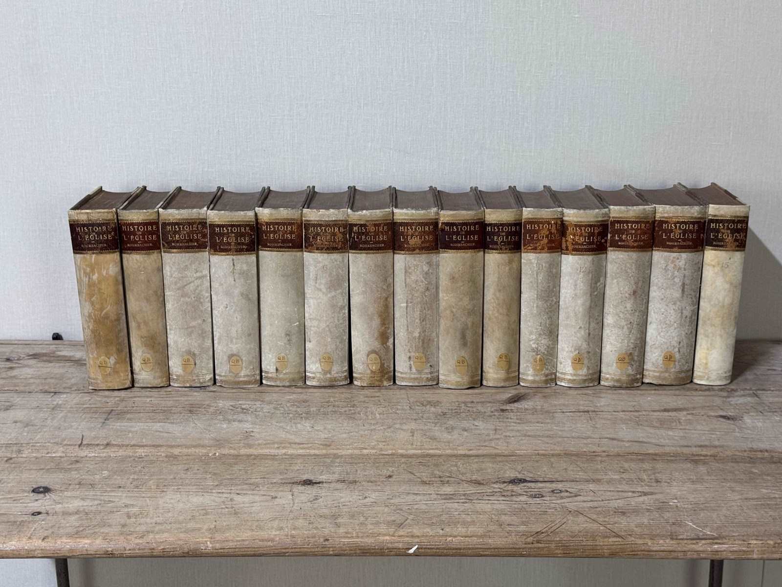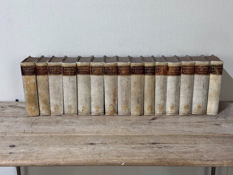 An outstanding collection of antique gold tooled velum leather half bound books, 15 Volumes in total, published 1889. Entitled ‘Histoire de l'Eglise’, published by Louis Vives, Paris. In excellent antique condition, these large and decorative books make a strong representation in a library or book shelf. Historical Note: Bought from a retired book seller, hence the £2250 sale price marked in pencil inside the front cover. Total length of run is 100cm
