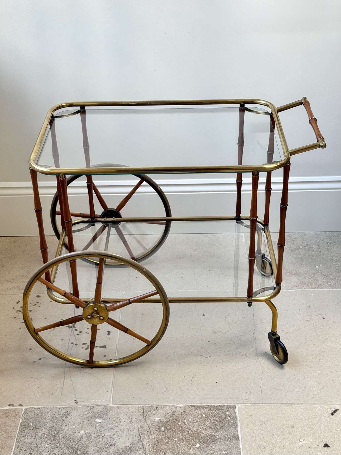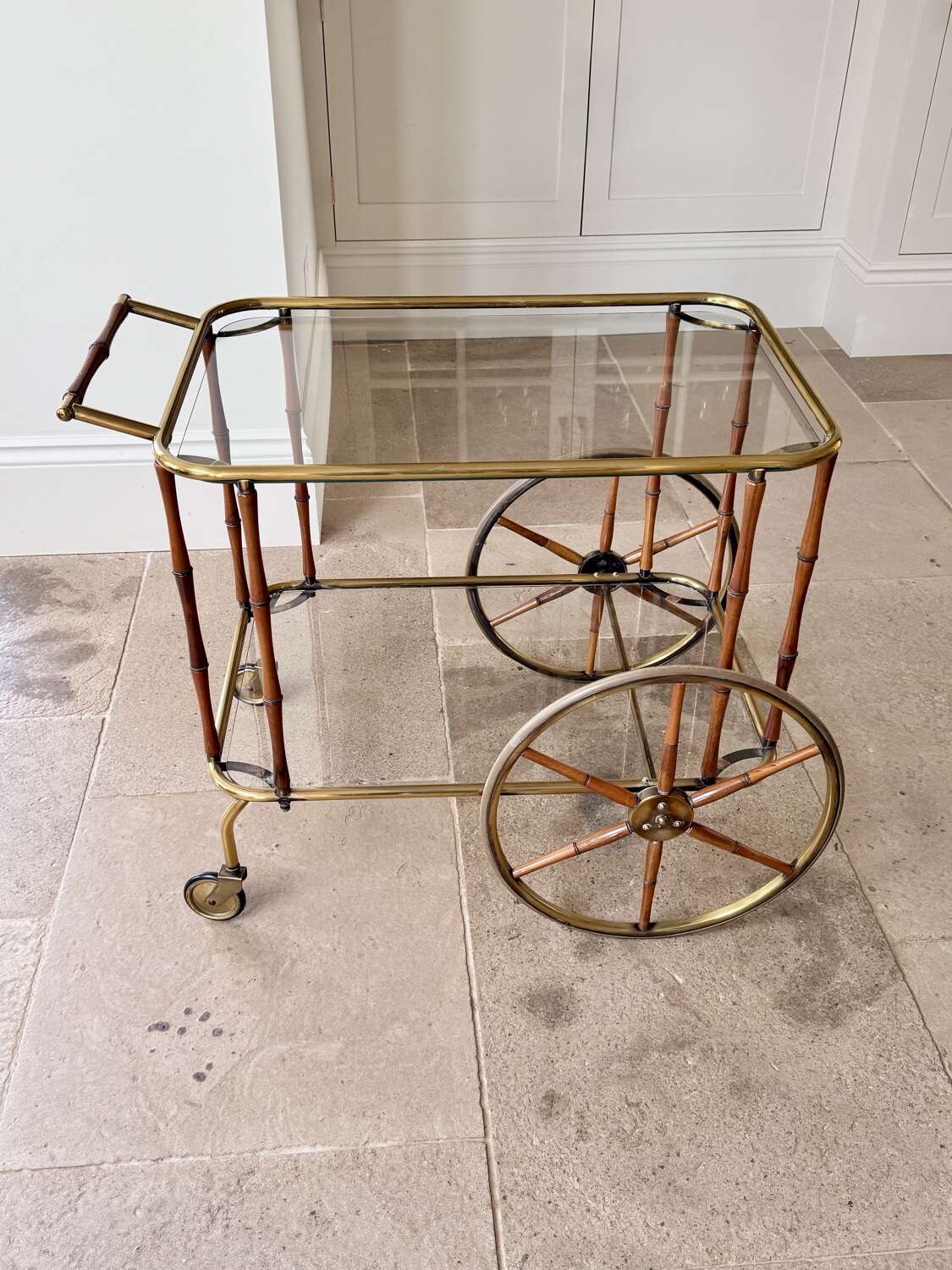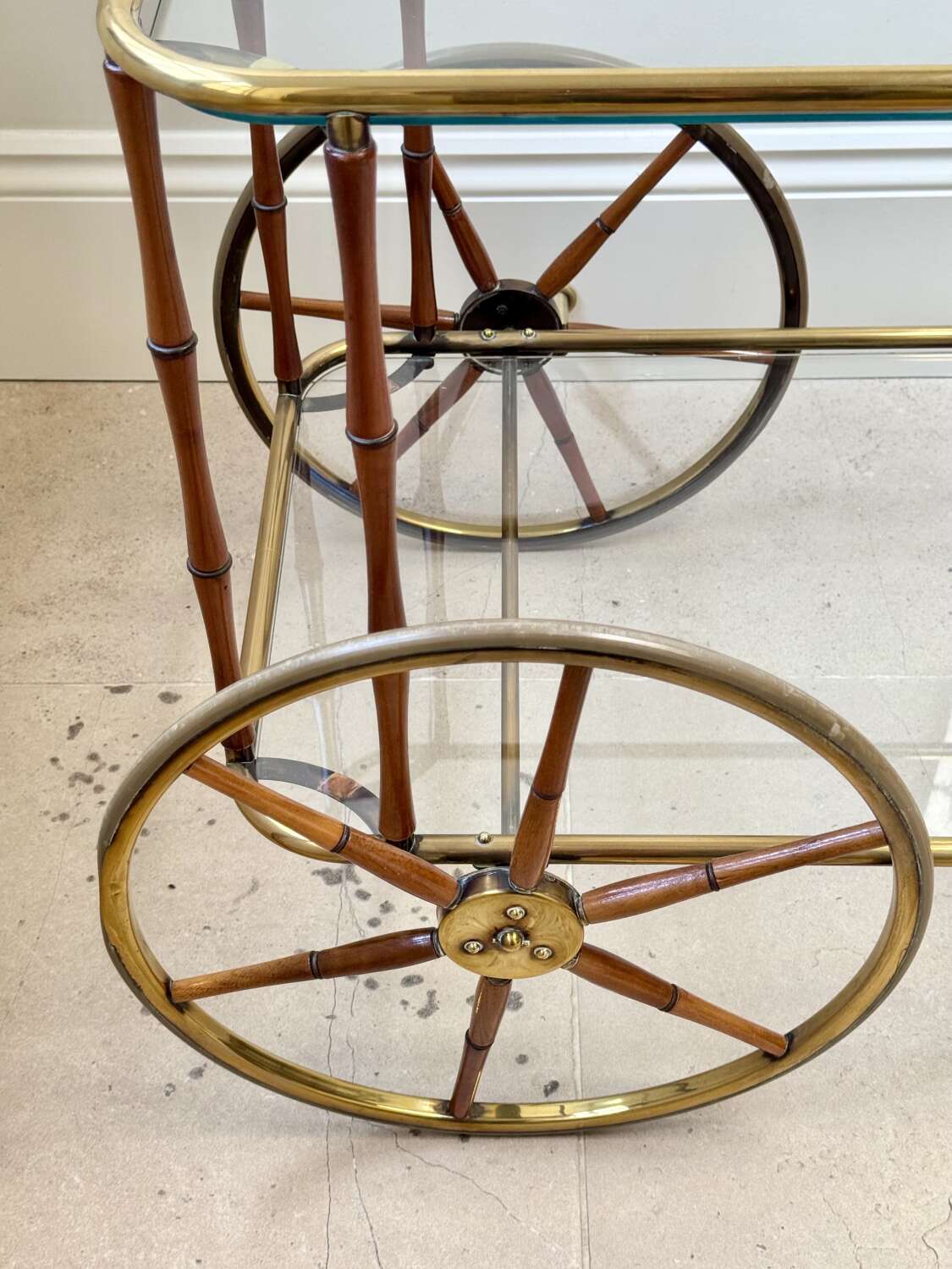 A superb quality French vintage faux bamboo wooden and brass cocktail trolley by Maison Jansen, Circa 1960. In excellent original condition, this striking bar cart has large scale front wheels, glass shelves and beautiful detailing. The trolley rolls along well and is perfect to wheel out when needed; looking smart as a side table when not in use.