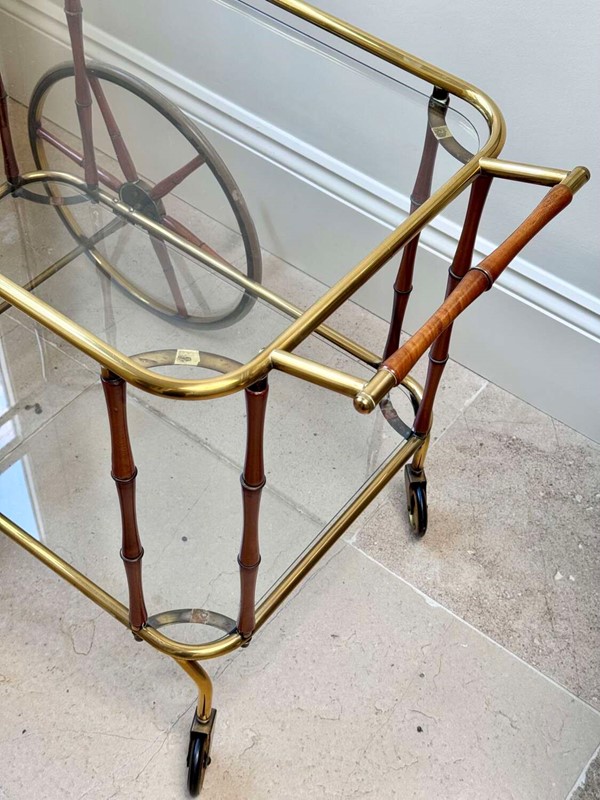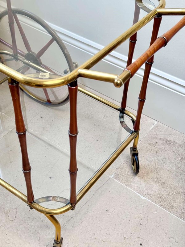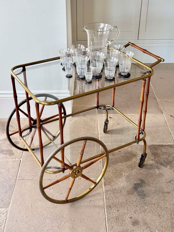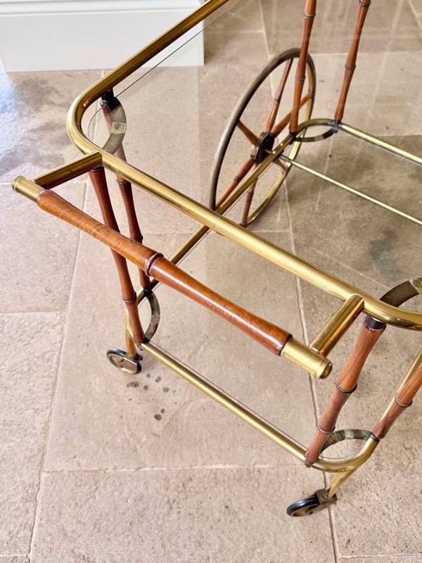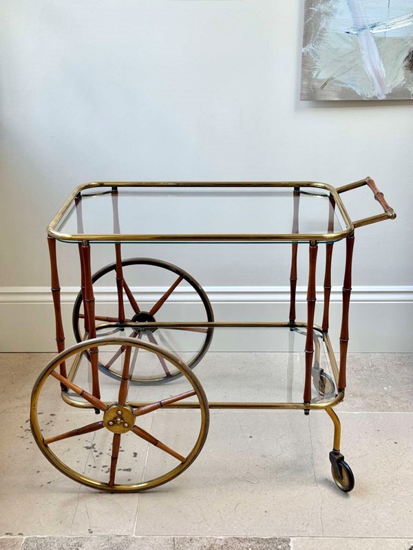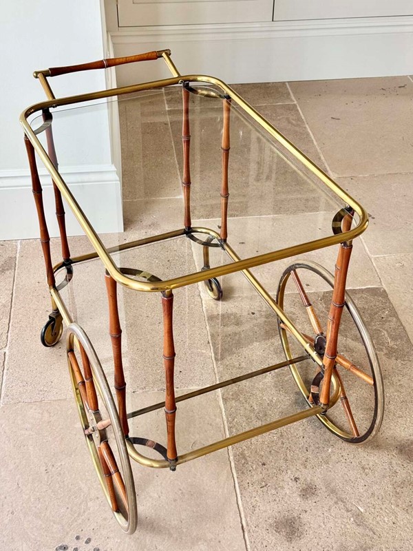 A superb quality French vintage faux bamboo wooden and brass cocktail trolley by Maison Jansen, Circa 1960. In excellent original condition, this striking bar cart has large scale front wheels, glass shelves and beautiful detailing. The trolley rolls along well and is perfect to wheel out when needed; looking smart as a side table when not in use.