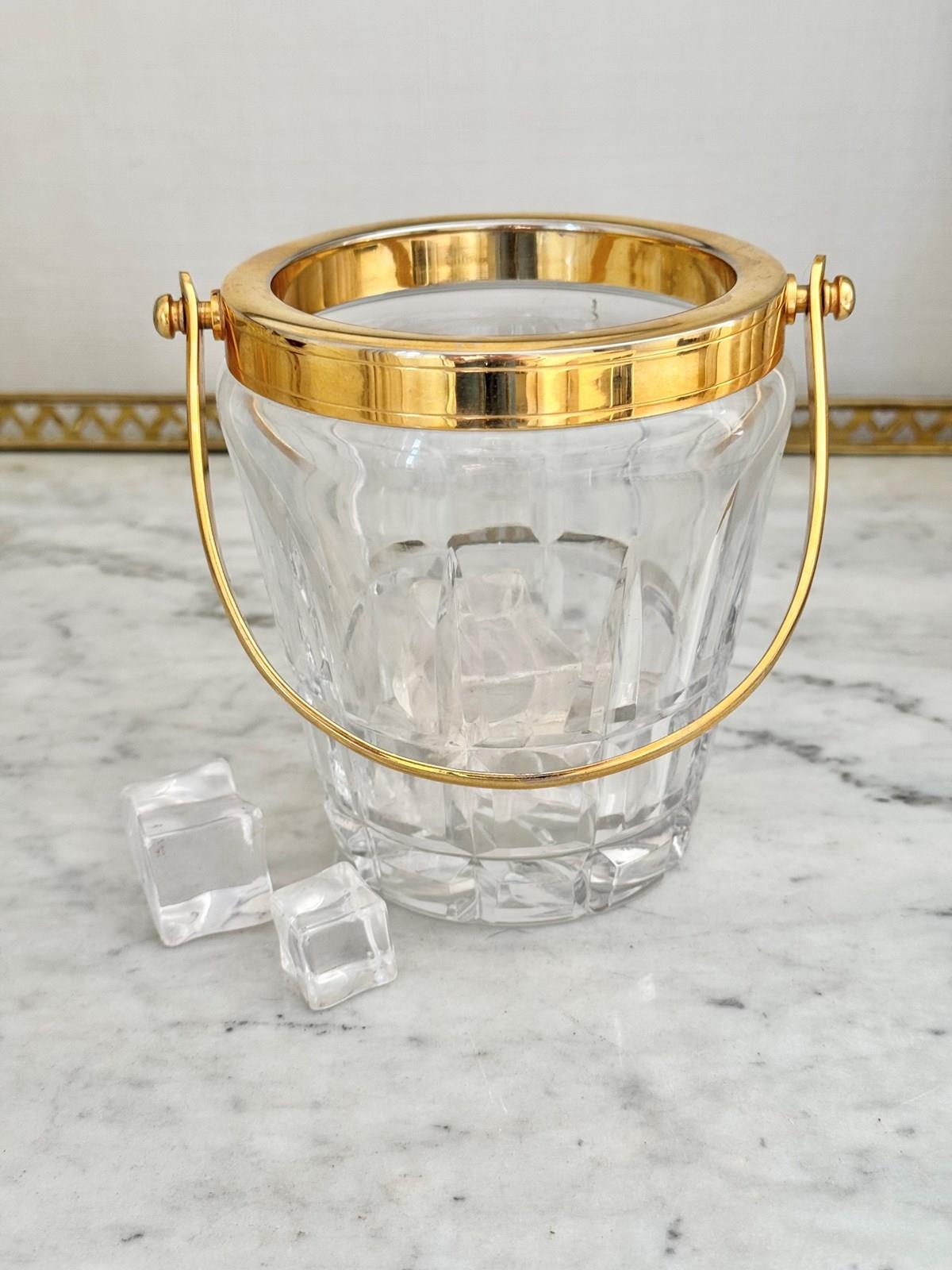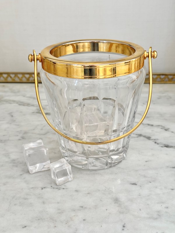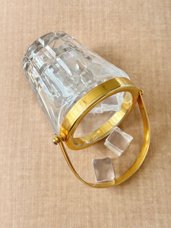 An exceedingly smart heavy cut crystal ice bucket with gold plated mount and swing handle, Circa 1960 by Val Saint Lambert. Superb quality as expected from this internationally recognised luxury maker, this excellent ice bucket is perfect for the home bar.