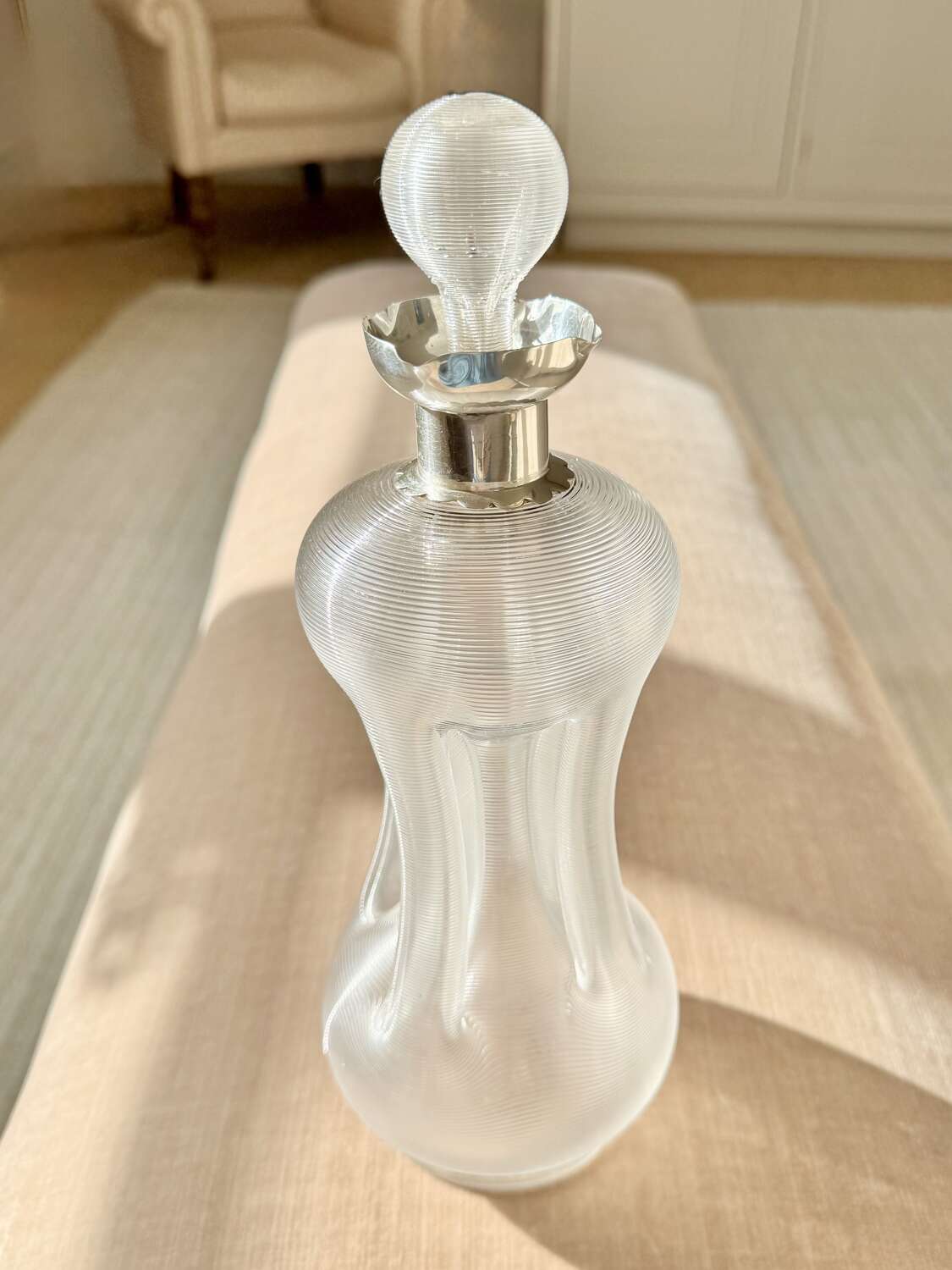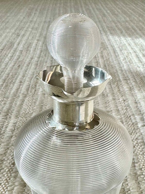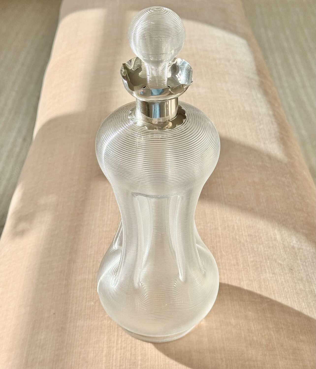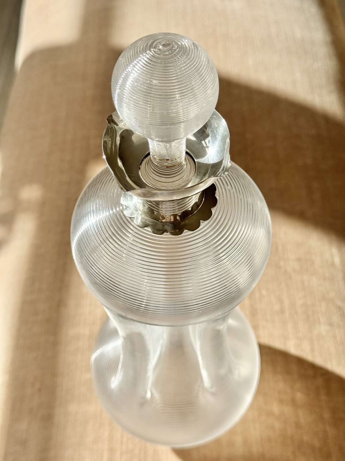 Afinequality Victorian hand craftedand ribbed cut ‘striker’ glass Glug Glug decanter with silver collar and original ribbed stopper containing a single air bubble. The piece has a polished pontil base and worn silver hallmark, Circa 1890. In excellent antique condition.