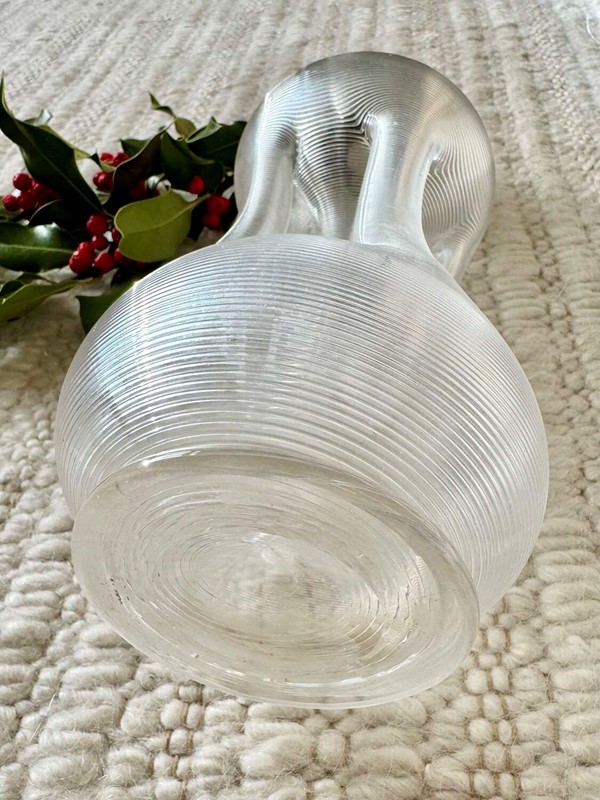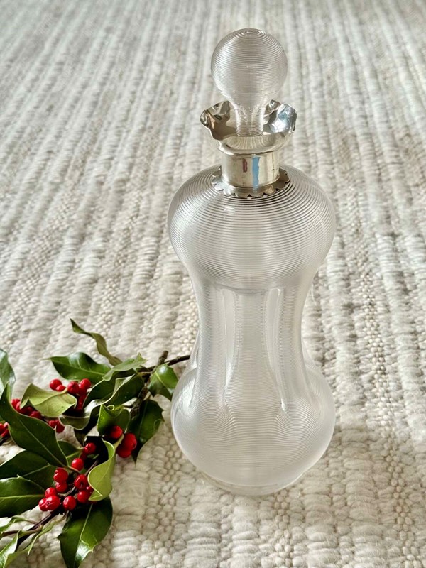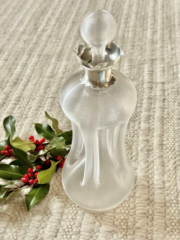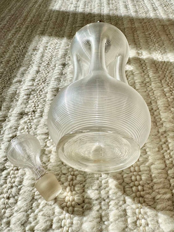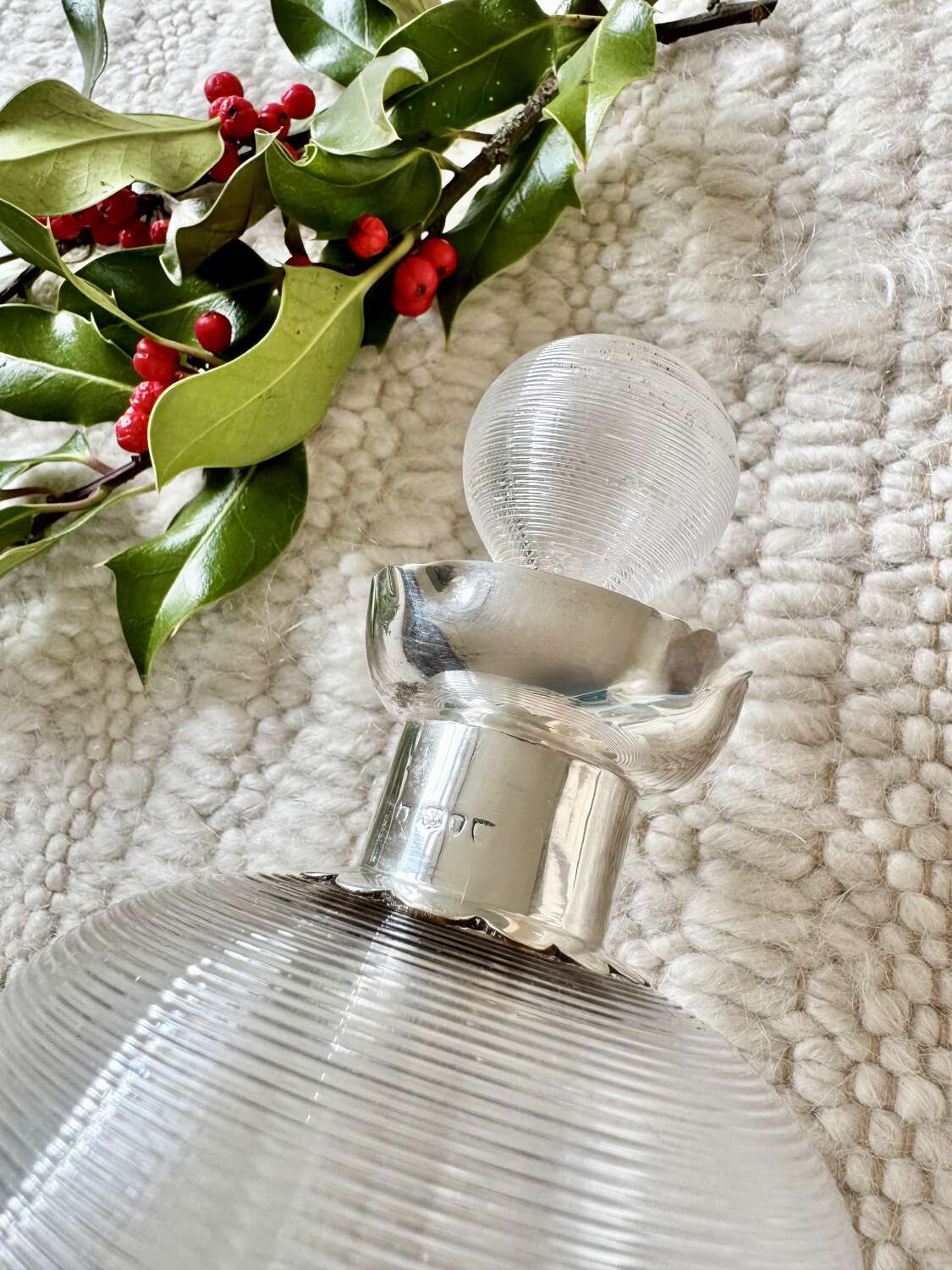 Afinequality Victorian hand craftedand ribbed cut ‘striker’ glass Glug Glug decanter with silver collar and original ribbed stopper containing a single air bubble. The piece has a polished pontil base and worn silver hallmark, Circa 1890. In excellent antique condition.