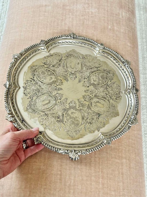 https://www.decorativecollective.com/dealers/the-vintage-entertainerA beautiful 19th Century Victorian, old Sheffield silver plated round serving tray with three well detailed Lion's Paw feet, a ropeand Acacia leaf border and fern & initial etched plate, which has been wonderfully worn down to the warm brass base colour. With makers mark to the base for Richard Richardson Sheffield Circa 1870. Perfect to use for serving drinks or display on a table.