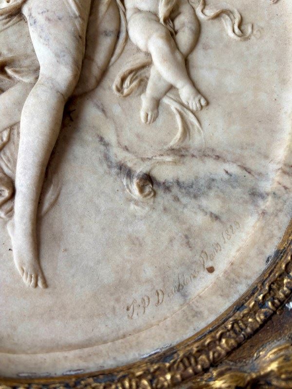 With a scene of a Classical maiden and cherub in billowing robes and holding harps