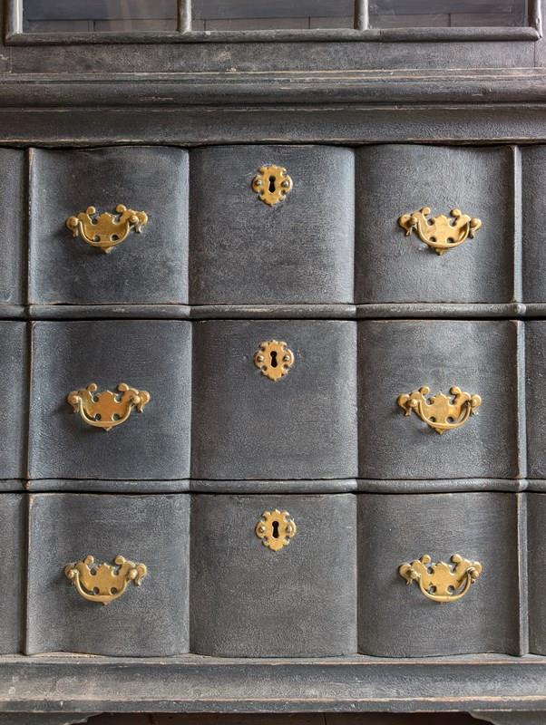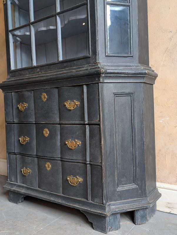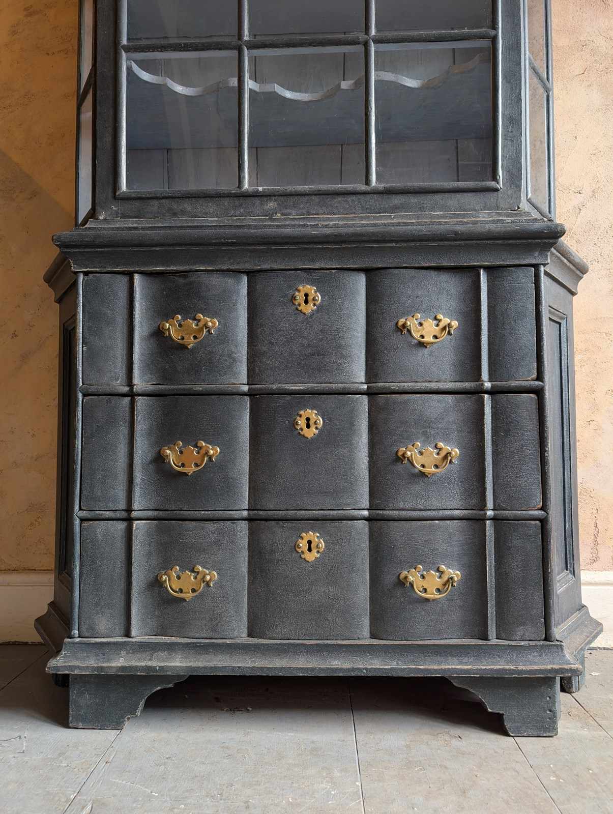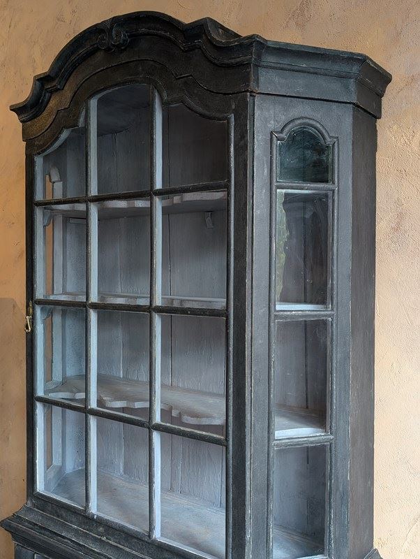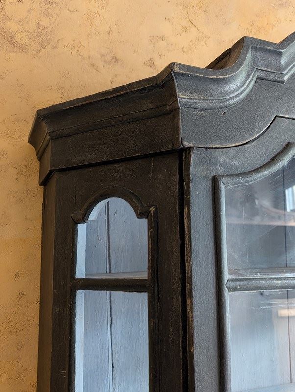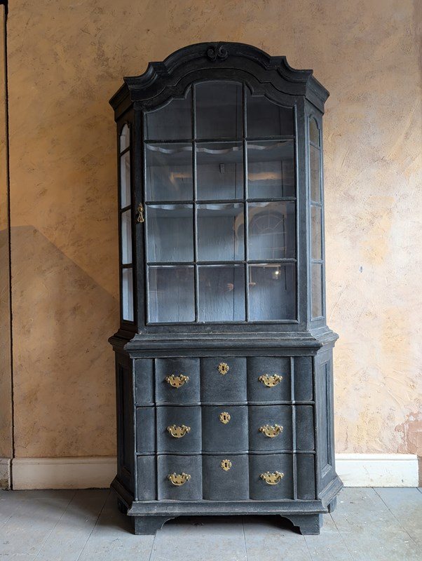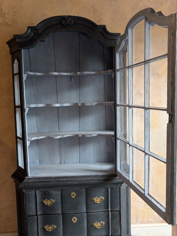 A late 18th, early 19th Century painted, small Dutch oak vitrine. The molded scrolled cornice sits above a single glazed door, which opens on to three nicely shaped shelves. Much of the glass is original. The base comprises of three serpentine shaped block fronted drawers, possibly retaining the original brass handles, later painted.