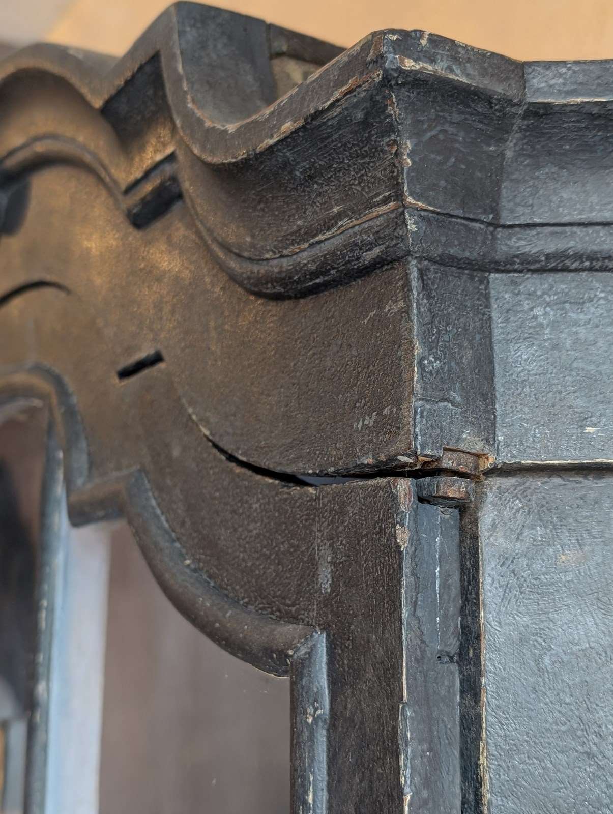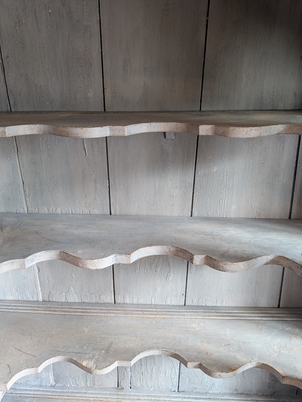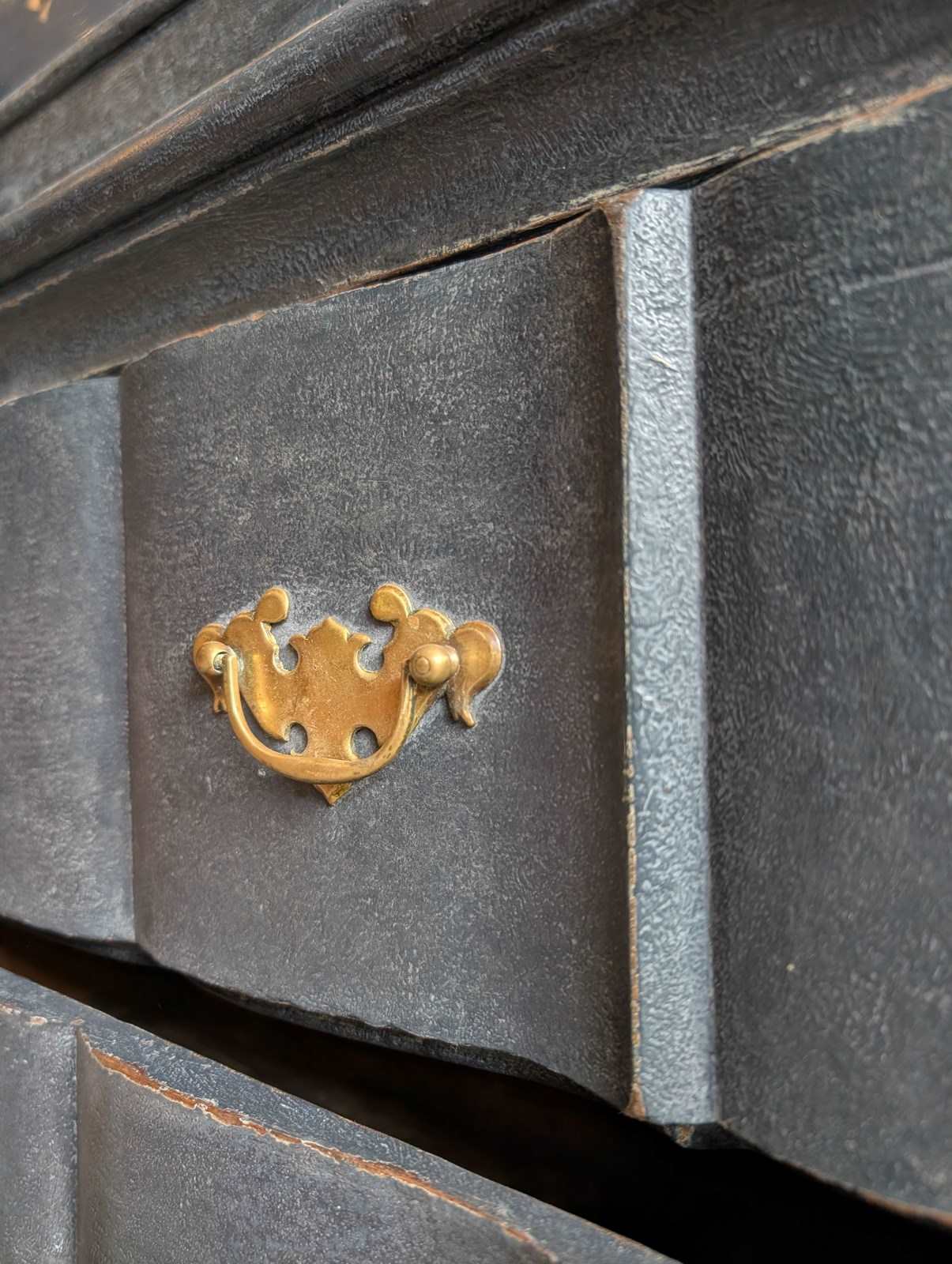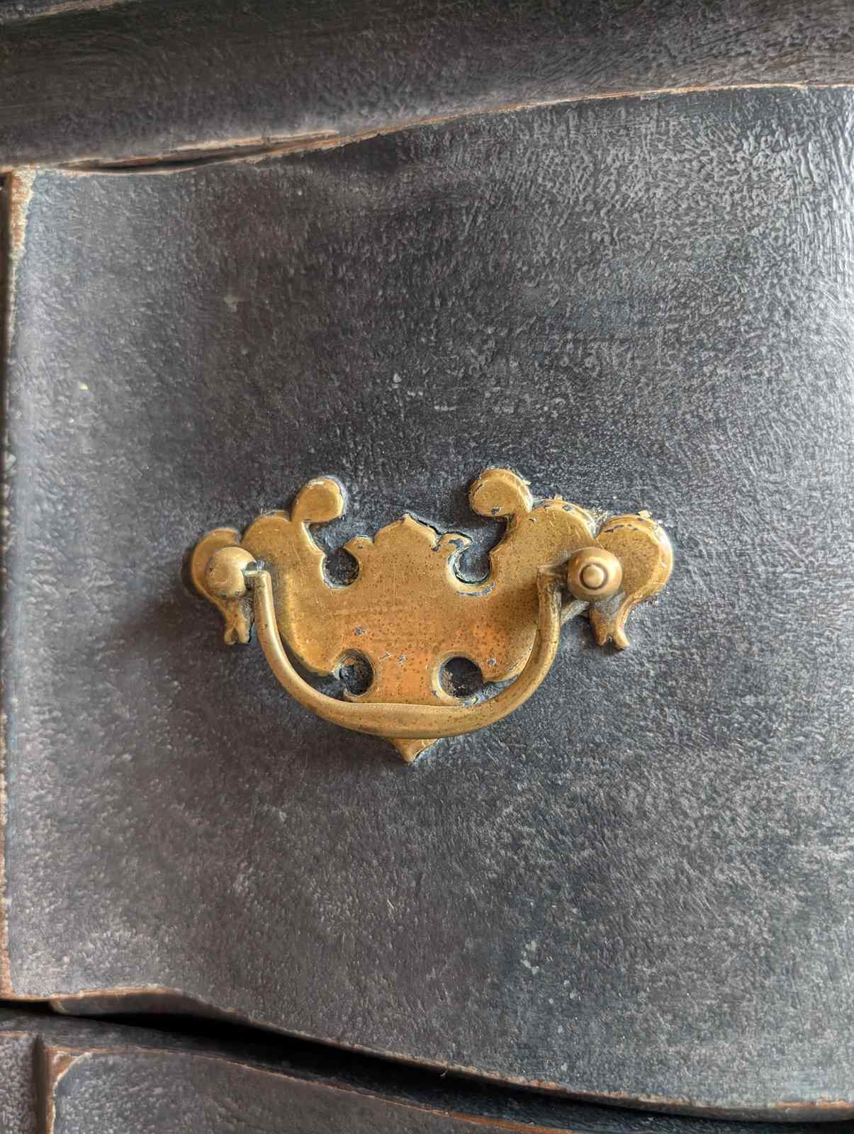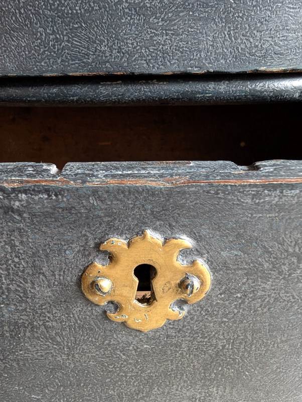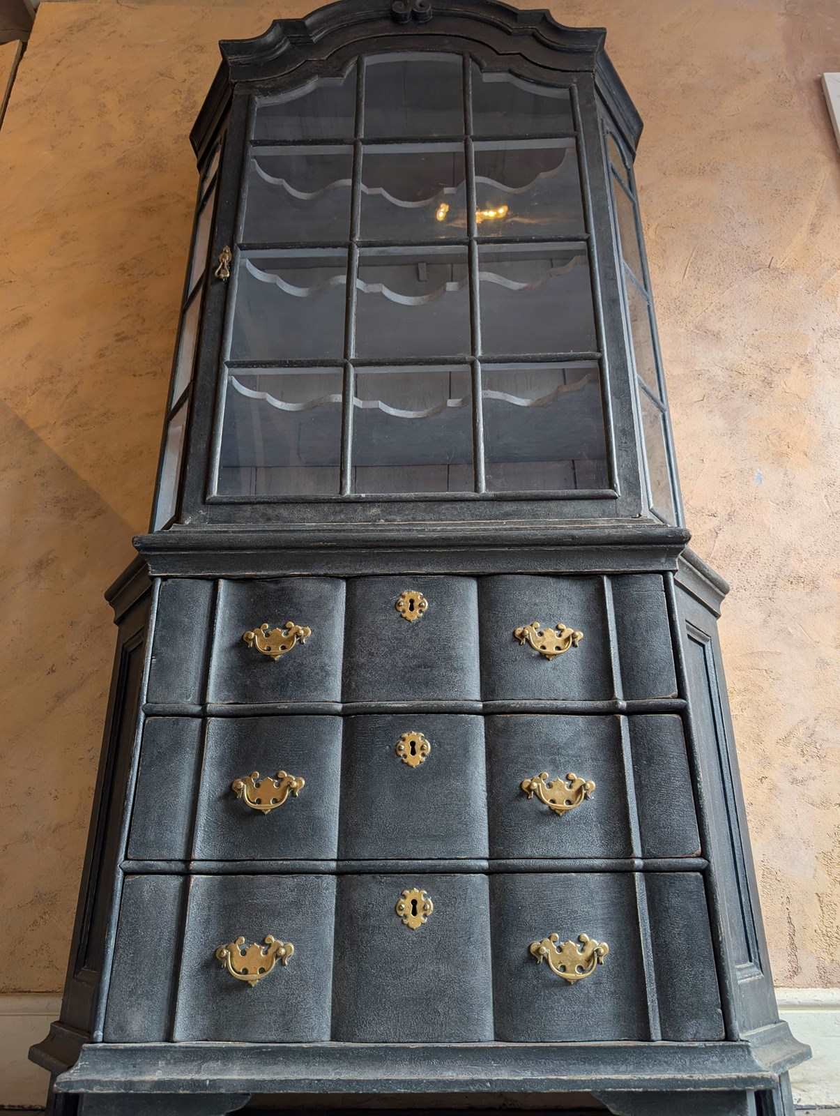 A late 18th, early 19th Century painted, small Dutch oak vitrine. The molded scrolled cornice sits above a single glazed door, which opens on to three nicely shaped shelves. Much of the glass is original. The base comprises of three serpentine shaped block fronted drawers, possibly retaining the original brass handles, later painted.