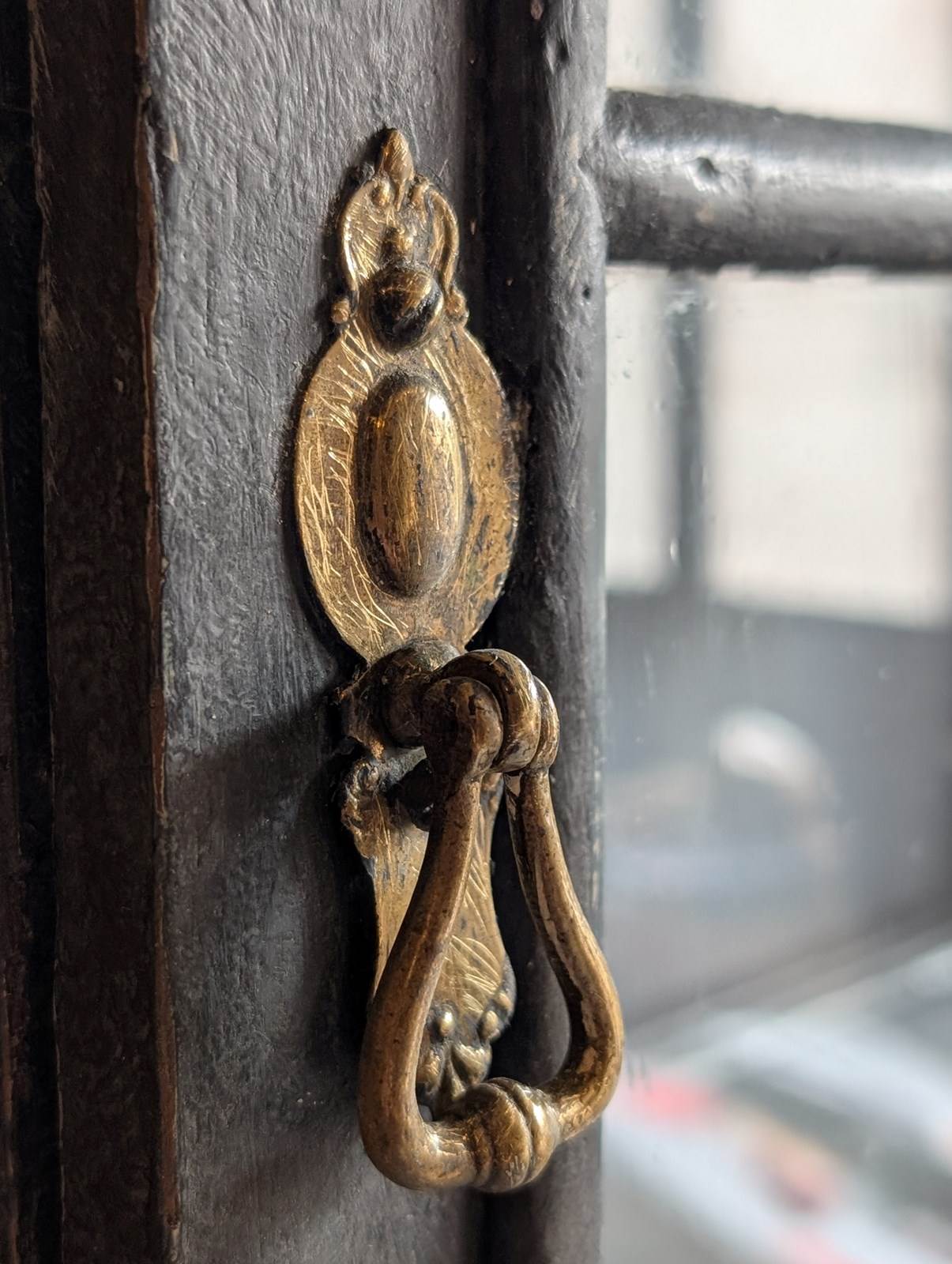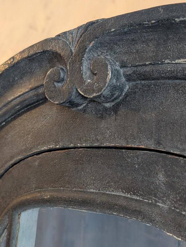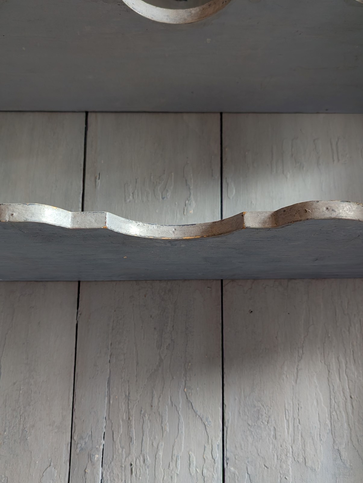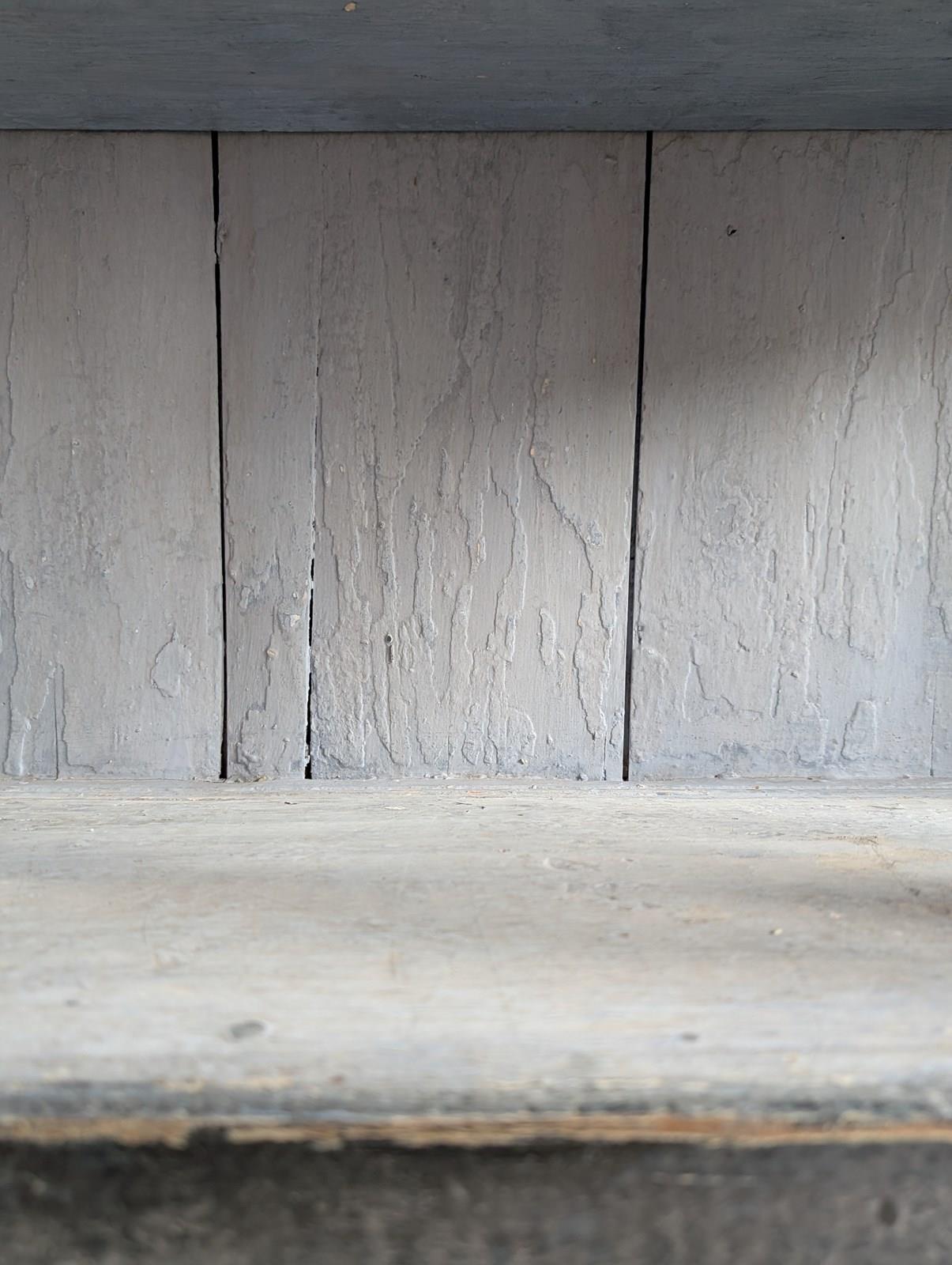 A late 18th, early 19th Century painted, small Dutch oak vitrine. The molded scrolled cornice sits above a single glazed door, which opens on to three nicely shaped shelves. Much of the glass is original. The base comprises of three serpentine shaped block fronted drawers, possibly retaining the original brass handles, later painted.