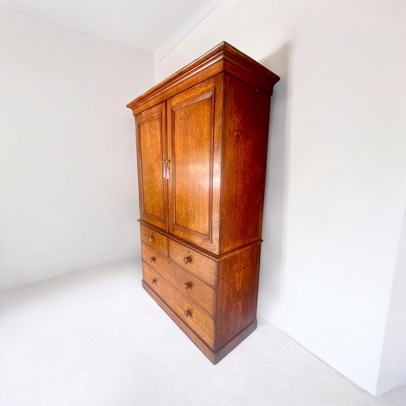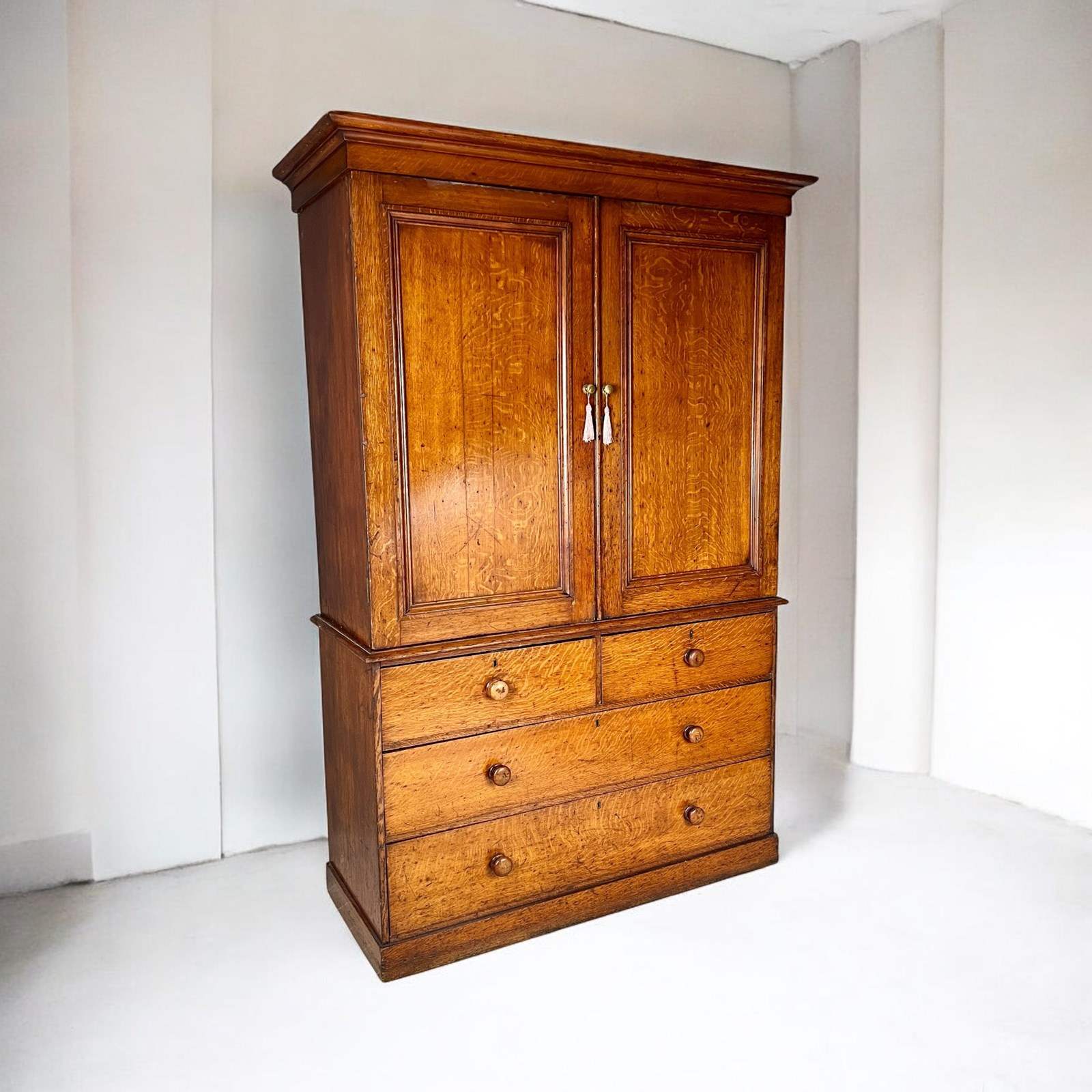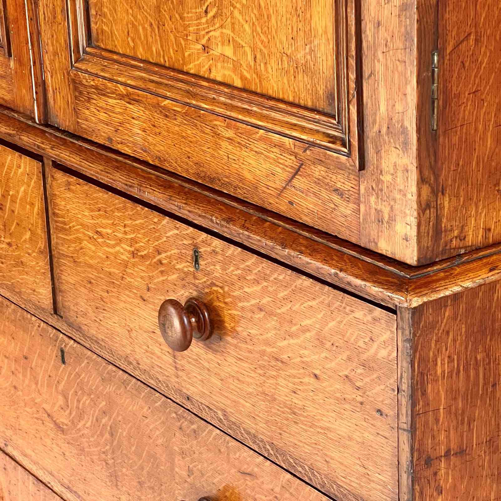 A beautiful and substantial 19th-century oak wardrobe or linen press, boasting a fantastic colour and classic design. This elegant piece splits in half for ease of transport and installation.