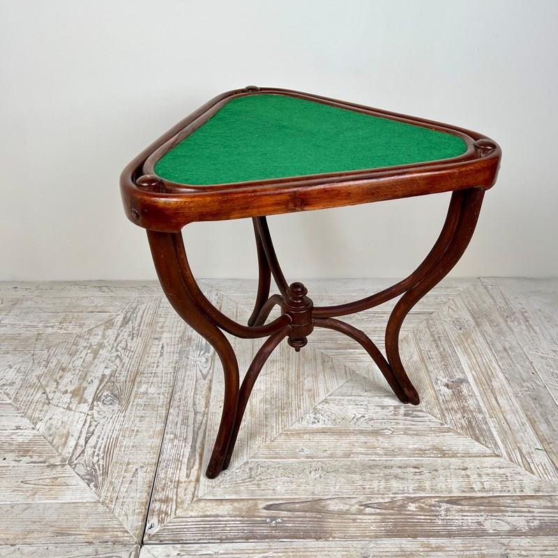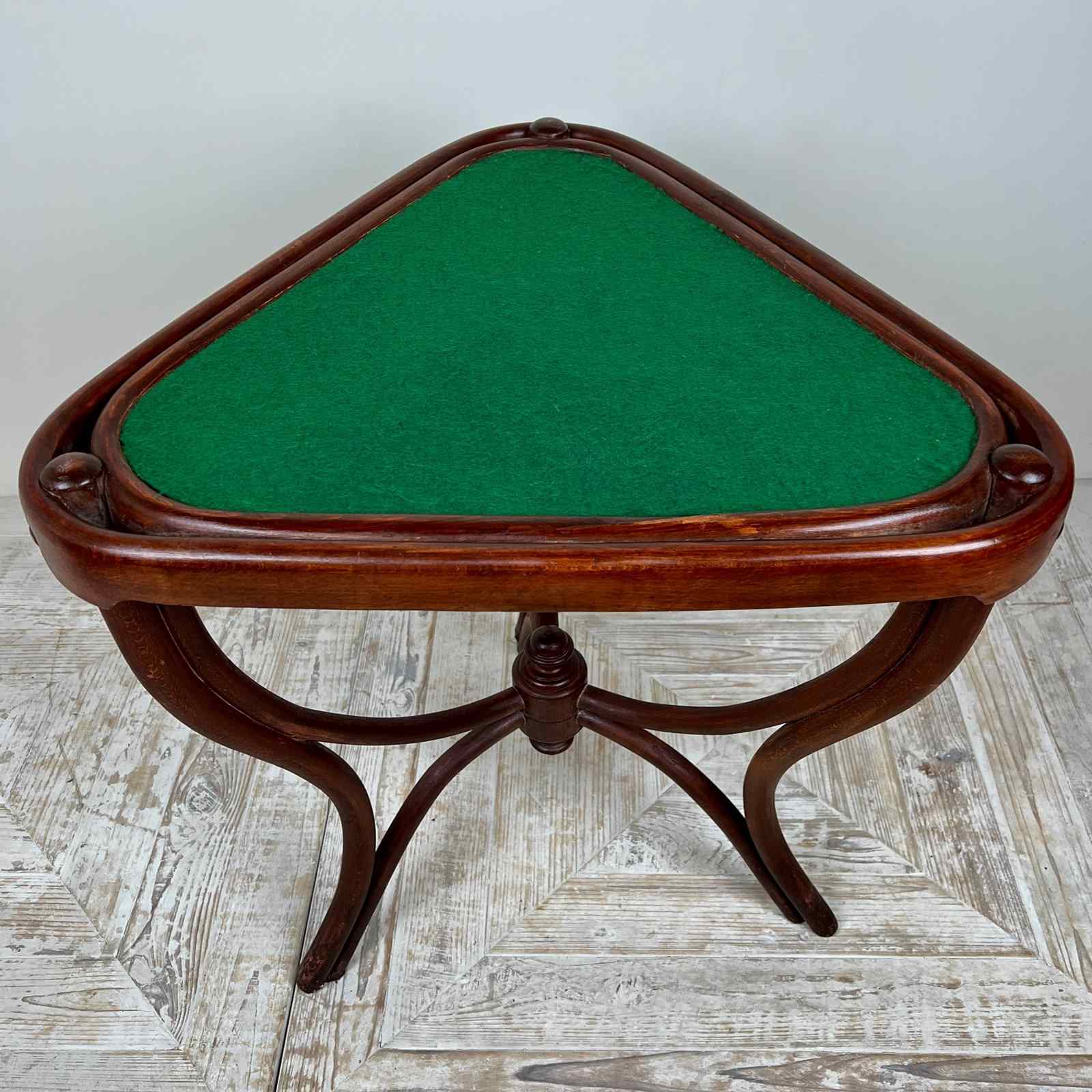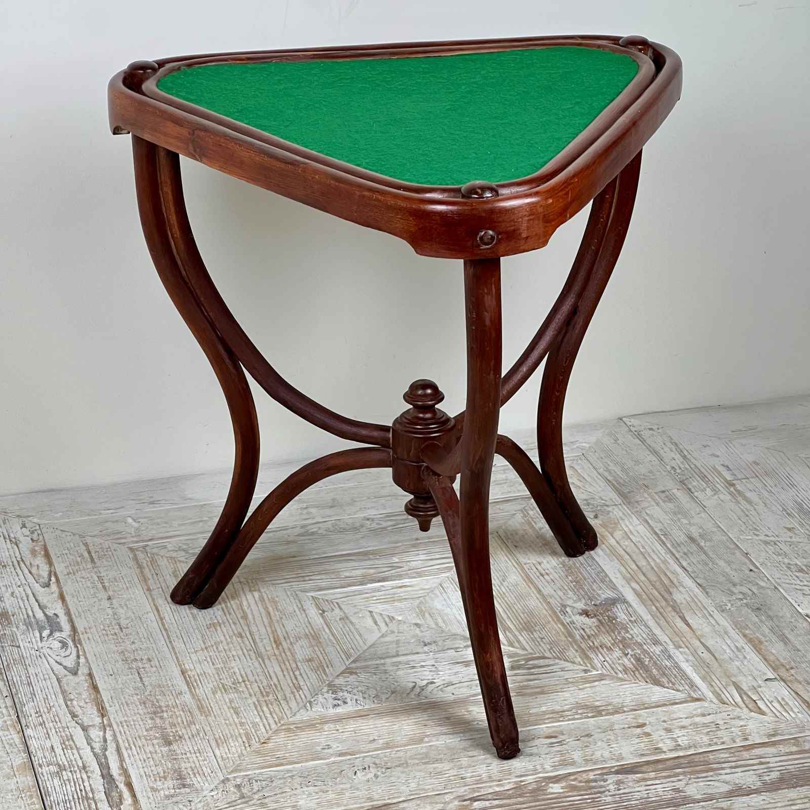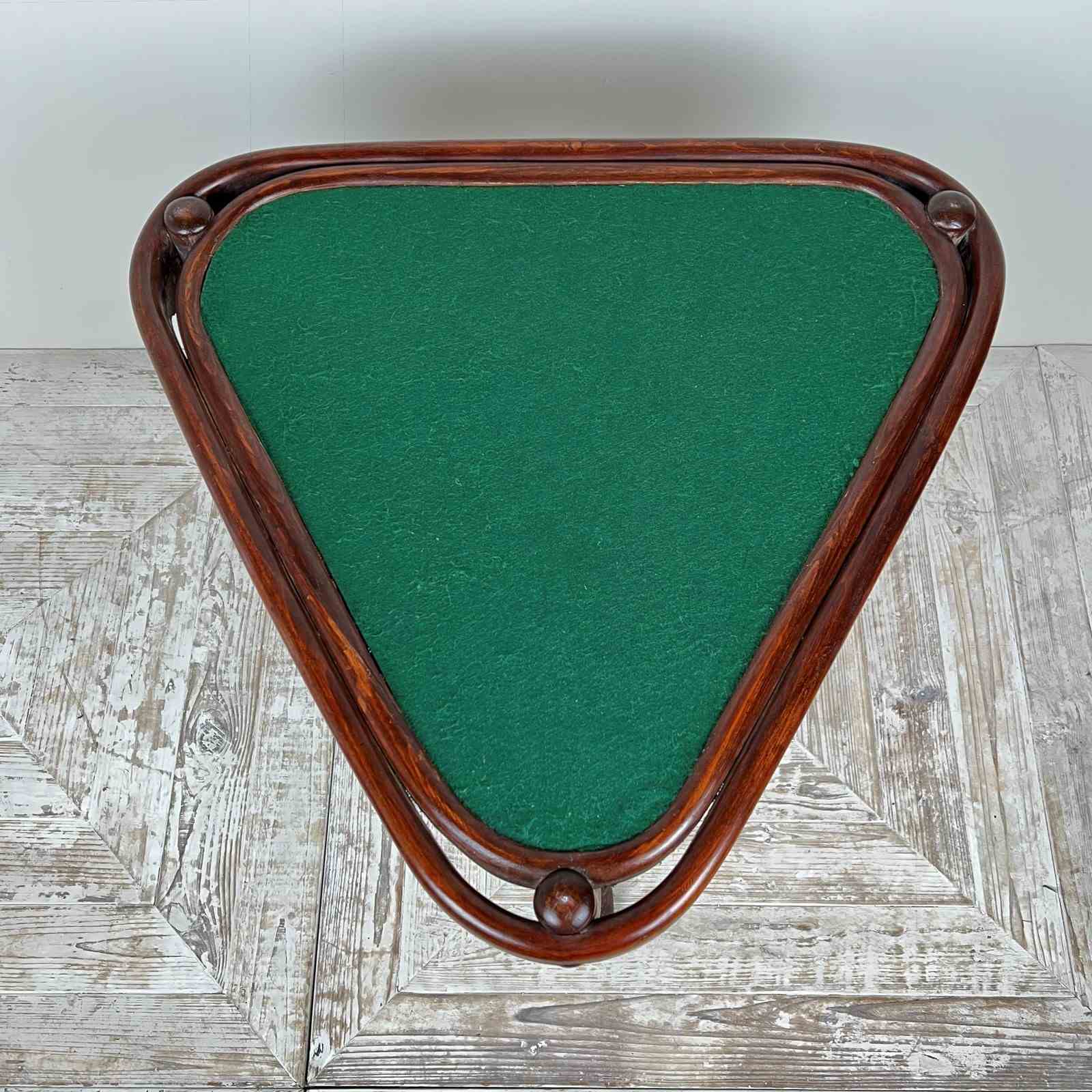 A beautiful bentwood design featuring a triangular playing surface covered in green woollen baize. The table stands on elegantly formed sabre legs joined by a central stretcher with a decorative finial. This rare Thonet design is a charming, fun, and functional piece that could also serve as a side, occasional, or console table. Original Thonet label still intact.