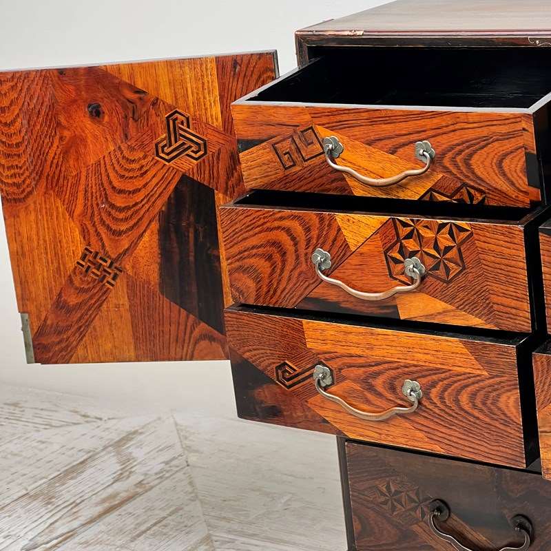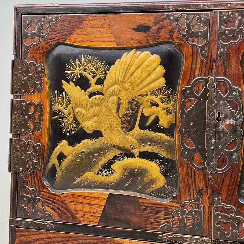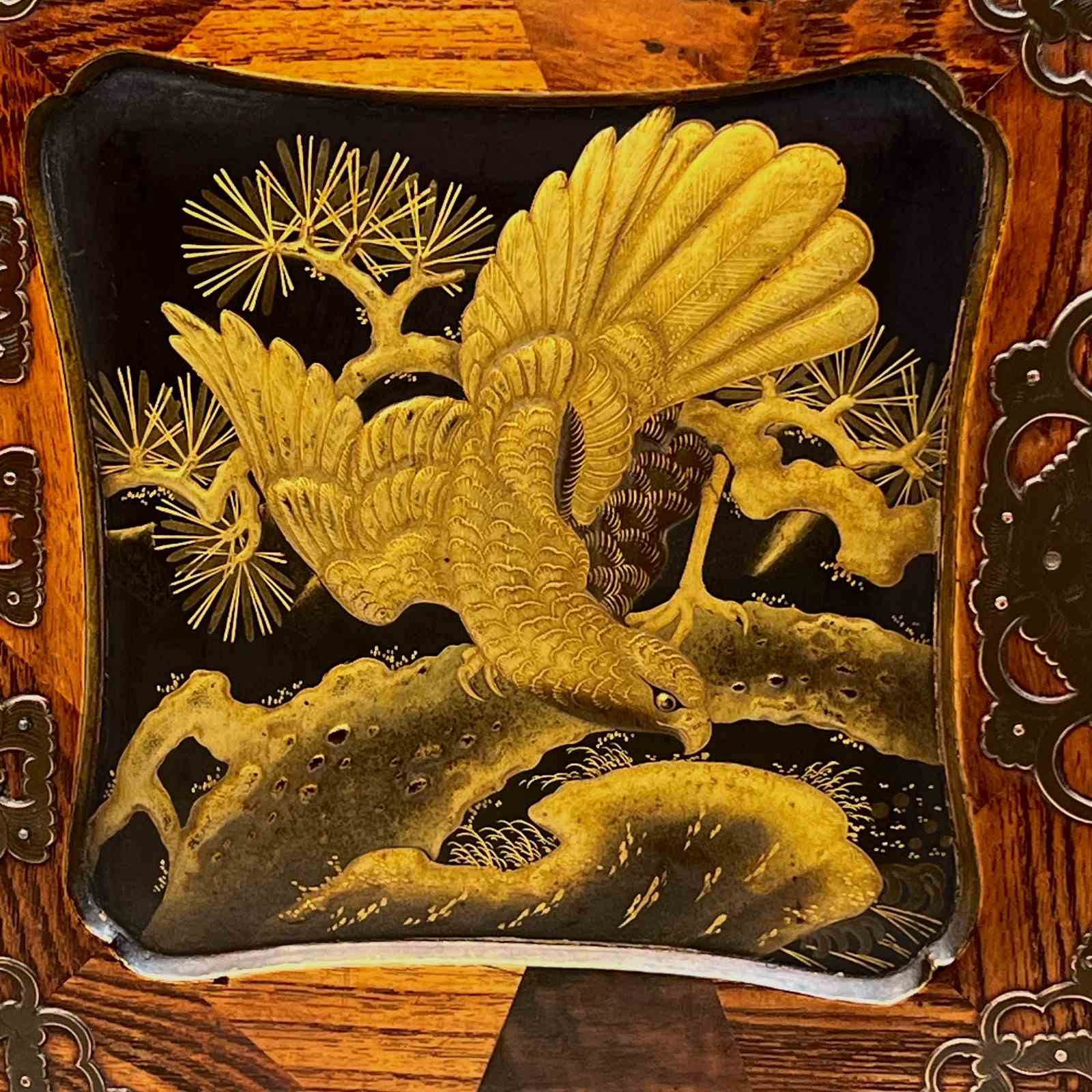 Intricate marquetry and parquetry, relief-gilded and lacquered panels depicting Mount Fuji and an eagle, and beautiful copper ironmongery throughout.