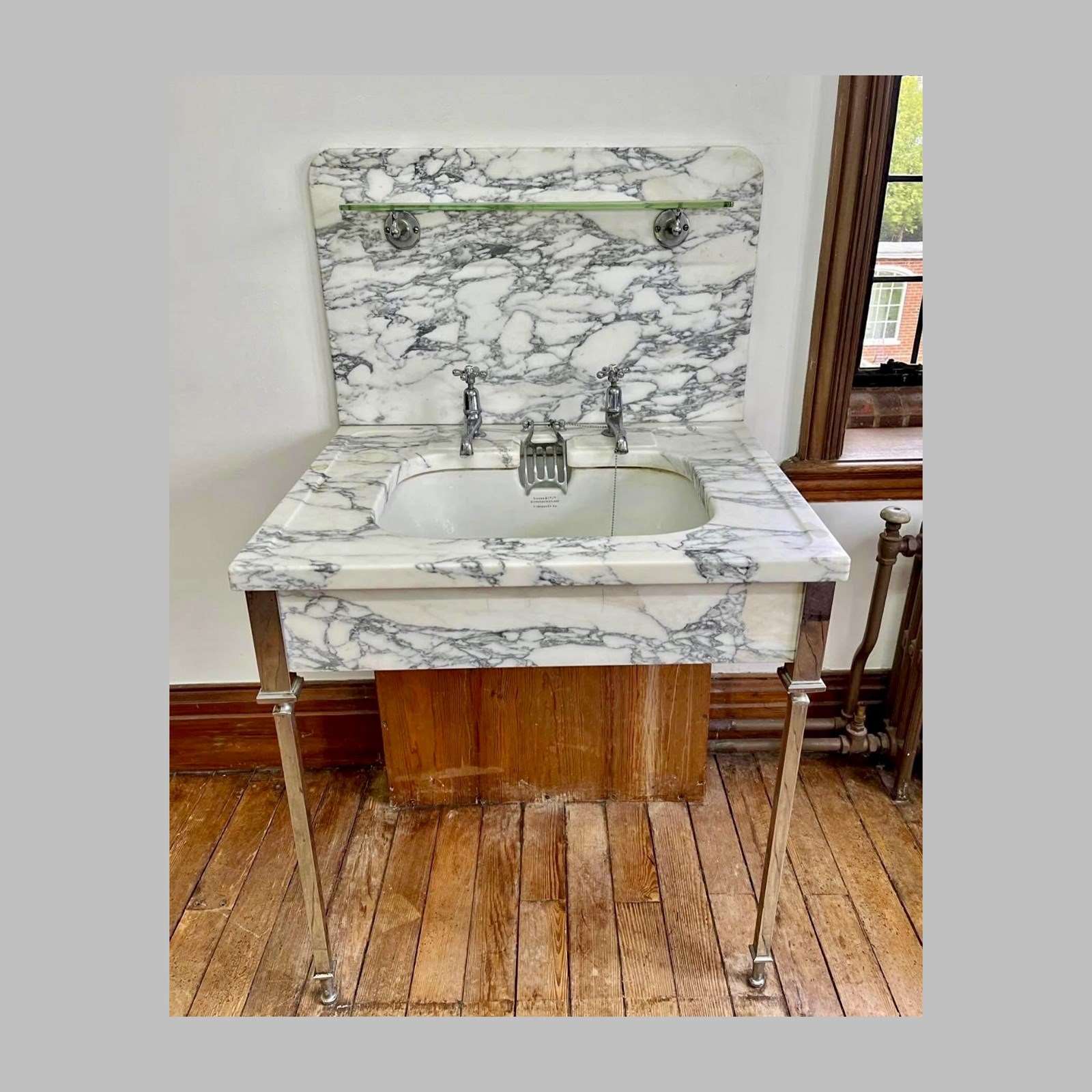 Crafted in their factory in Barrhead, Scotland, it features striking veined marble with a lipped surround to contain water spills and a tall splashback fitted with its original glass shelf. The piece is supported by smart, tapered chrome legs to the front and retains its original chrome taps and grillAn , a testament to its quality. Height given does not include the splashback.