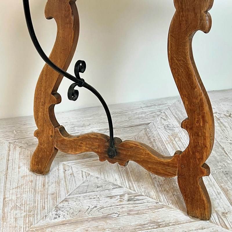 The light oak top rests on elegant lyre-shaped legs, joined by a decorative wrought iron stretcher with simple yet refined detailing at its centre.
