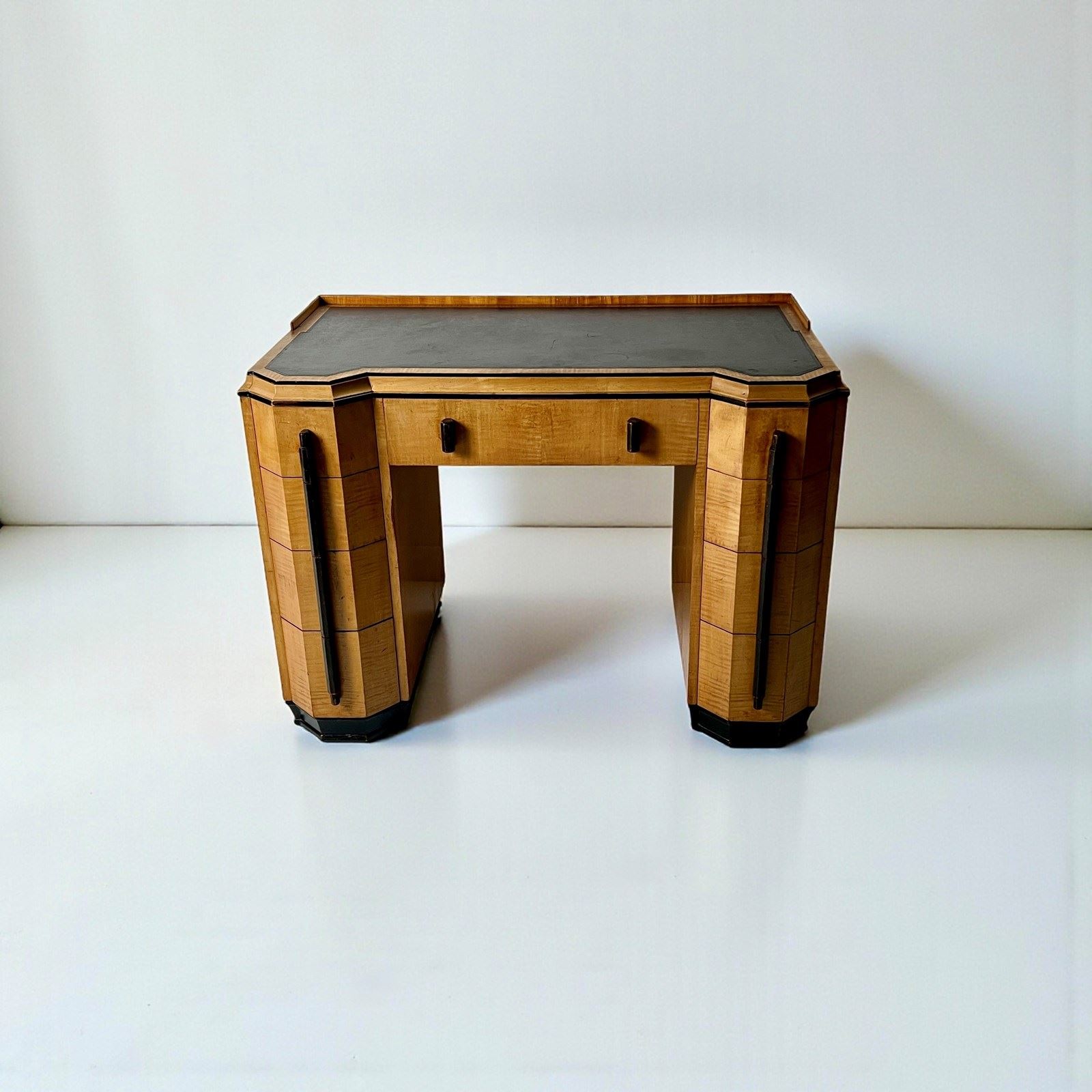 The design is complemented by distinctive shaped ebonised wooden handles, which harmonise seamlessly with the warm tones of the birchwood and reinforce the cohesive Deco aesthetic. An ebonised plinth base provides a strong visual contrast and grounds the piece with confidence and presence.