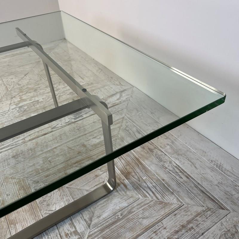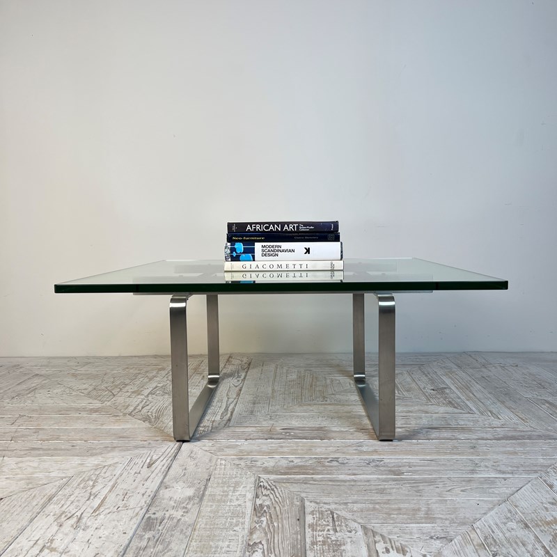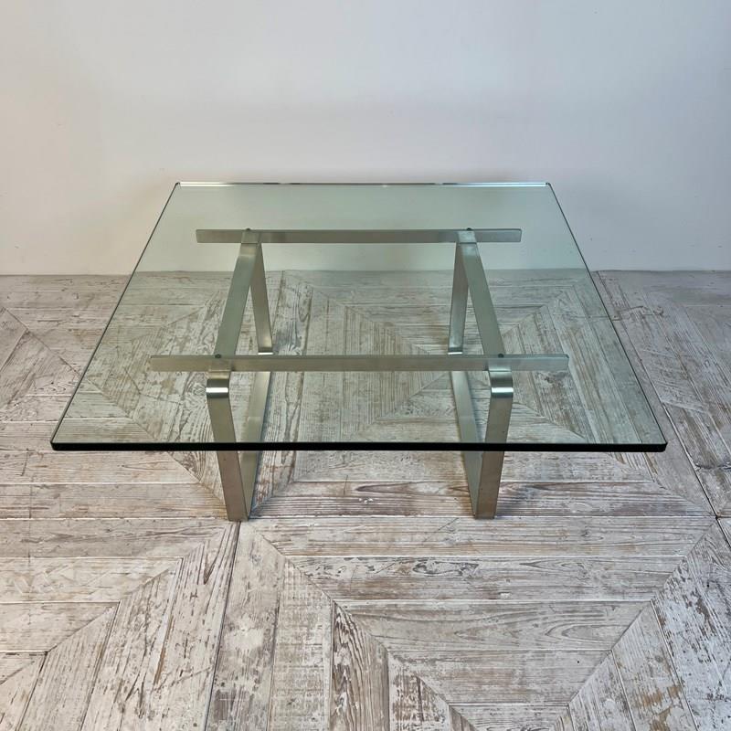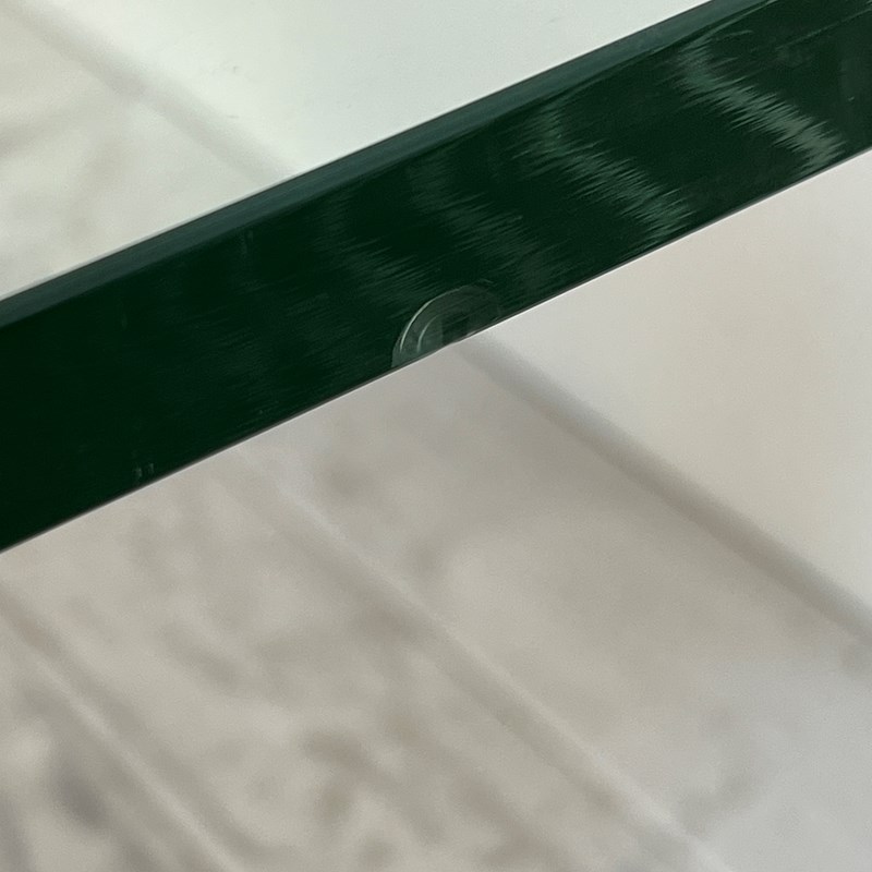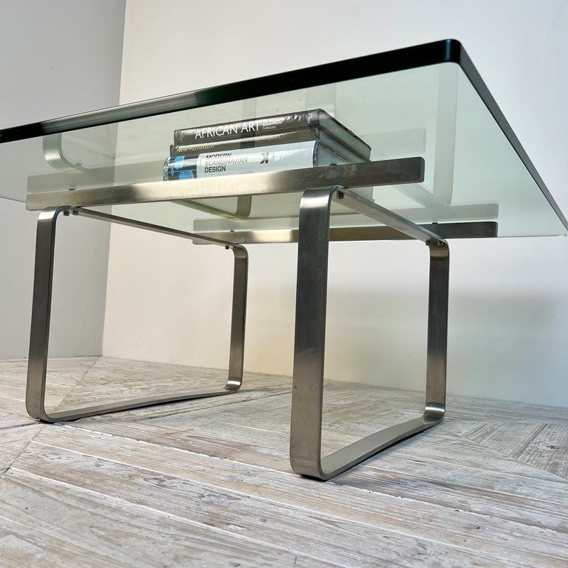 This table features a thick, square glass top resting on a sturdy frame made from bent flat steel. Two trestles are joined by crossbars that both stabilize the frame and support the glass. The clear top highlights the table’s structure, giving it a light and open look. The glass top is extremely heavy toughened glass and requires two people to lift.