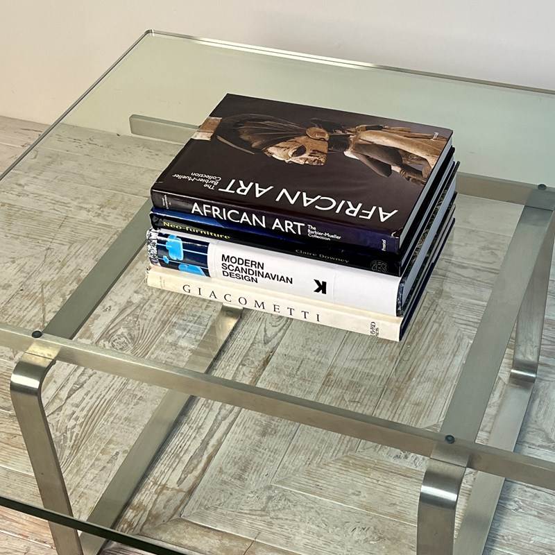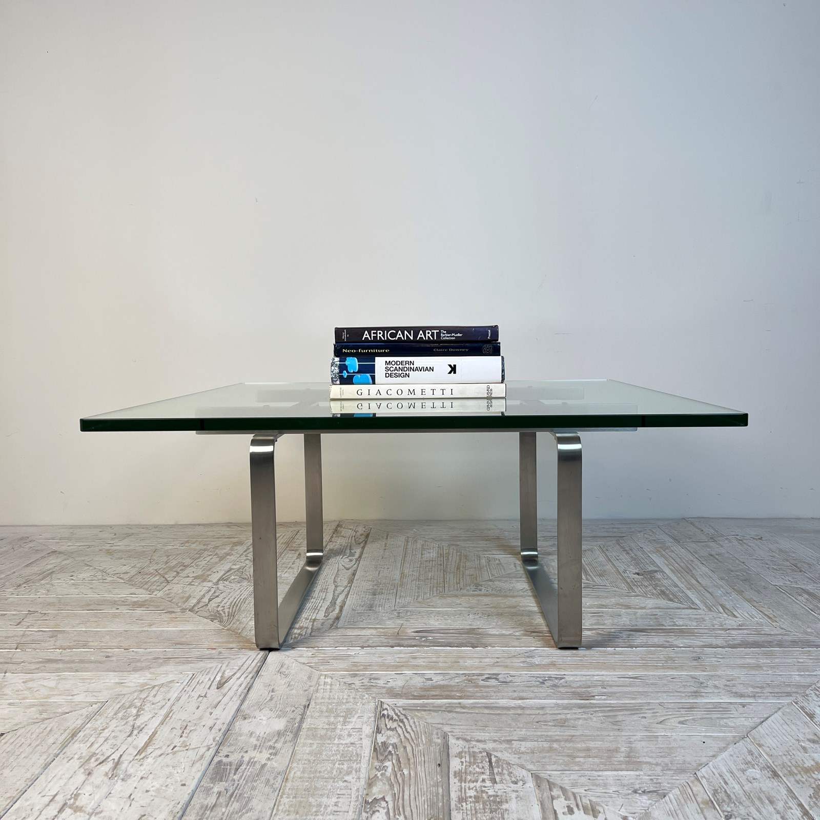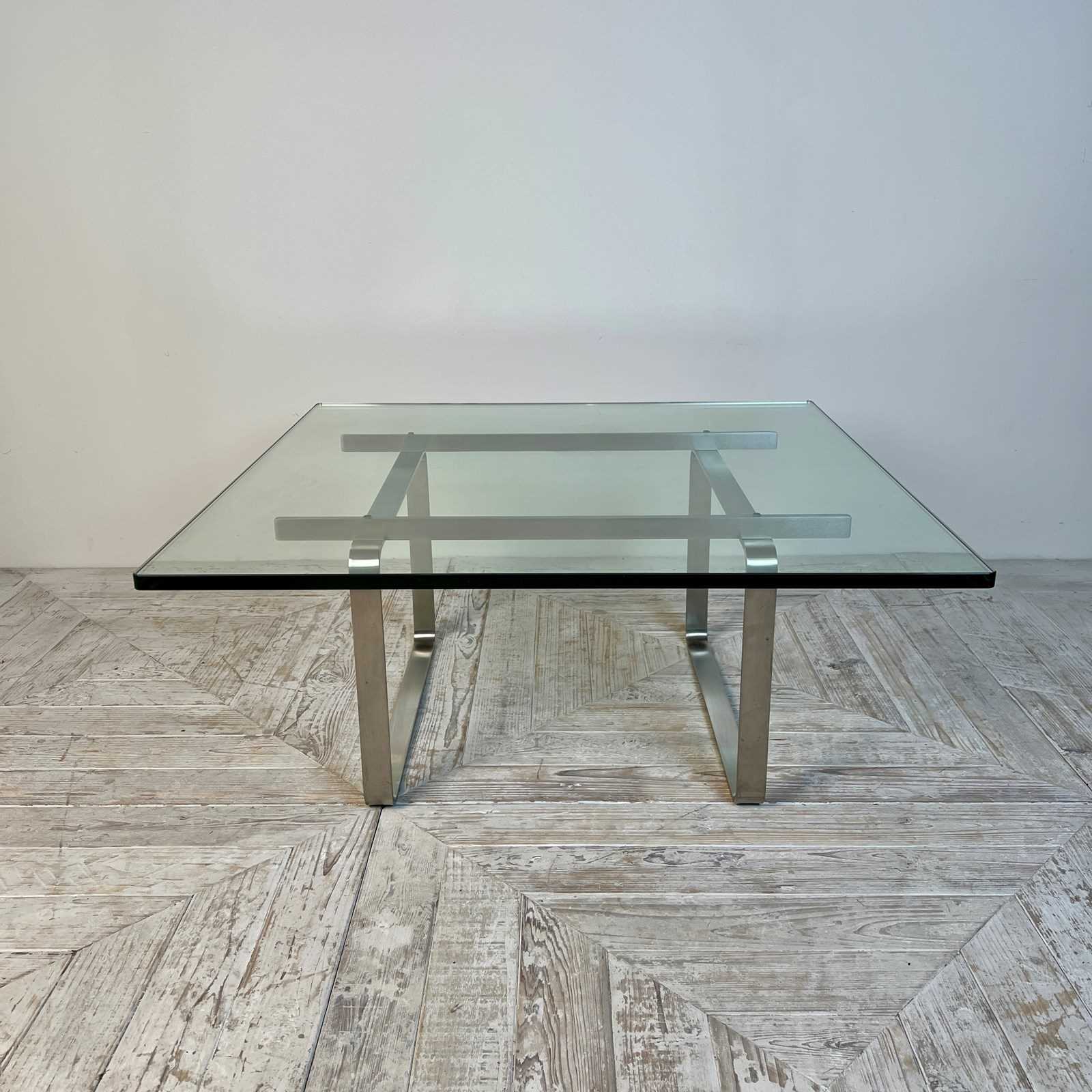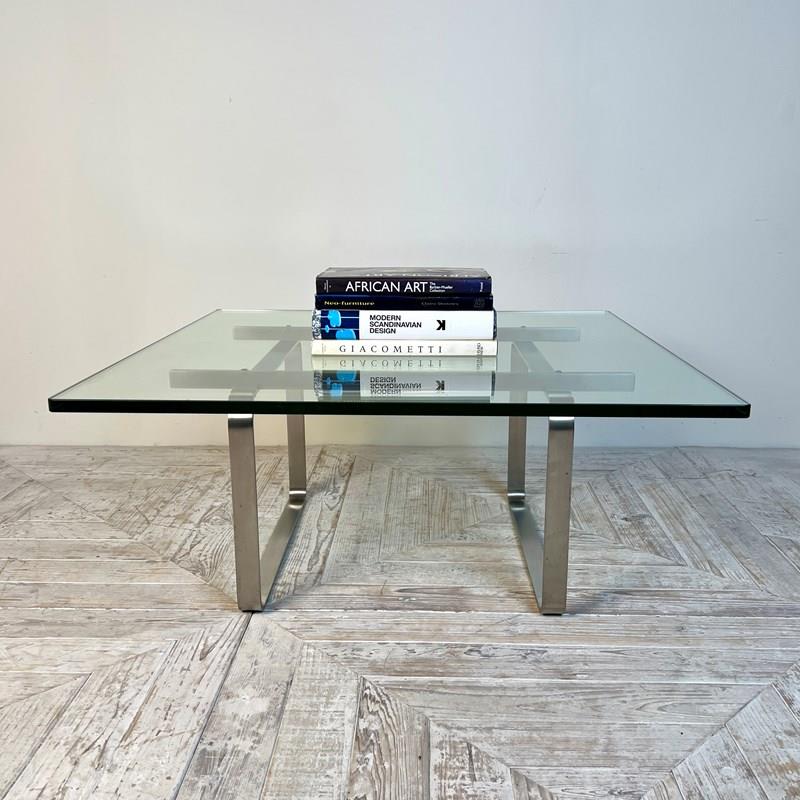 This table features a thick, square glass top resting on a sturdy frame made from bent flat steel. Two trestles are joined by crossbars that both stabilize the frame and support the glass. The clear top highlights the table’s structure, giving it a light and open look. The glass top is extremely heavy toughened glass and requires two people to lift.