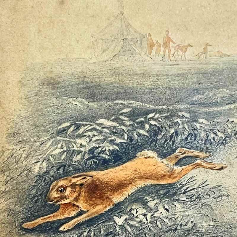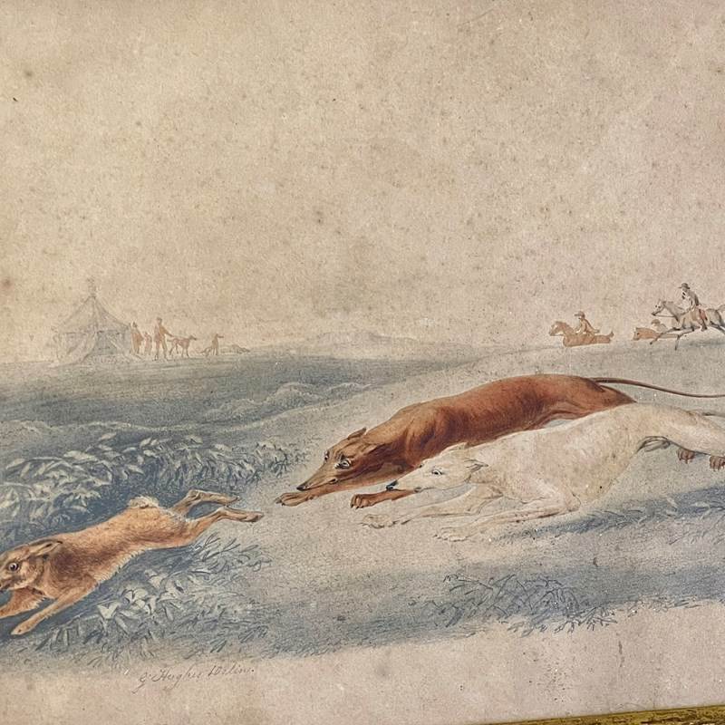 This beautifully executed sporting watercolour captures a dynamic scene of two sighthounds in full chase of a hare, with riders on horseback approaching a gathering of gentlemen and their racing dogs in the distance.
