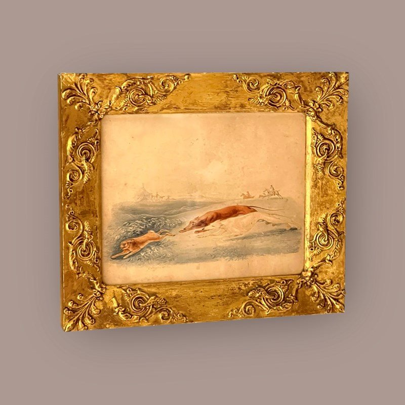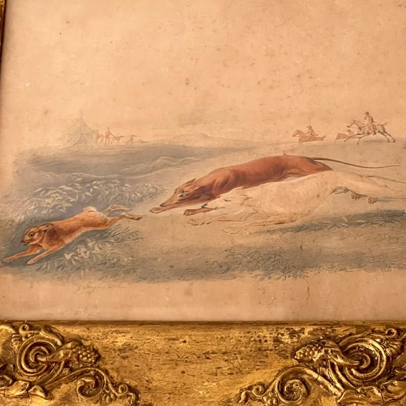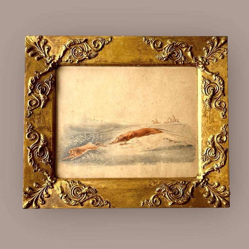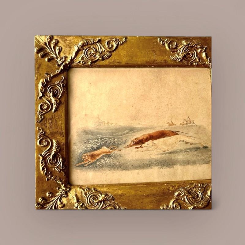 Coursing was a hugely popular country sport in the 19th century, and this artwork reflects the energy and tradition of the time. The piece is attractively presented in an antique giltwood and gesso frame, protected under glass.