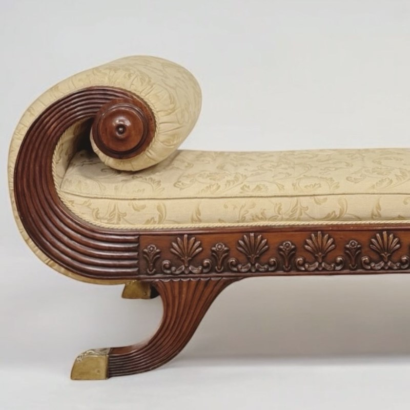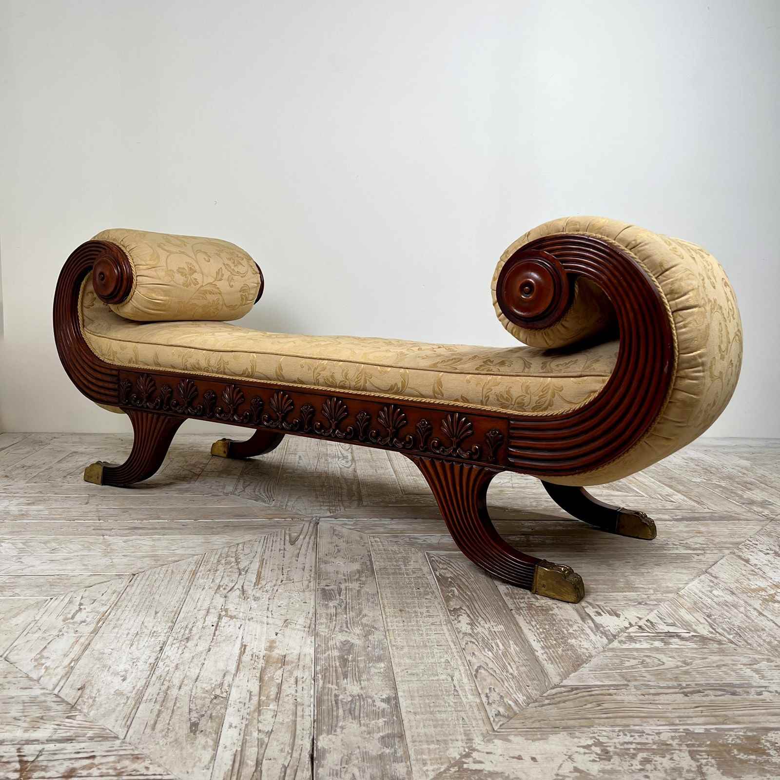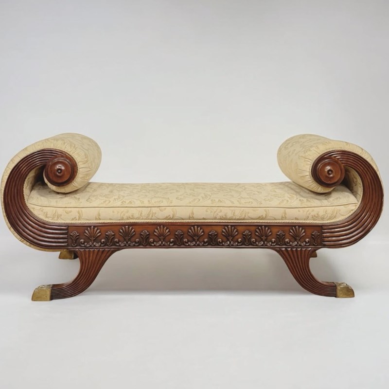 An elegant Regency-style window seat of refined proportions, beautifully crafted in rich mahogany. The piece features striking reeded scroll ends, each terminating in distinctive bulls-eye roundels, lending a sculptural and architectural presence.