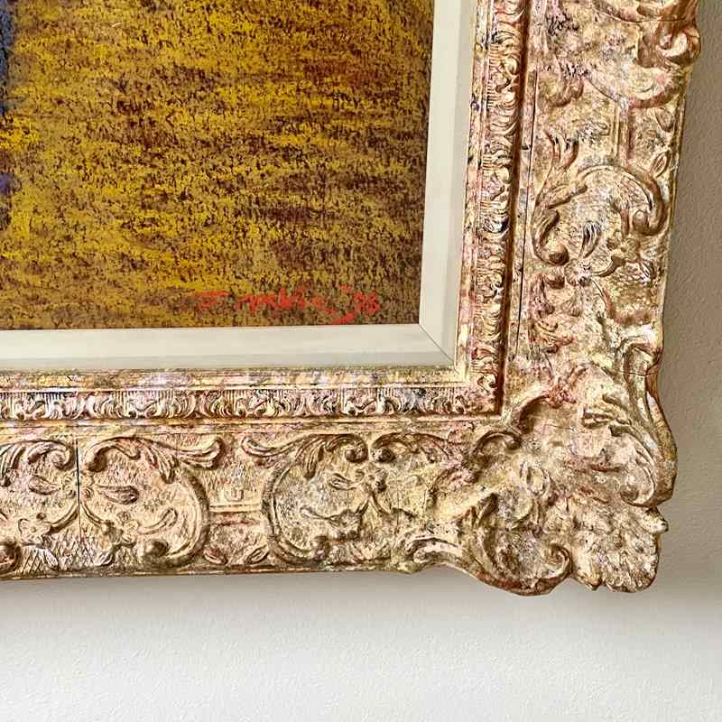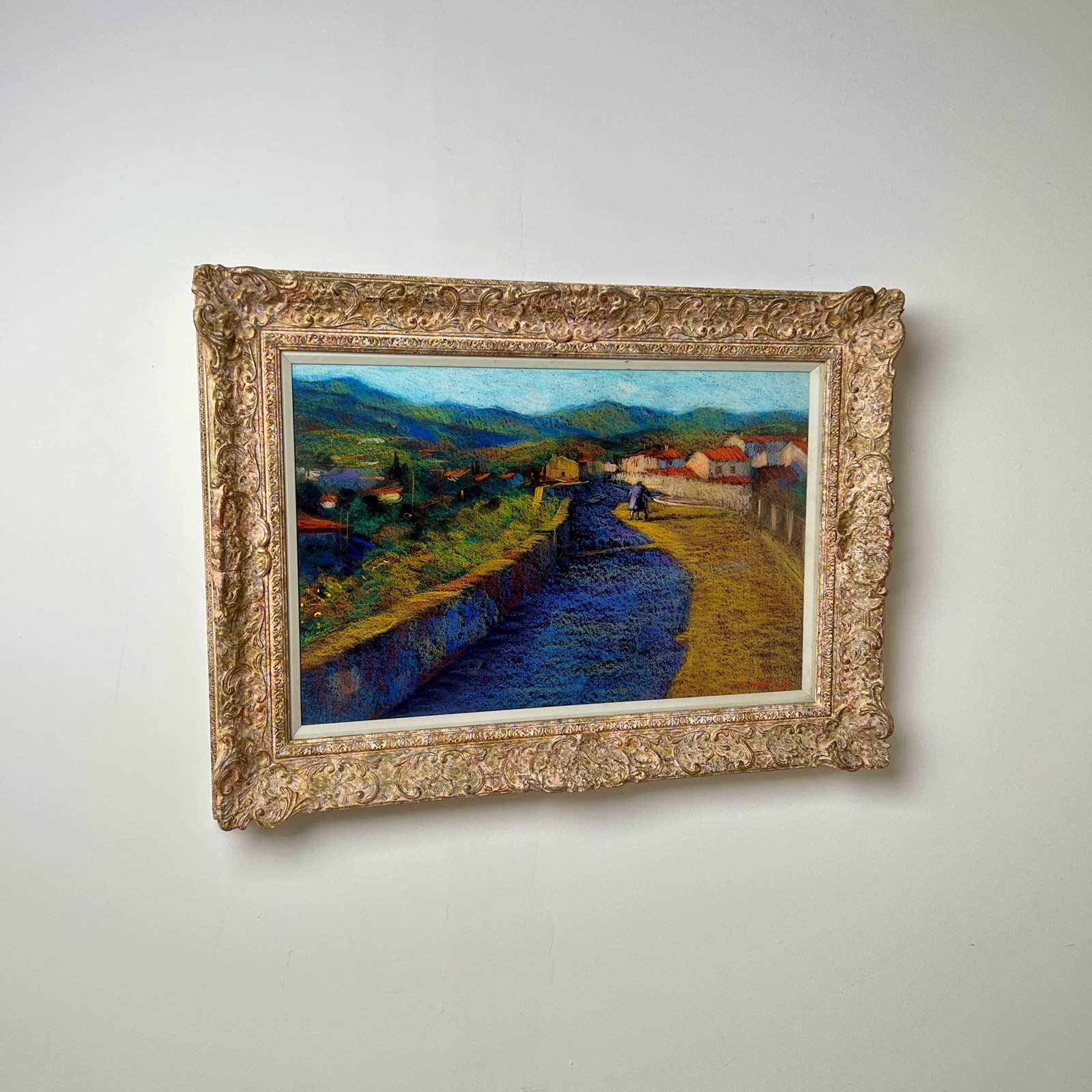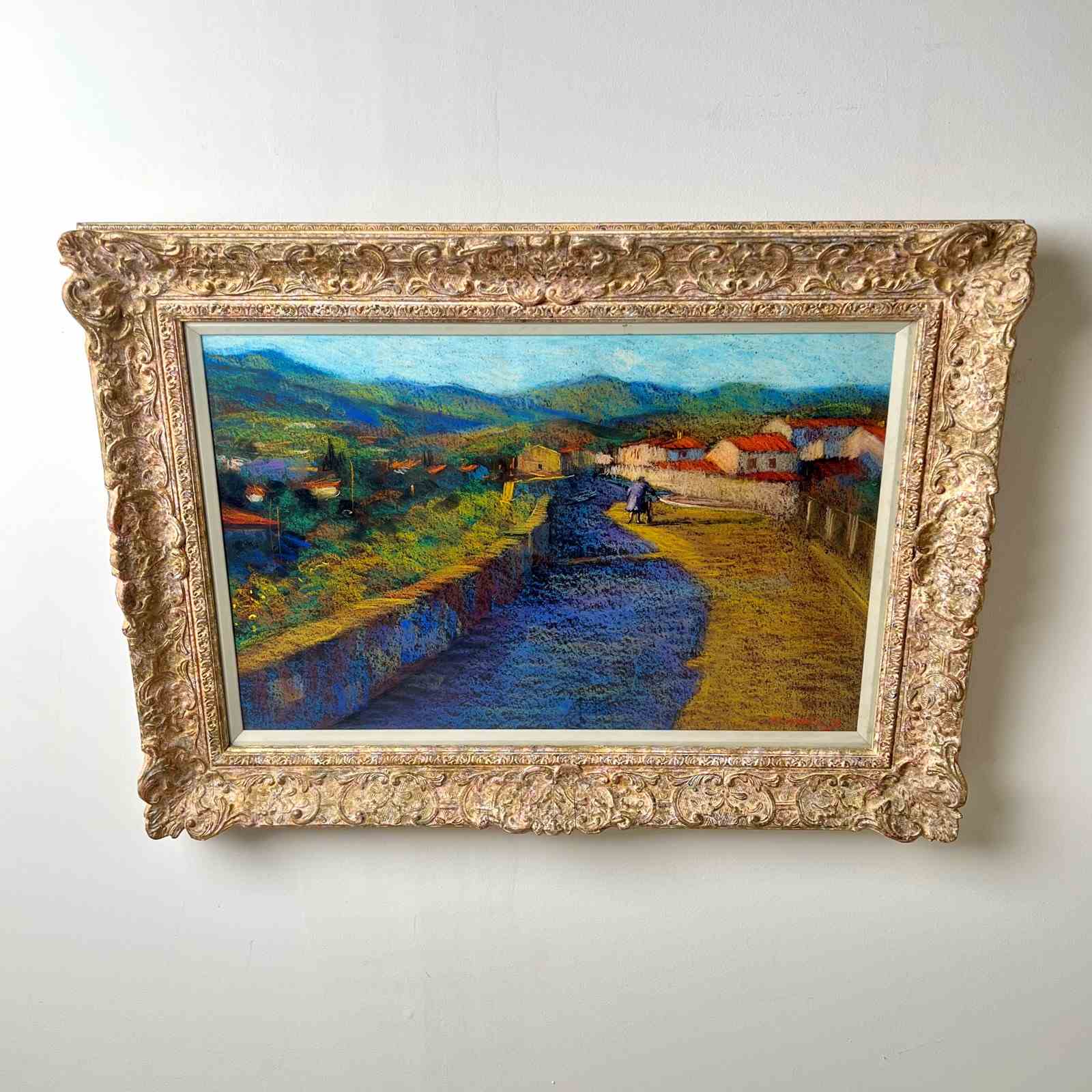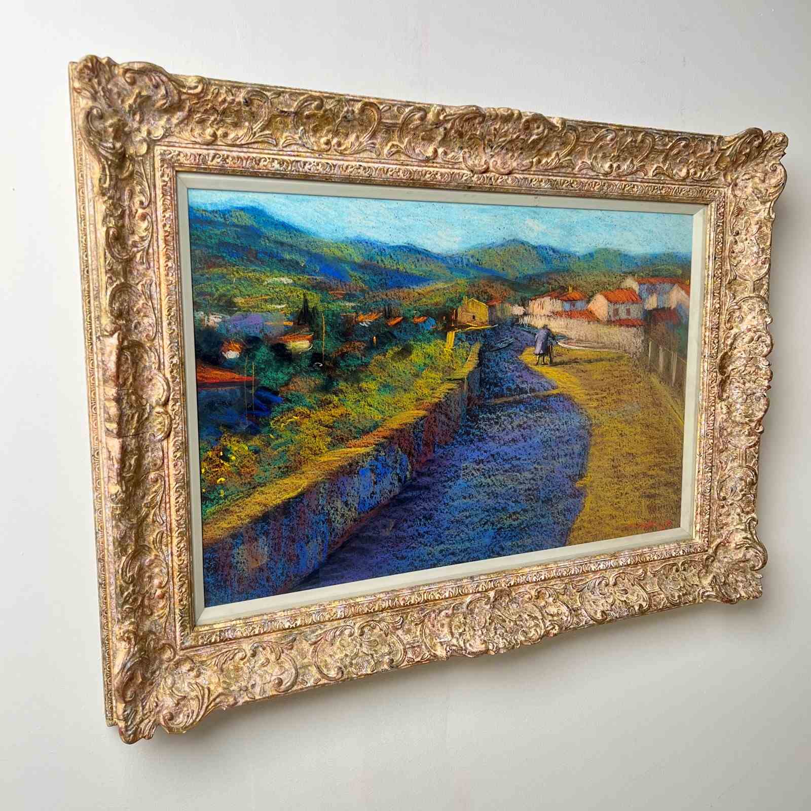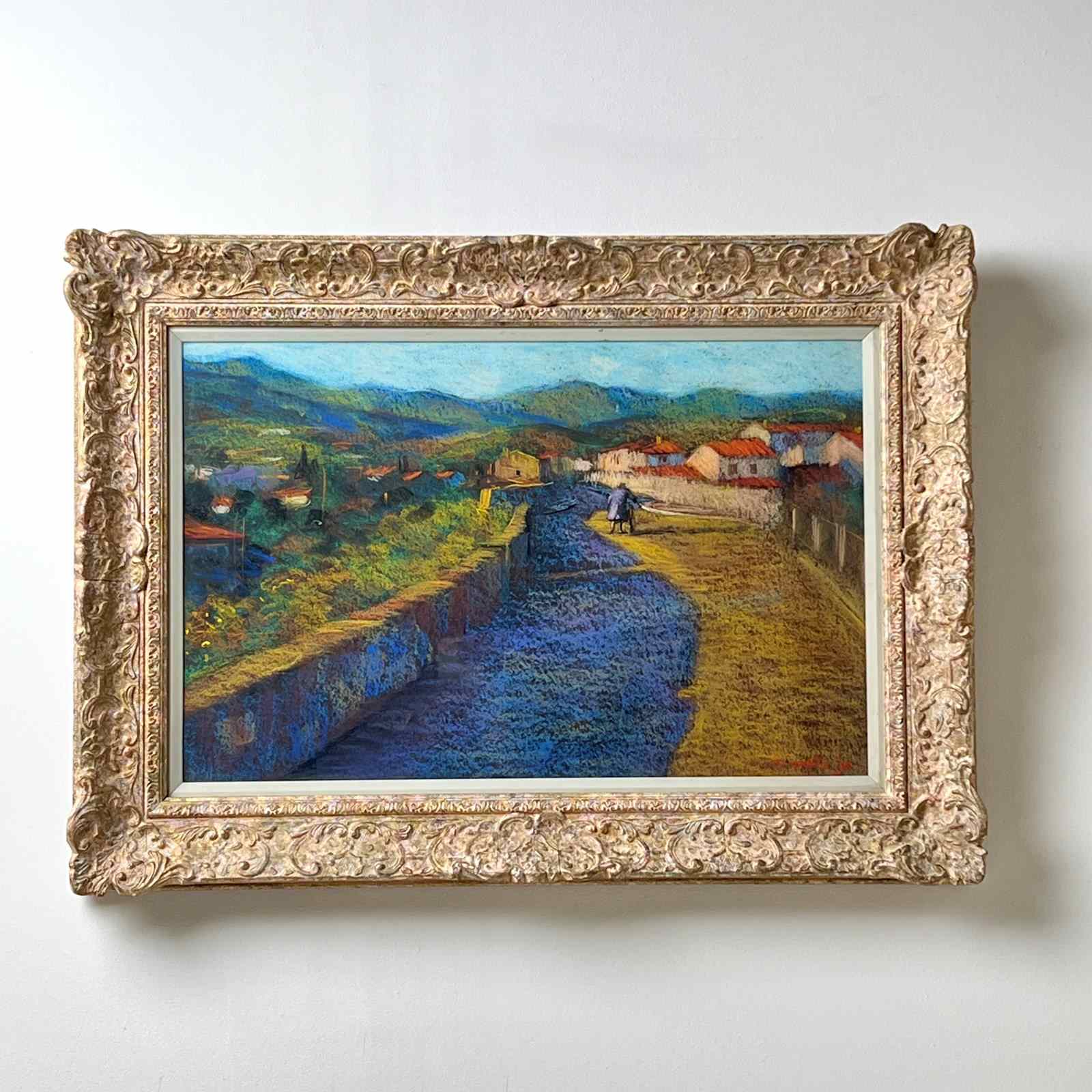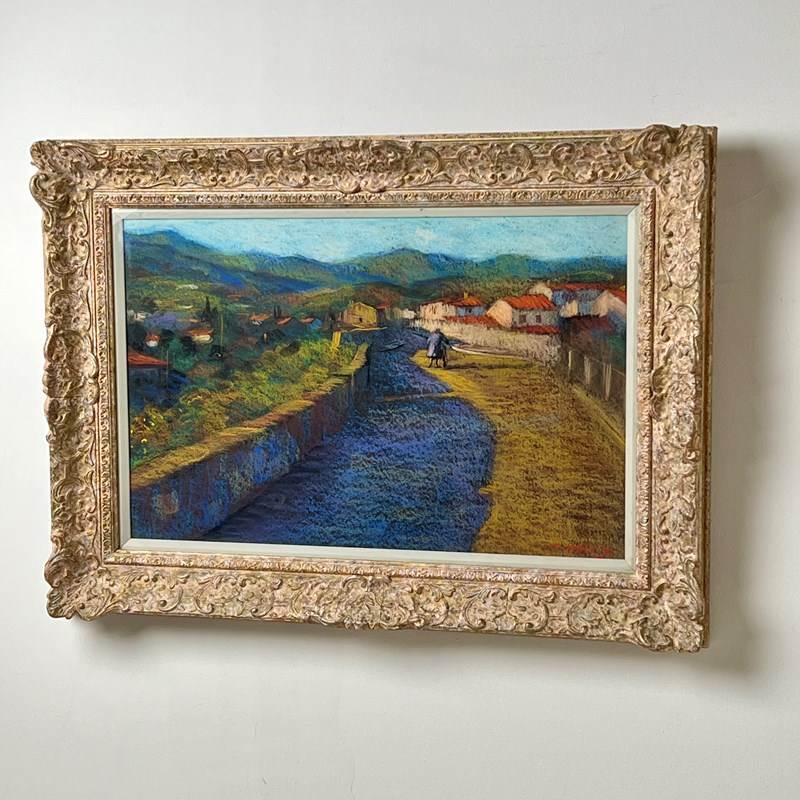 'Entrance to Ceret' a Pastel by John Mackie (Scottish Born 1953) One of the nicest artworks I’ve found in a while, a pastel by the Scottish artist John Mackie. A lovely landscape painting of Ceret which is in the Pyrénées-Orientales in southern France. Signed and dated 1993. Wonderful colours, depth and composition. Aperture measures: 56cm x 36cm It was whilst studying at the Glasgow school of art that he was first introduced to the works of Monet, Renoir and Pissarro. In particular the influence of Monet can be seen in his own painting style and his is an obvious love of impressionist work. Mackie gained the W H Shanks award for drawing in 1976 and later received a travelling scholarship from the Scottish Arts Council (1976/77) which he used to work for a short period in America and Canada. On his return he lived and painted in Italy and France where he was inspired by the landscape and cities around Tuscany, Umbria and Chianti. in France, he spent time in Paris where he discovered the wealth of material in the everyday scenes around cafés and bistros, especially around the districts beside Place du Tetre and The Champs Elysees. Mackie has exhibited widely in various galleries across the UK and in over 30 years has built a considerable body of collectors. he has exhibited successfully at the Royal Scottish Academy and also internationally in the USA, Germany, London, Ireland and elsewhere. Whether using oil or pastel he employs a fabulously rich palette, with works full of colour and strong tones, and a fine eye for composition and structure. His work exudes quality, with his finished pieces simply transporting you to his chosen location, capture the heat of a French meadow, the hustle and bustle of a continental market square or a balmy evening in the romantic cities of Venice or Paris.