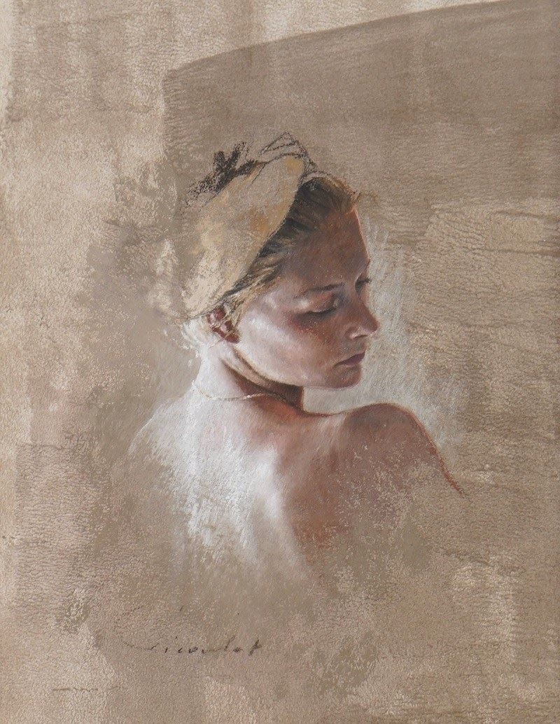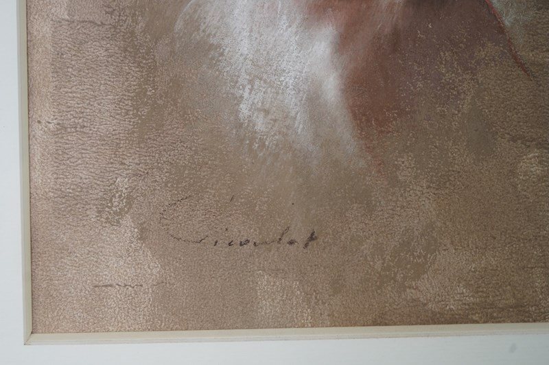 Executed in soft ochre, muted rose, and cool grey, the richly worked pastel integrates figure and background, while Picoulet’s sensitive modeling of light and shadow lends the face a sculptural presence.