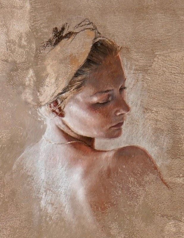 A refined pastel head-and-shoulders portrait by contemporary French artist Nathalie Picoulet, depicting a young woman glancing over her right shoulder. The sitter’s headband and subtle turn of the gaze imbue the composition with quiet elegance and introspective poise.