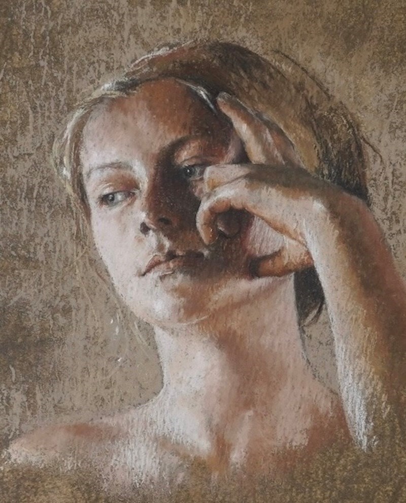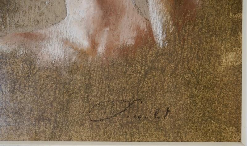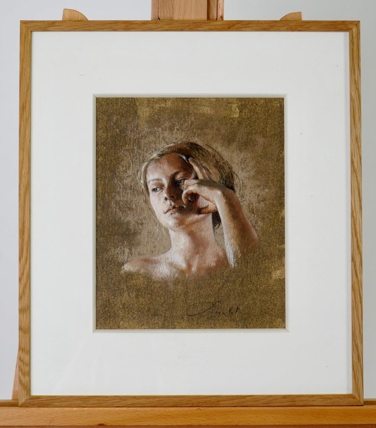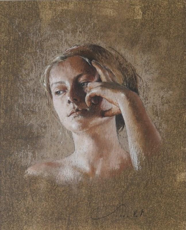 Executed in soft, earthy tones of warm ochre, muted rose, and cool grey, the pastel surface is richly worked, allowing the textured background to merge harmoniously with the figure. Picoulet’s sensitive handling of light and shadow gives the face a sculptural quality, while the delicate rendering of the hand adds both elegance and expressive tension to the composition.