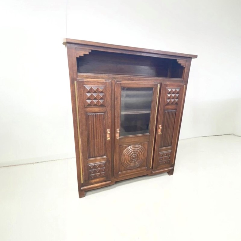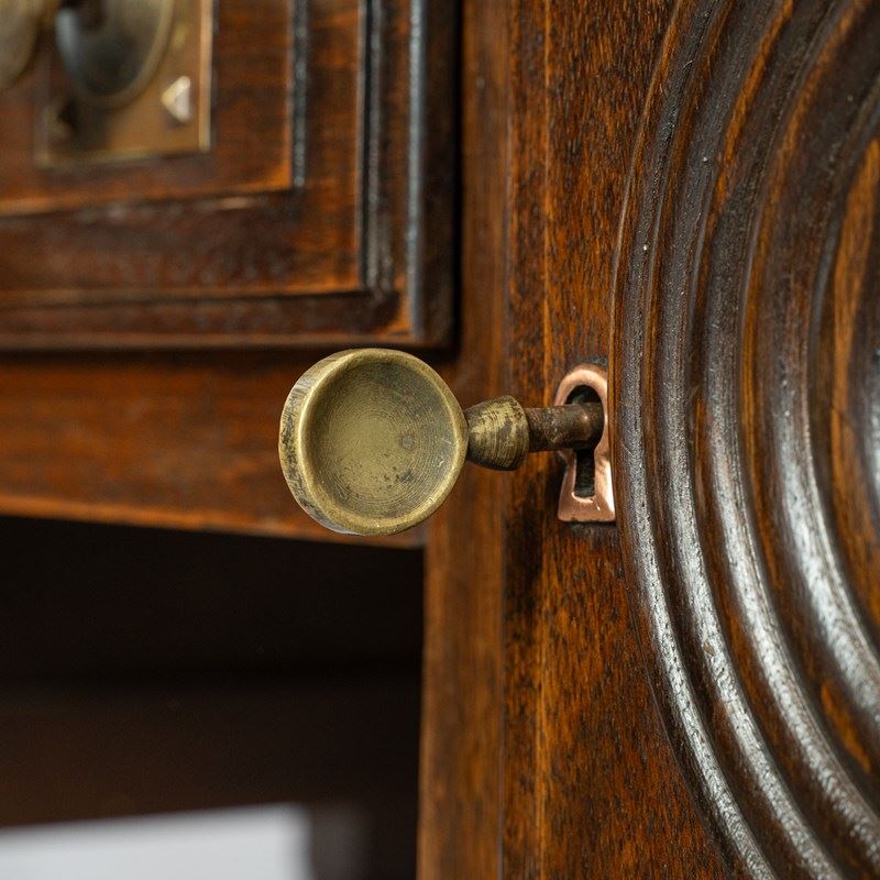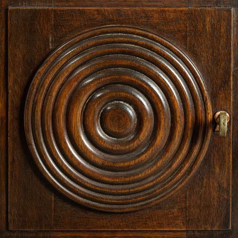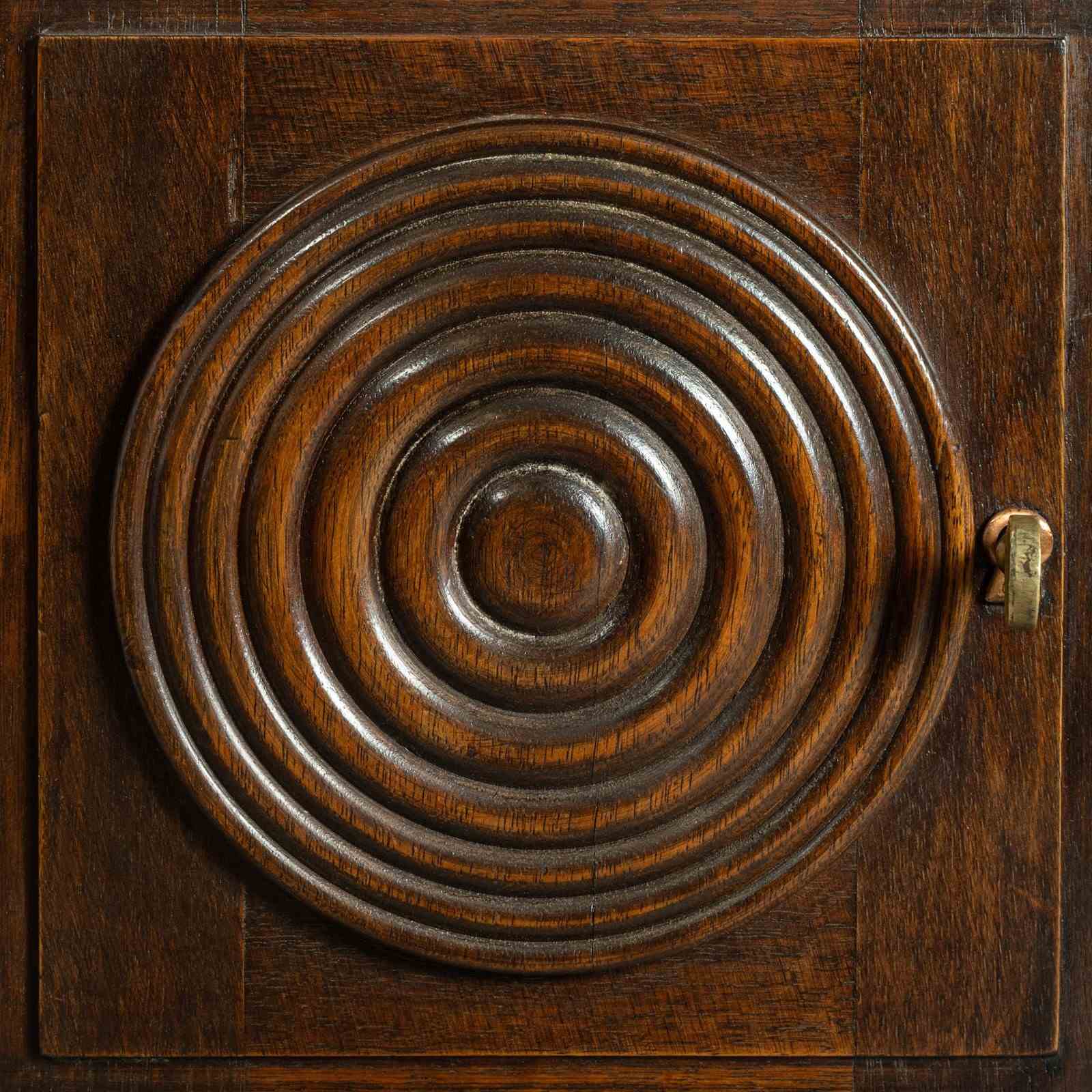 Beautifully constructed in richly toned hardwood, the desk showcases several hallmarks associated with Kohlmann’s aesthetic vocabulary. The cupboard doors are adorned with concentric carved rings, a sculptural motif that brings depth and rhythm to the exterior. The central drawer features a geometric lattice‑work panel featuring a repeating diamond or “X” pattern frequently seen in Kohlmann’s cabinetry and architectural commissions.