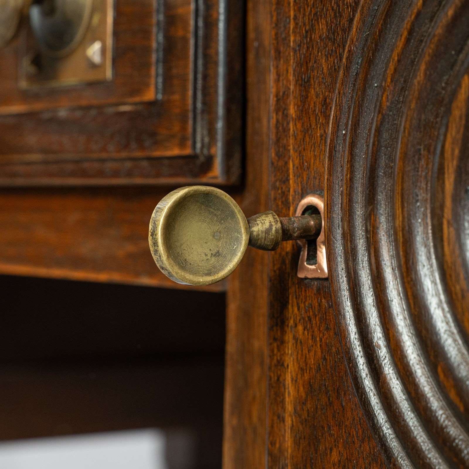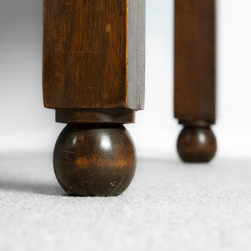 The desk’s ironmongery is particularly smart and distinctive, with original drawer pulls in a warm brass tone that complement the dark timber well. The desk stands on bold, architectural legs with fluted detailing at the knee, terminating in spherical feet. Original locks with keys present.